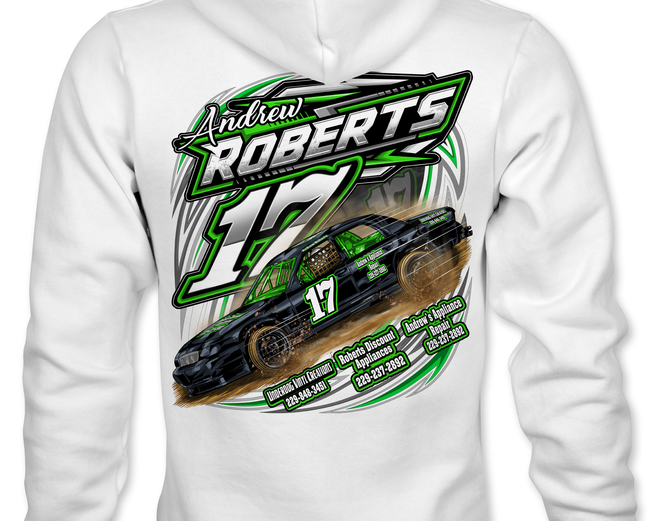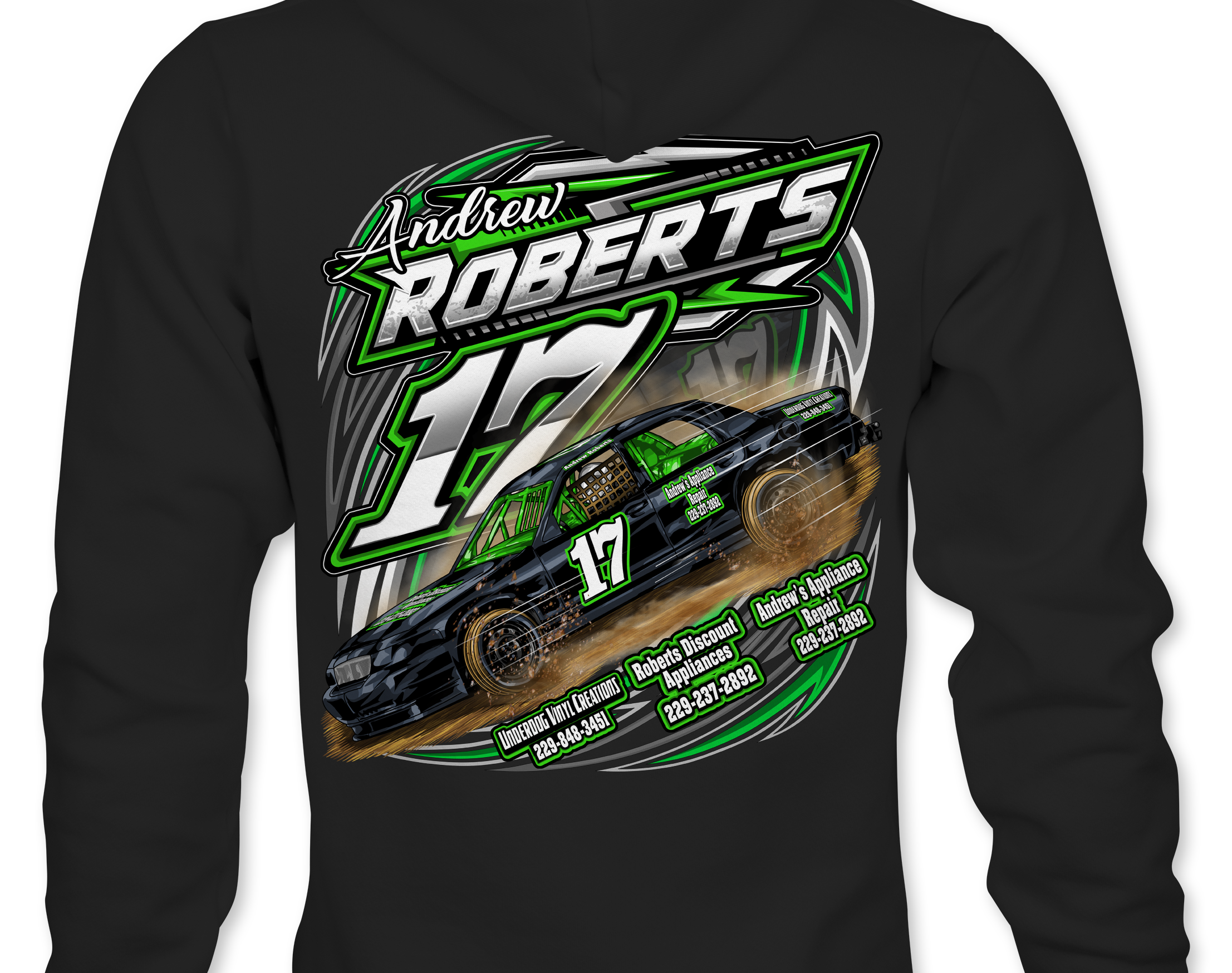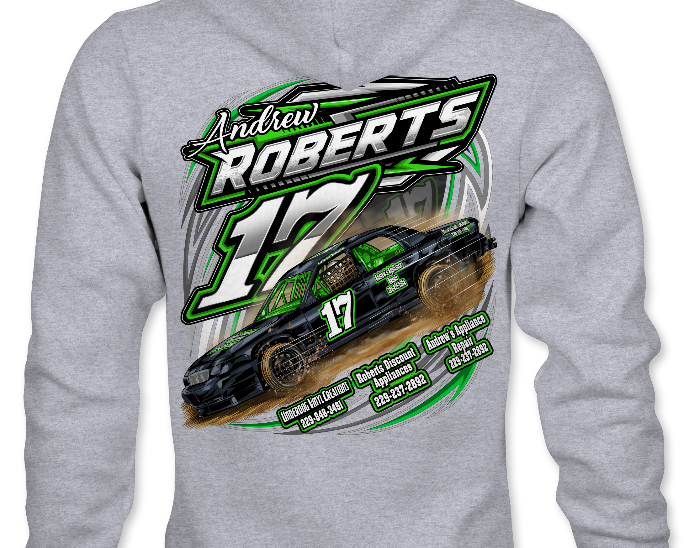 Support Andrew Roberts with their custom apparel! Available in Black, Sports Gray and White. Graphics are direct to garment printed with a left chest image and a full back image.
