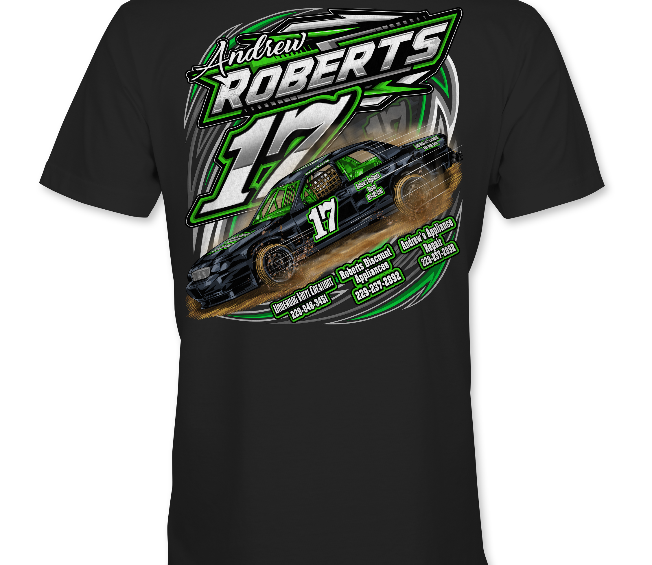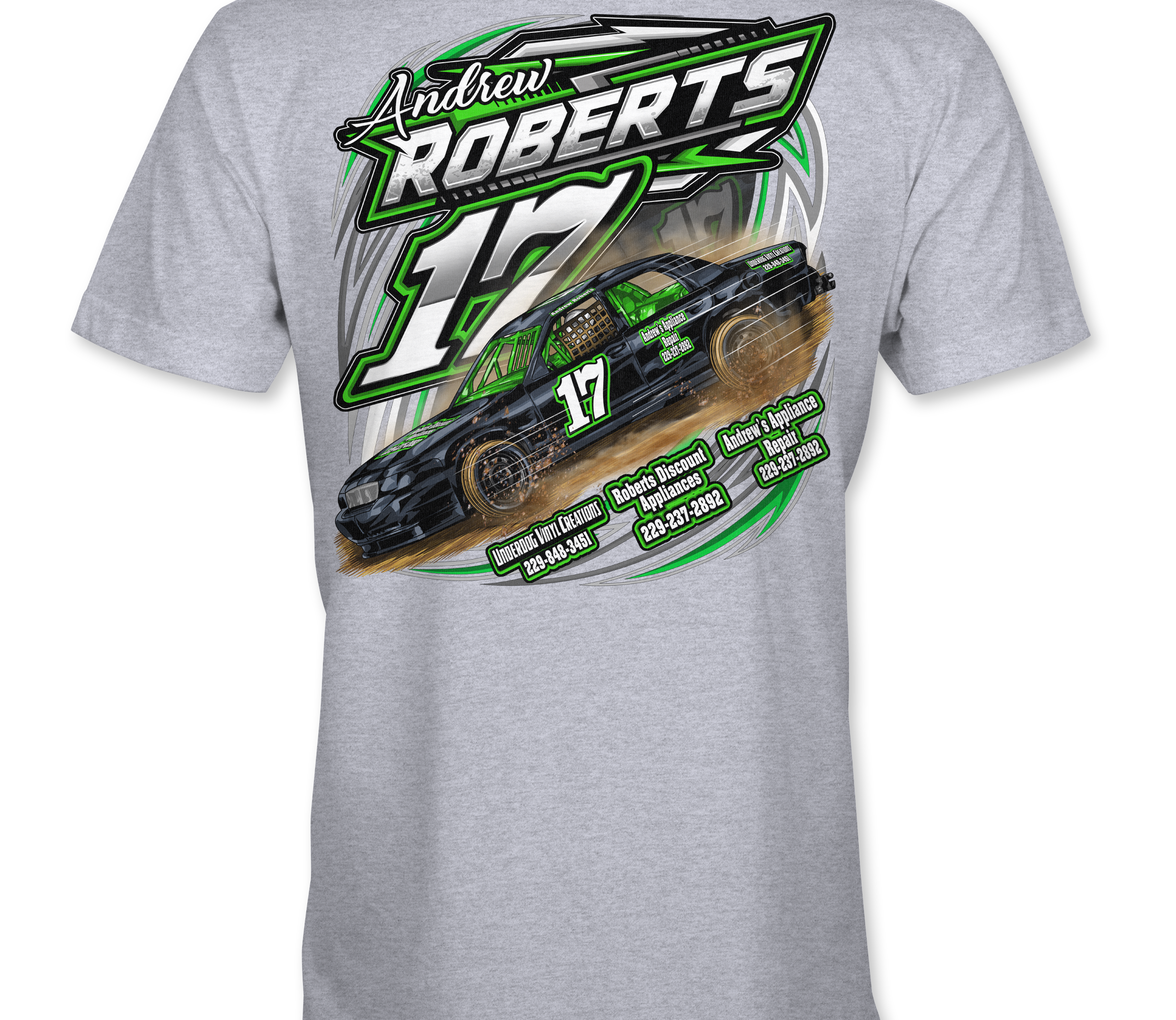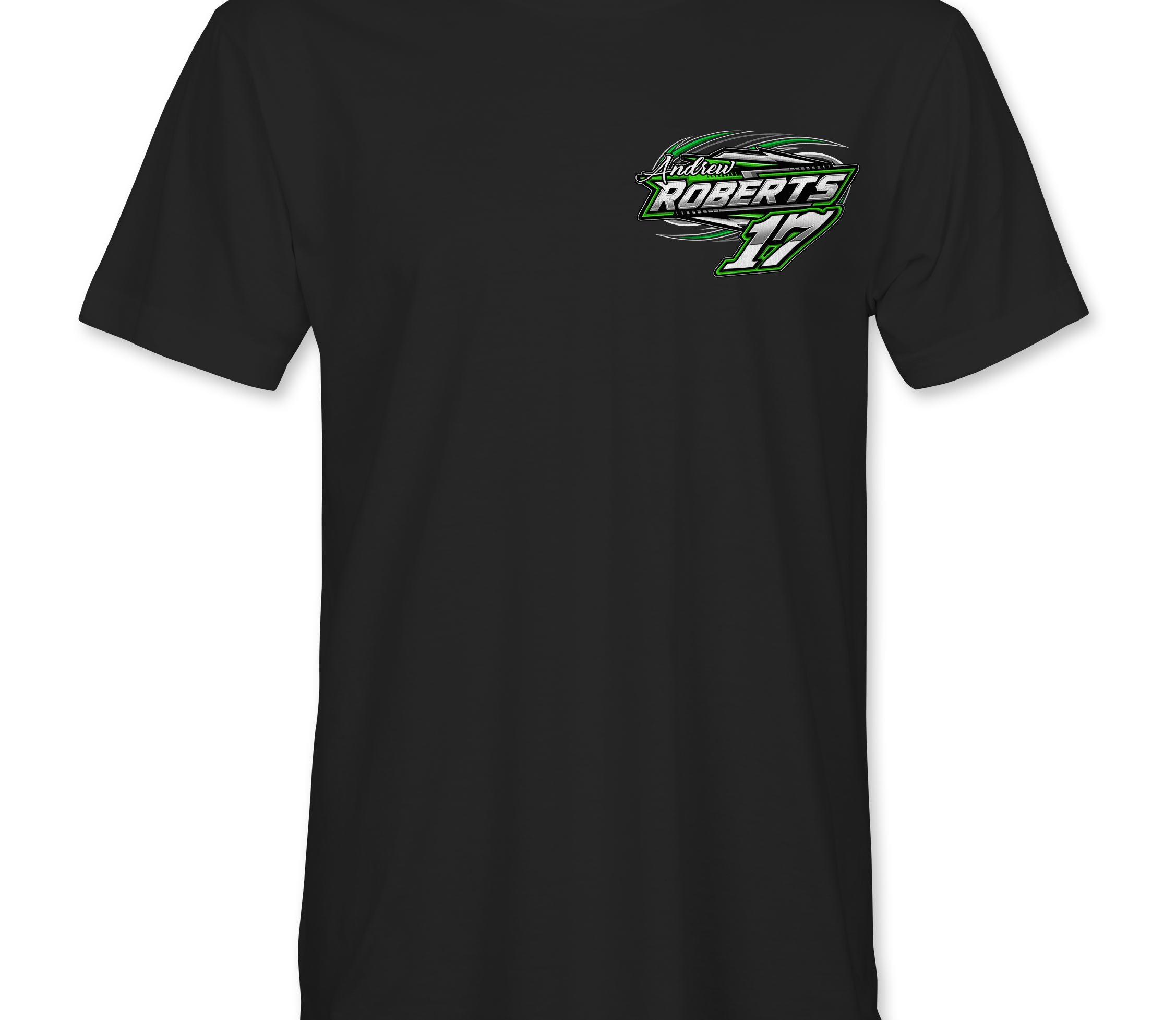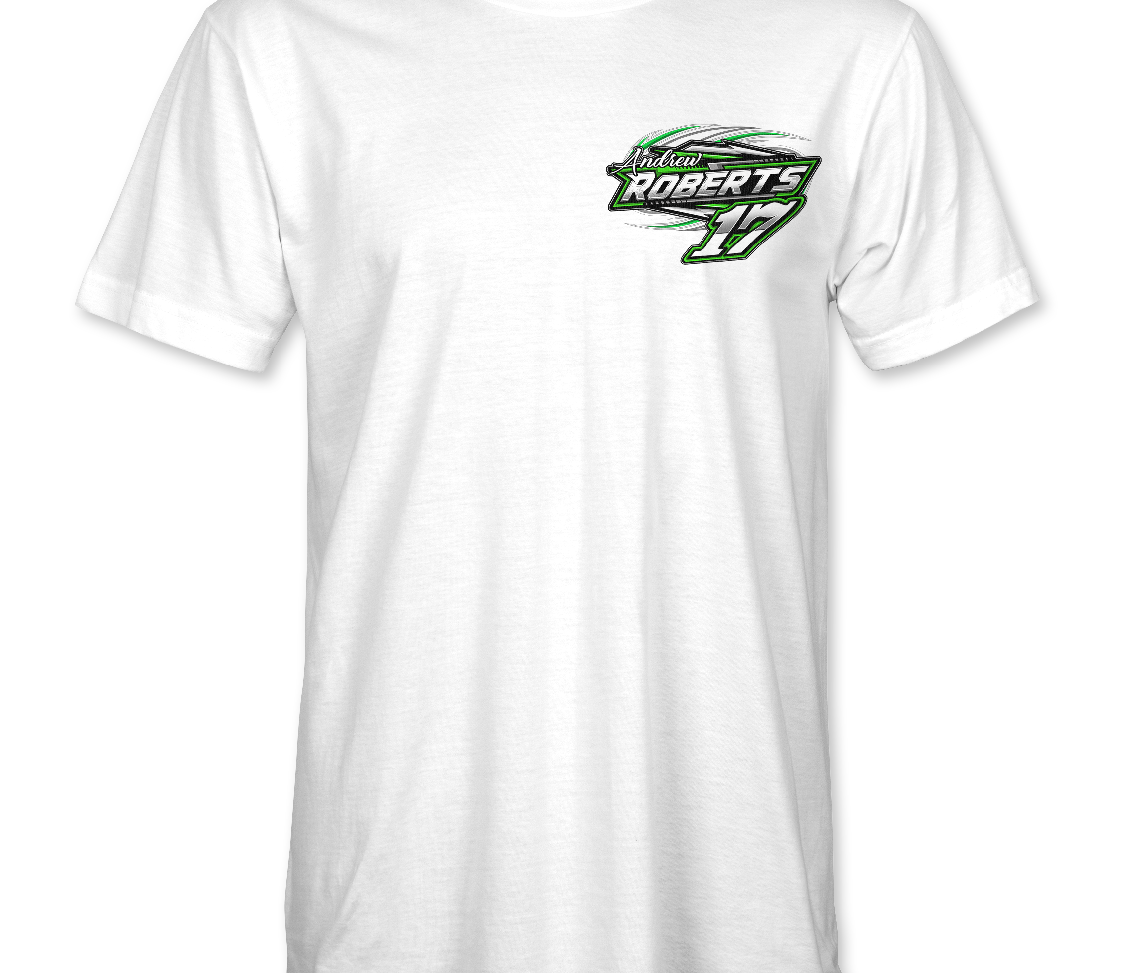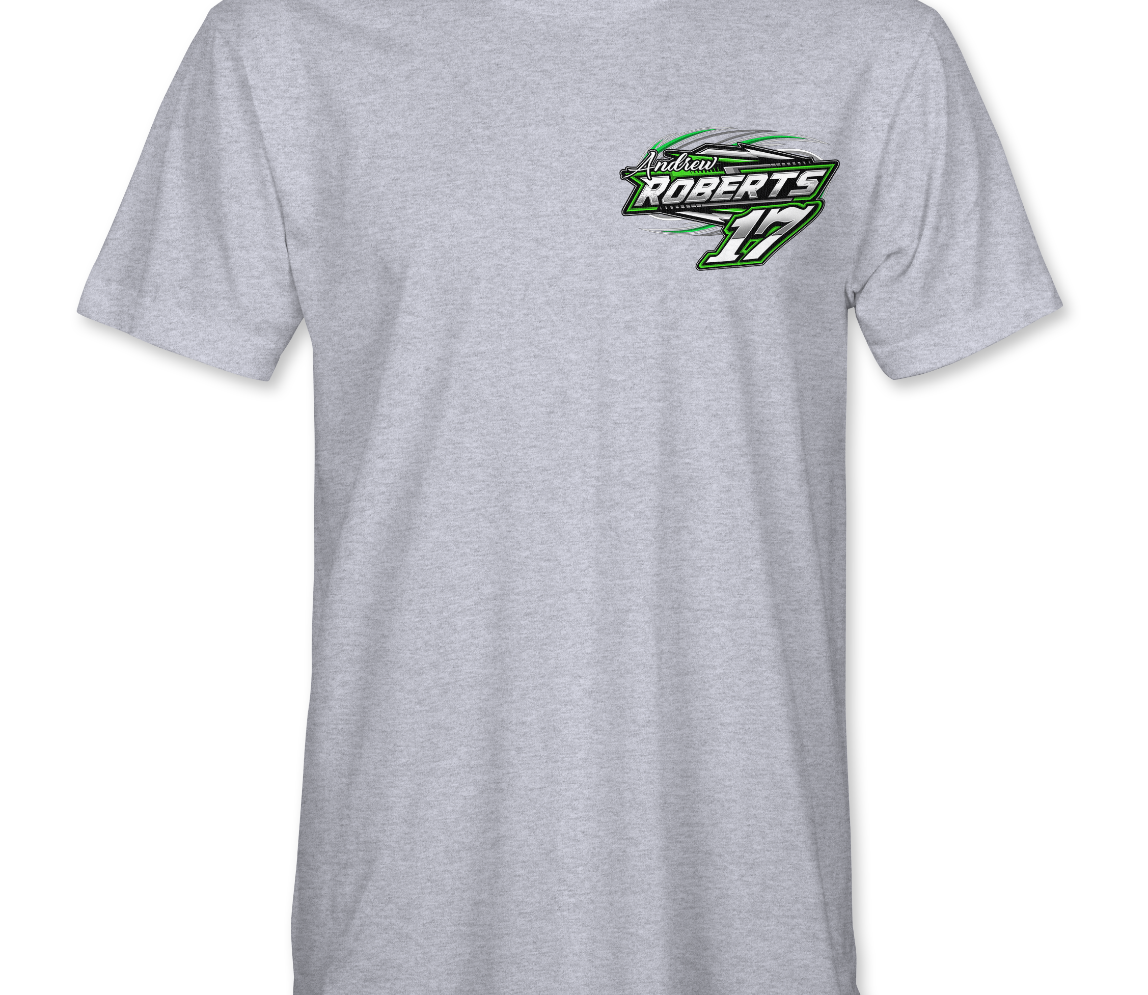 Support Andrew Roberts with their custom apparel! Available in Black, Sports Gray and White. Graphics are direct to garment printed with a left chest image and a full back image.