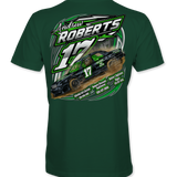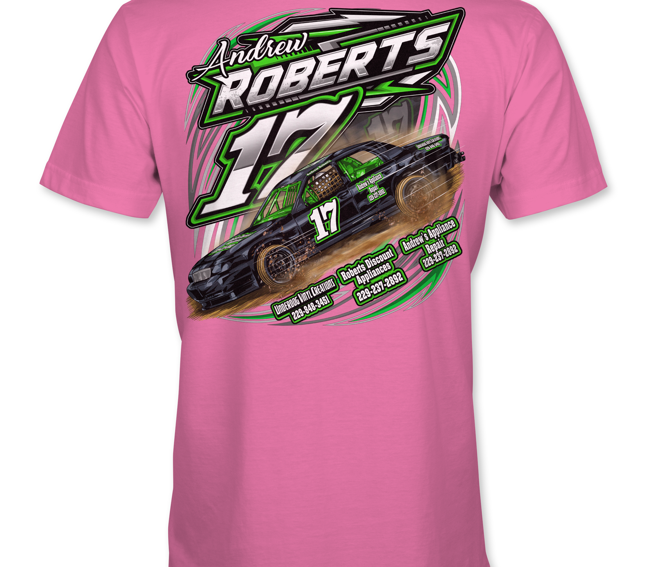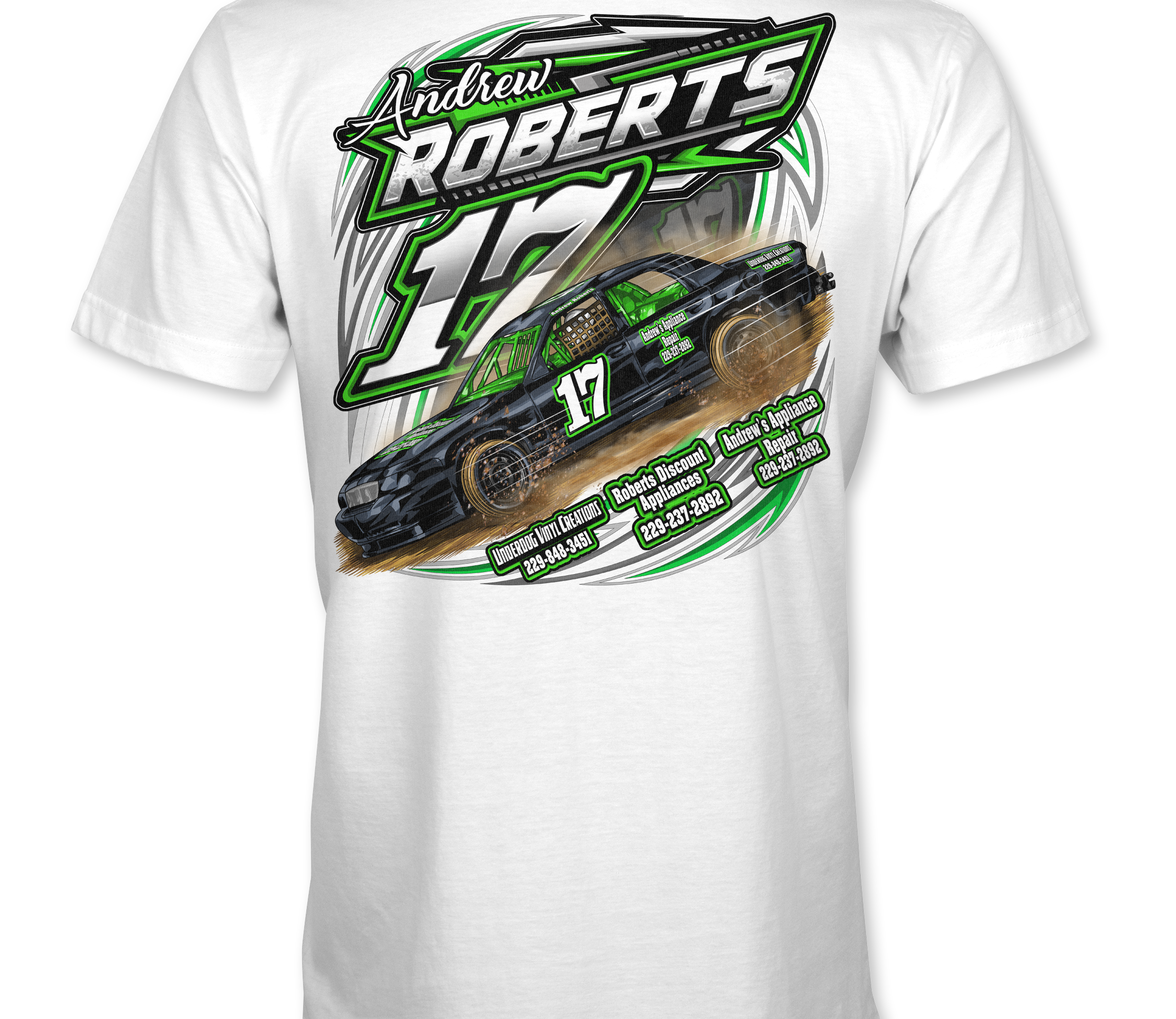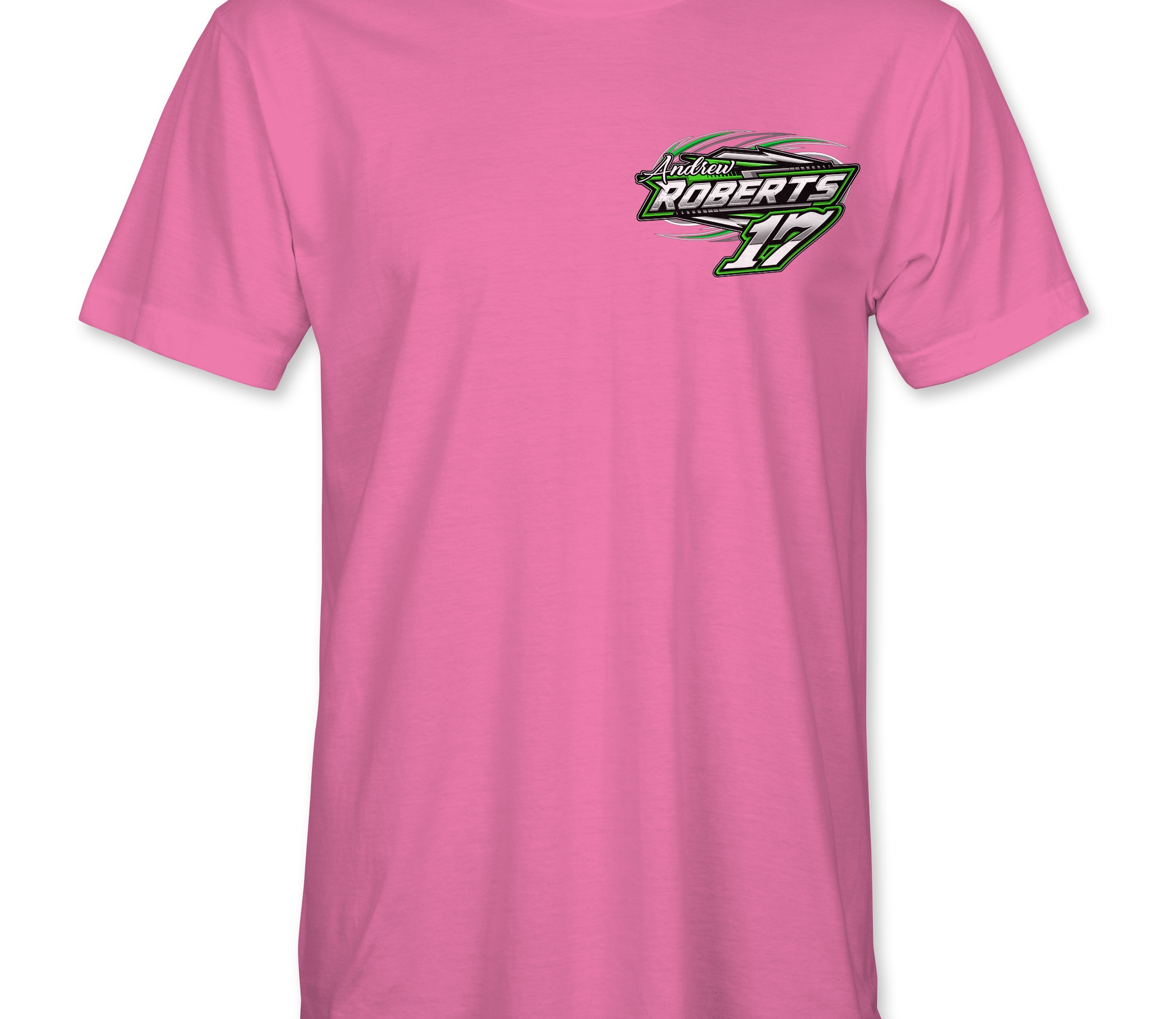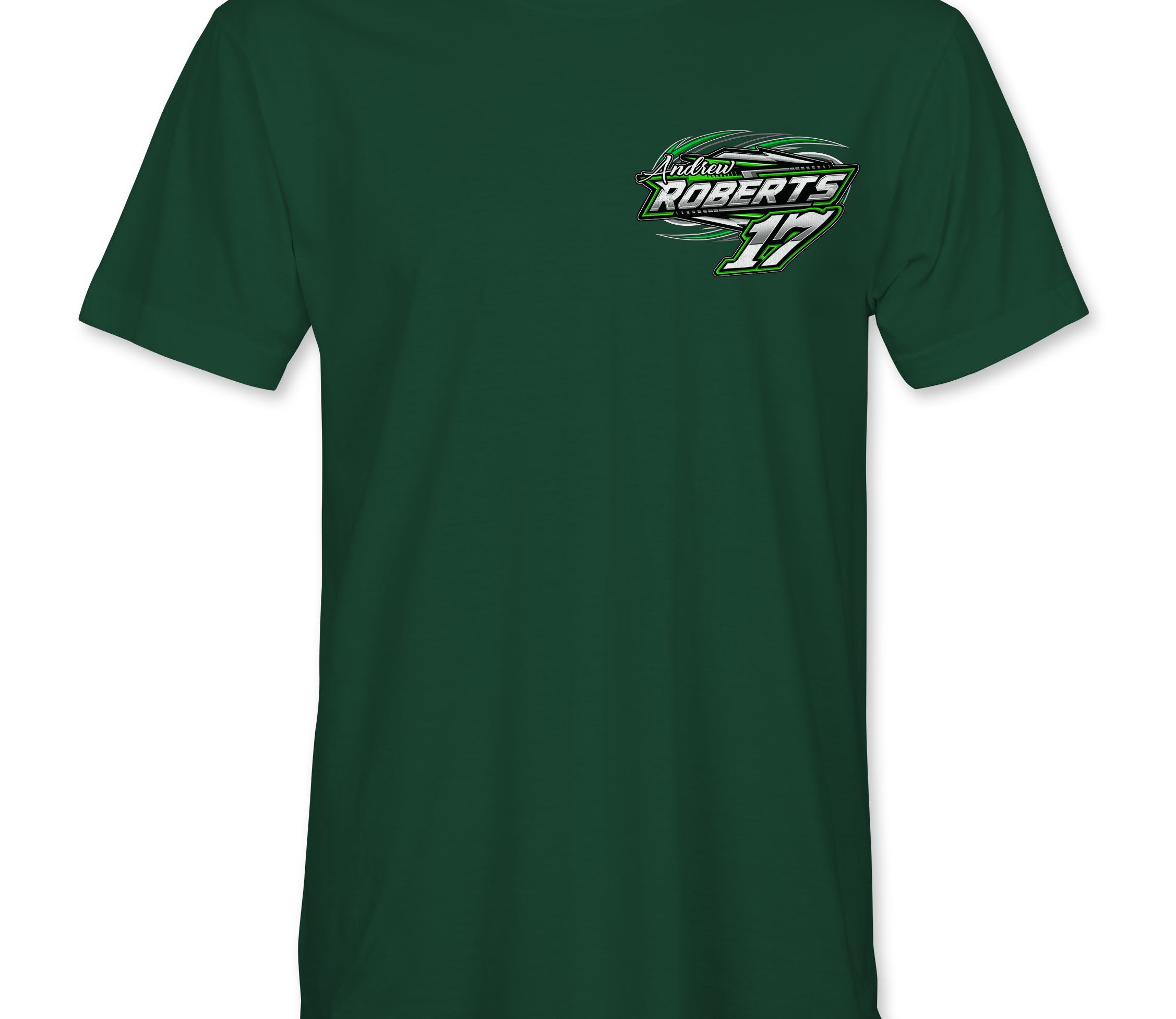 Support Andrew Roberts with their custom apparel! Available in Black, Sports Gray and White. Graphics are direct to garment printed with a left chest image and a full back image.