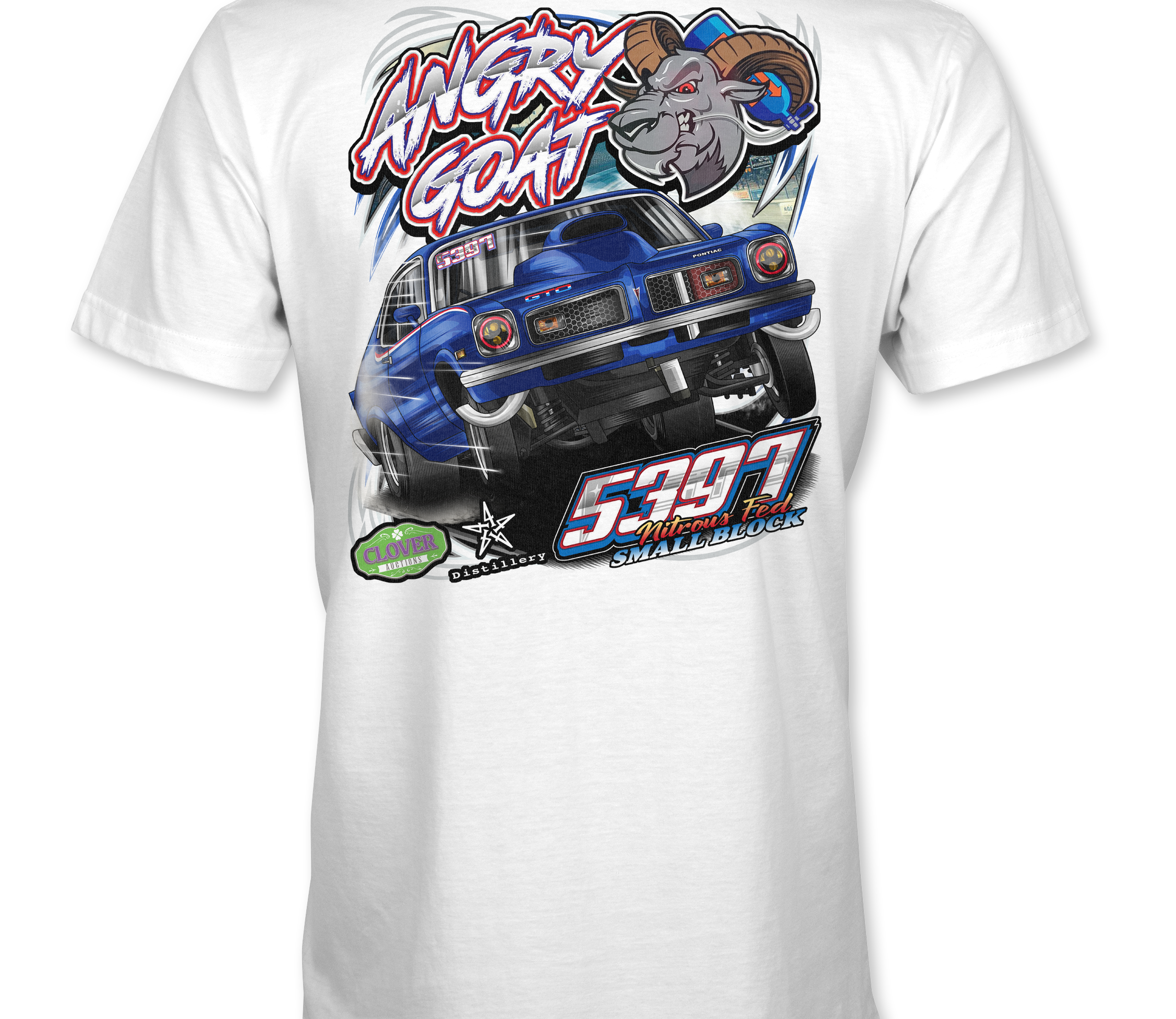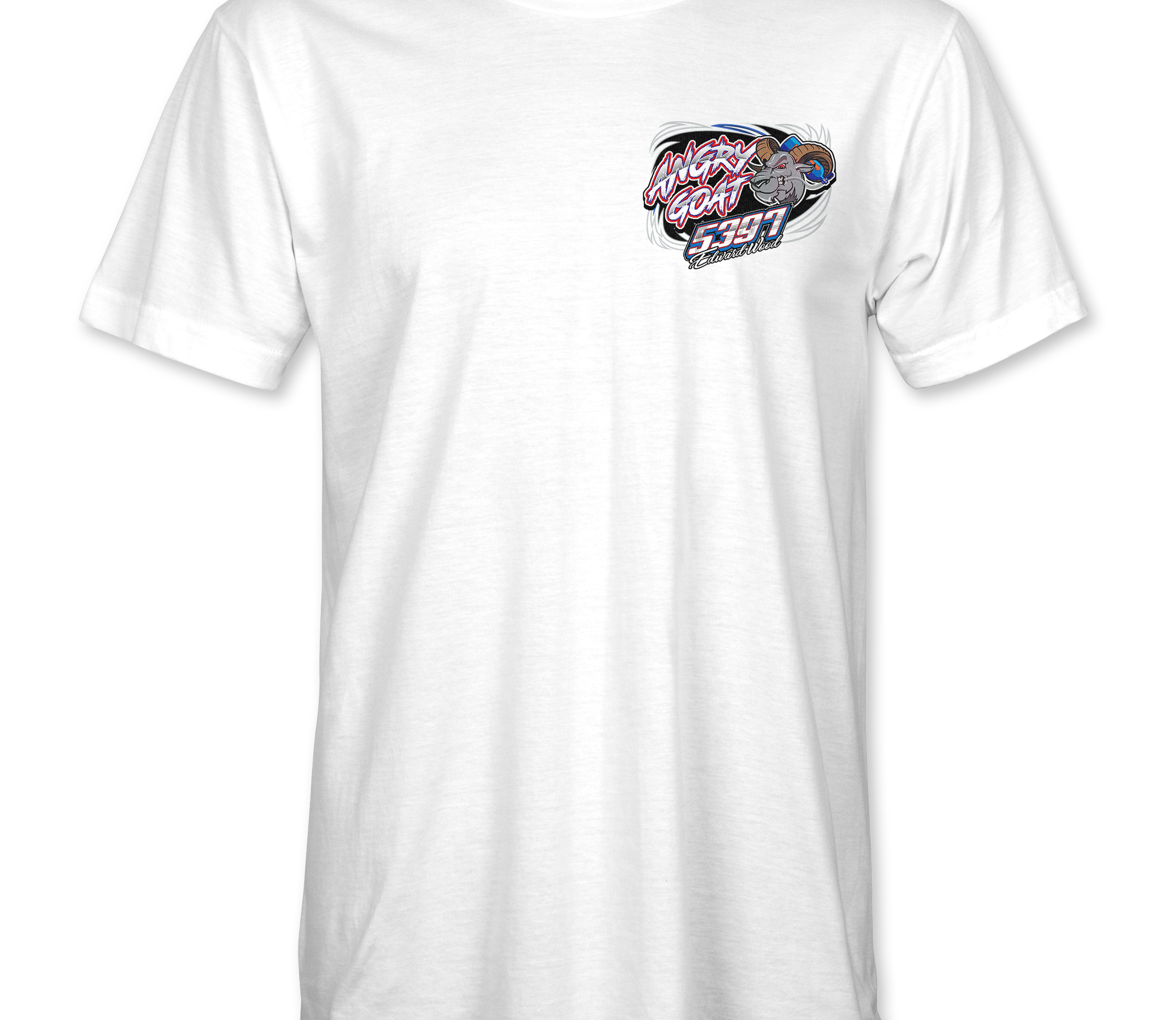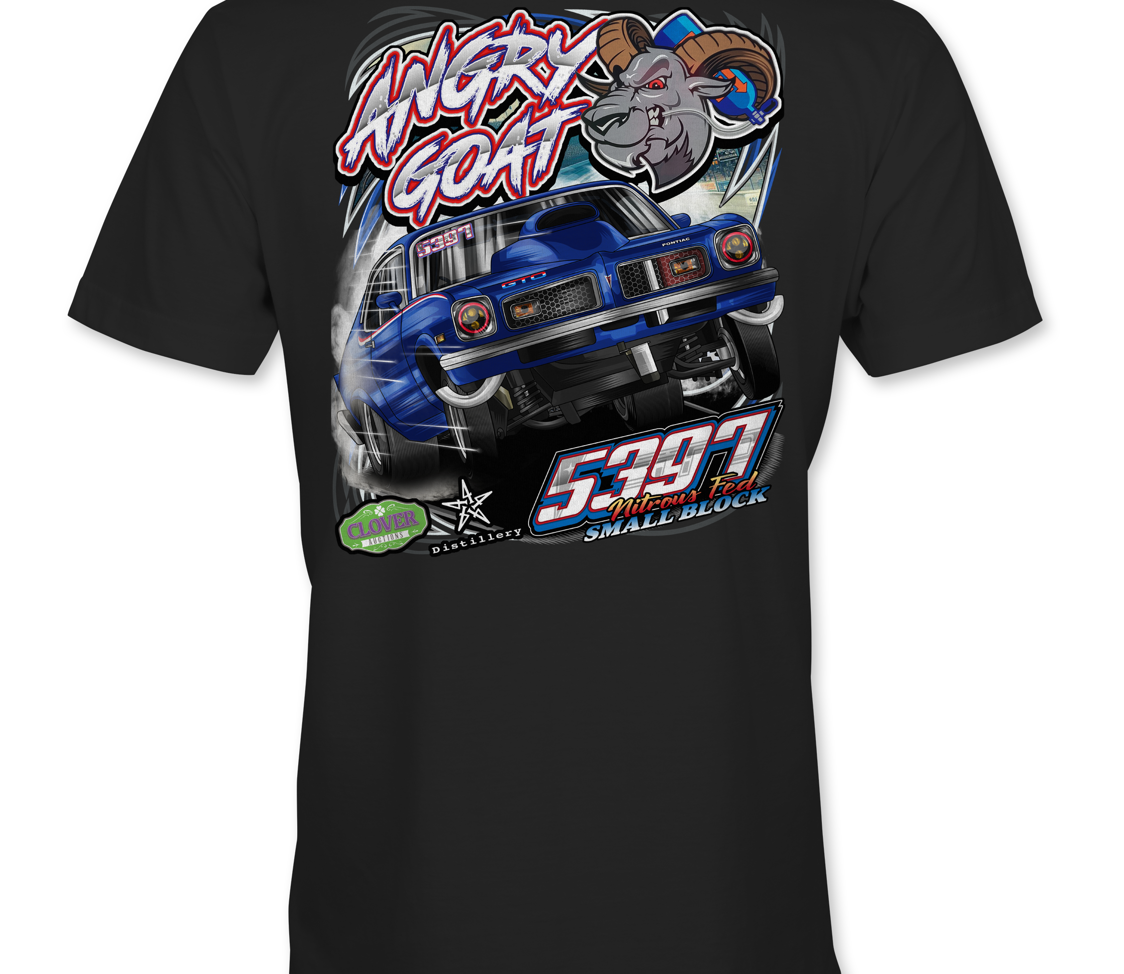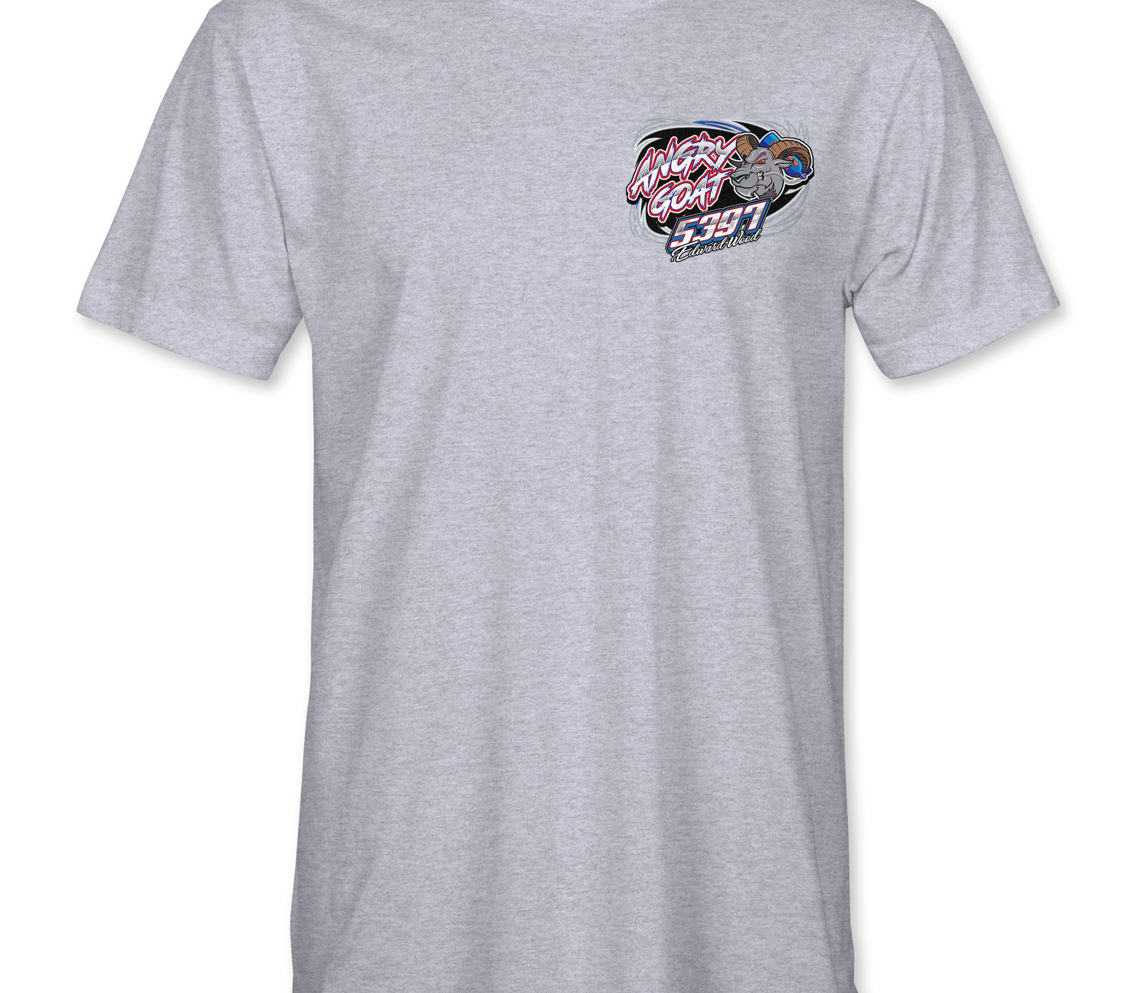 Support Angry Goat Racing 2025 - Day with their custom apparel! Available in Black, Sports Gray and White. Graphics are direct to garment printed with a left chest image and a full back image.