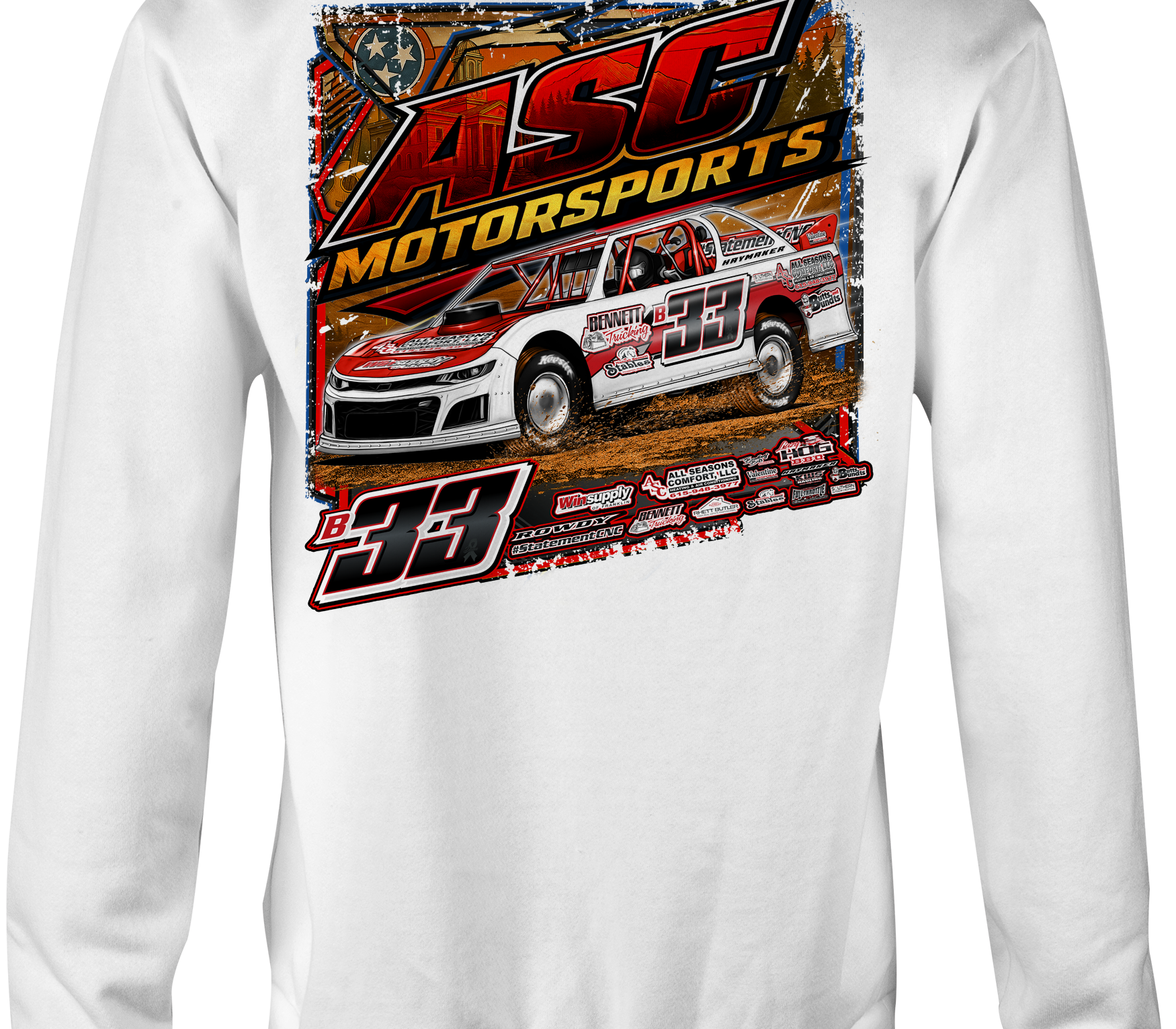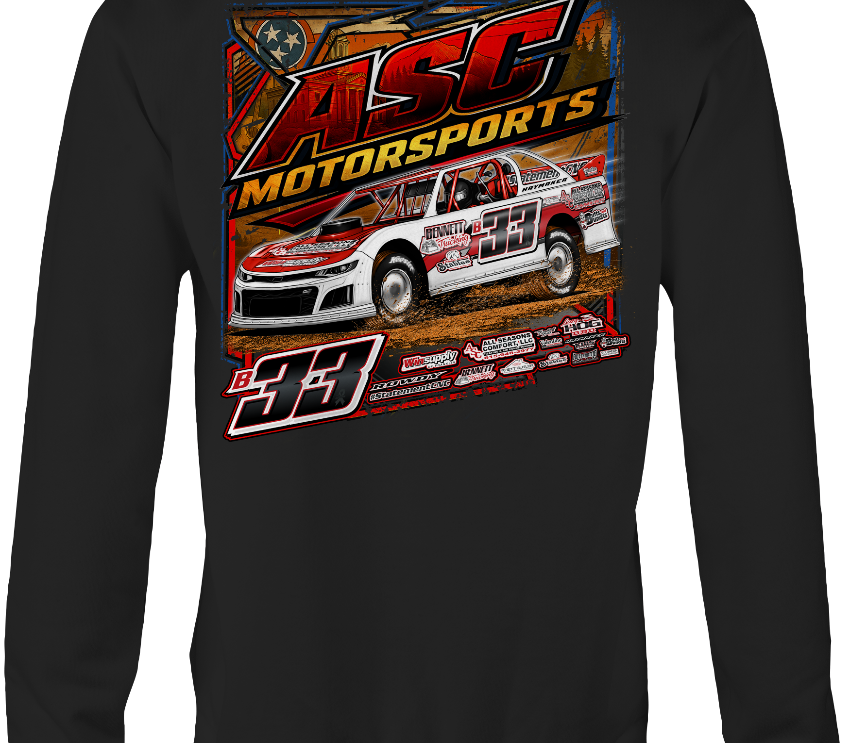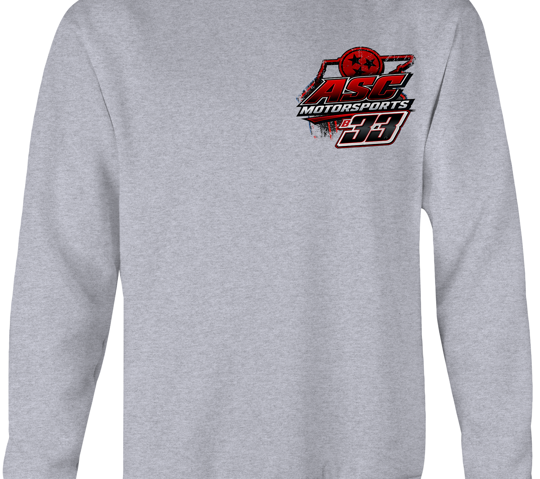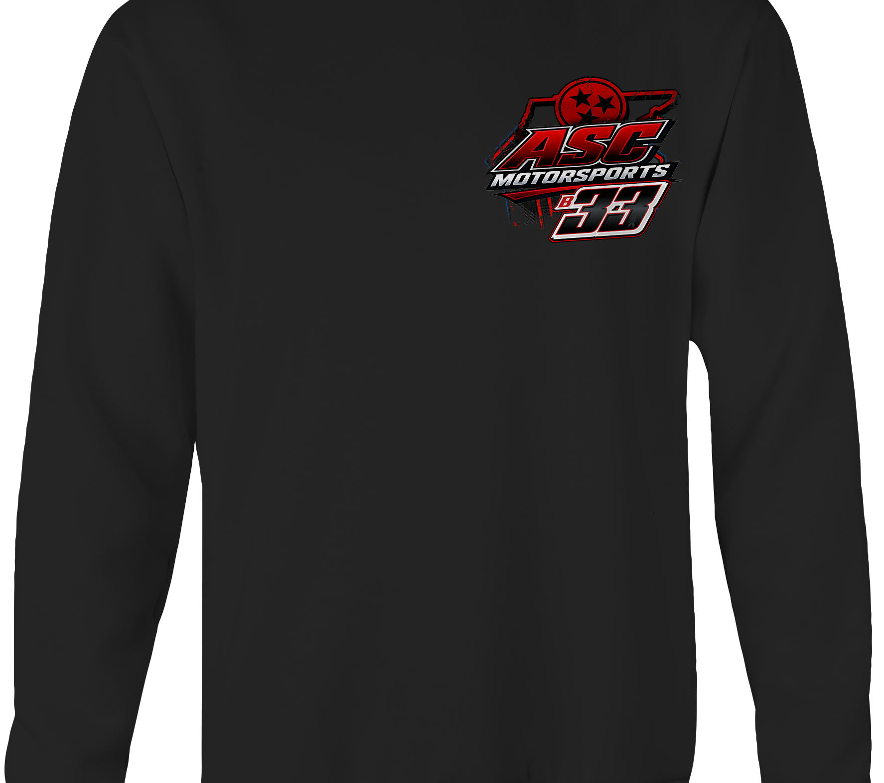 Support ASC Motorsports with their custom apparel!  Available in Black, Sports Gray and White. Graphics are direct to garment printed with a left chest image and a full back image.