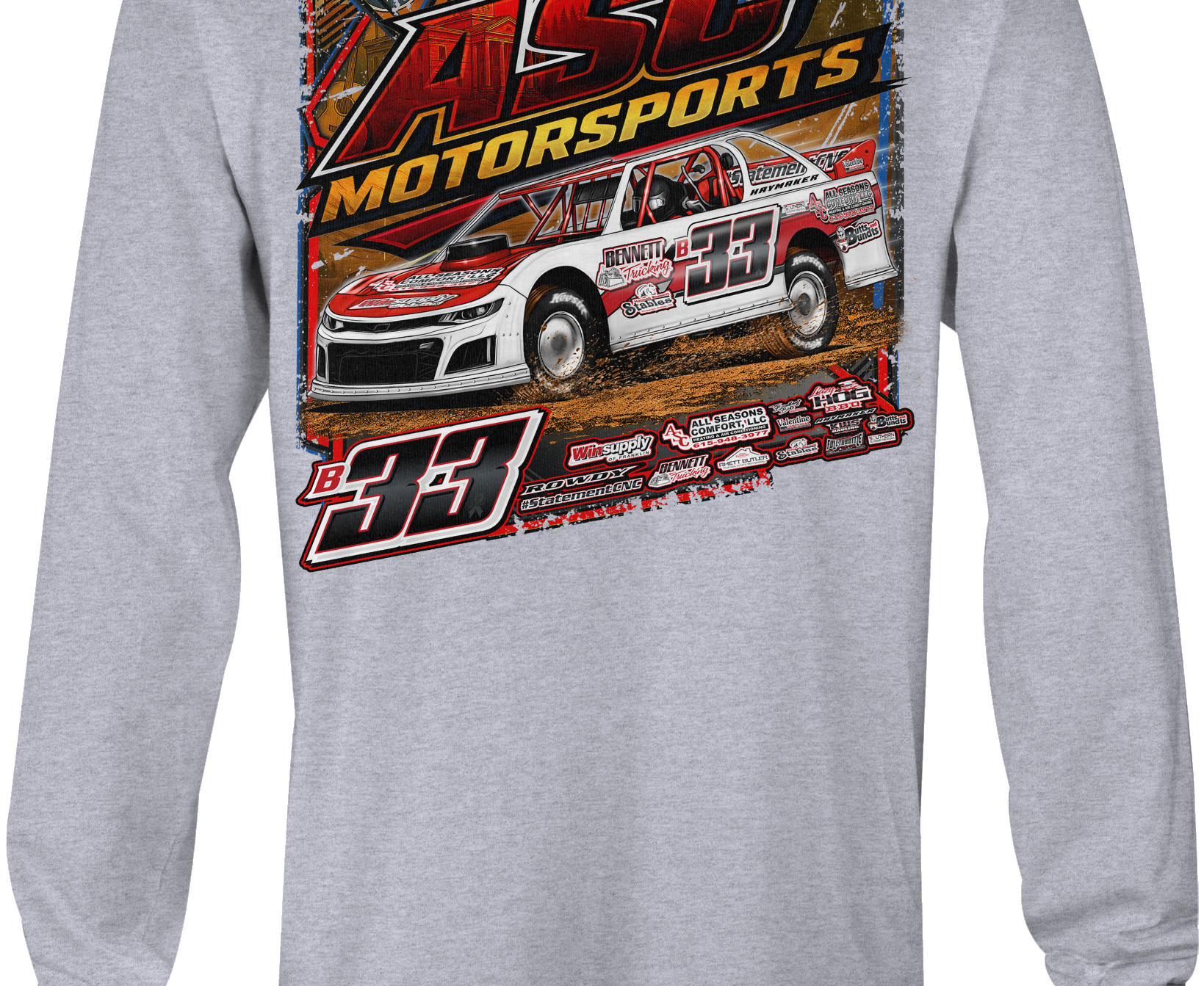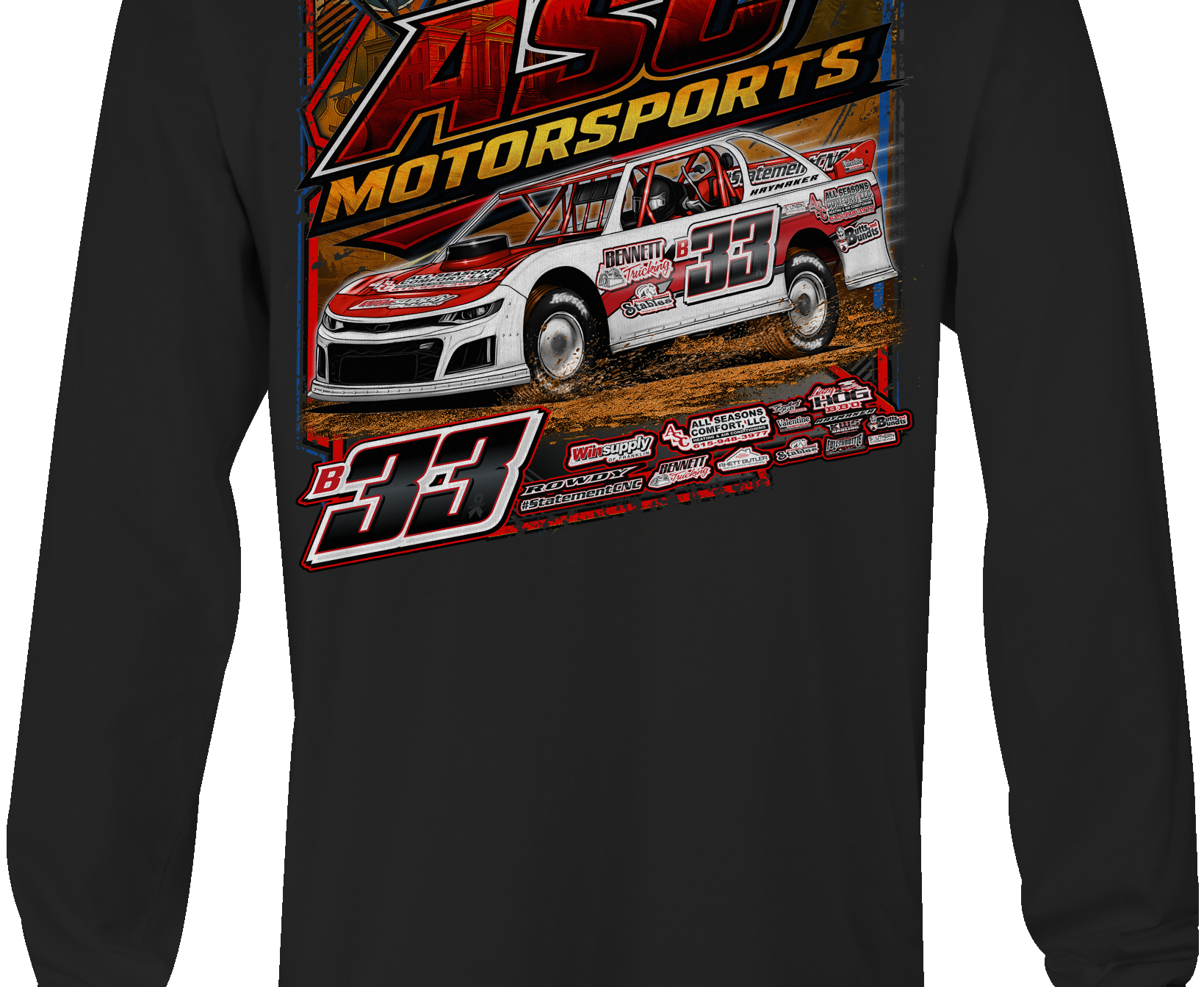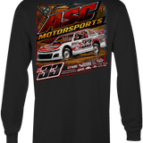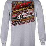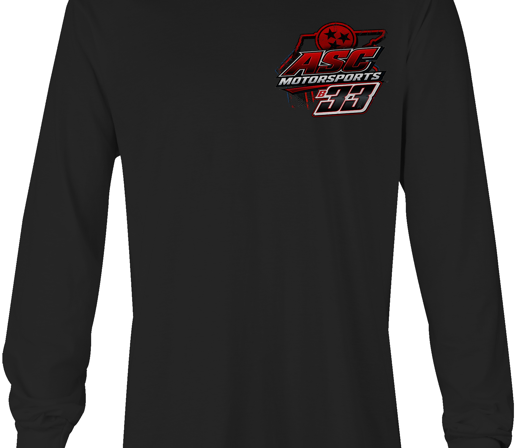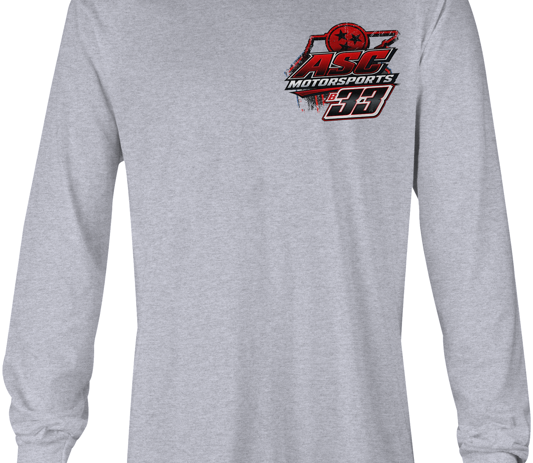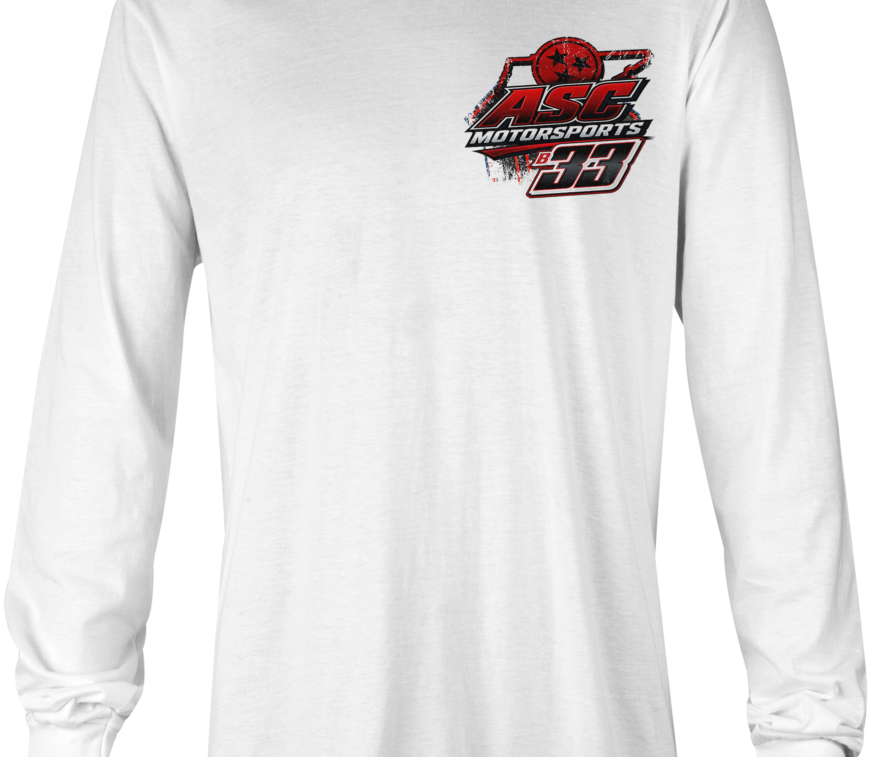 Support ASC Motorsports with their custom apparel! Available in Black, Sports Gray and White. Graphics are direct to garment printed with a left chest image and a full back image.