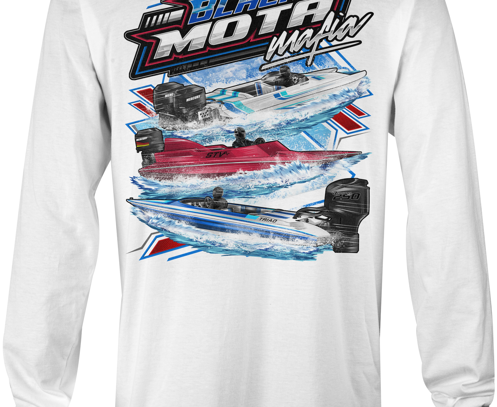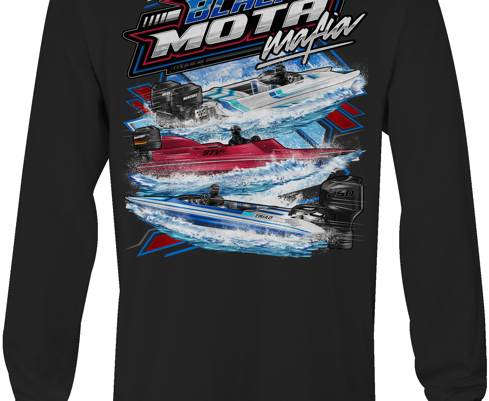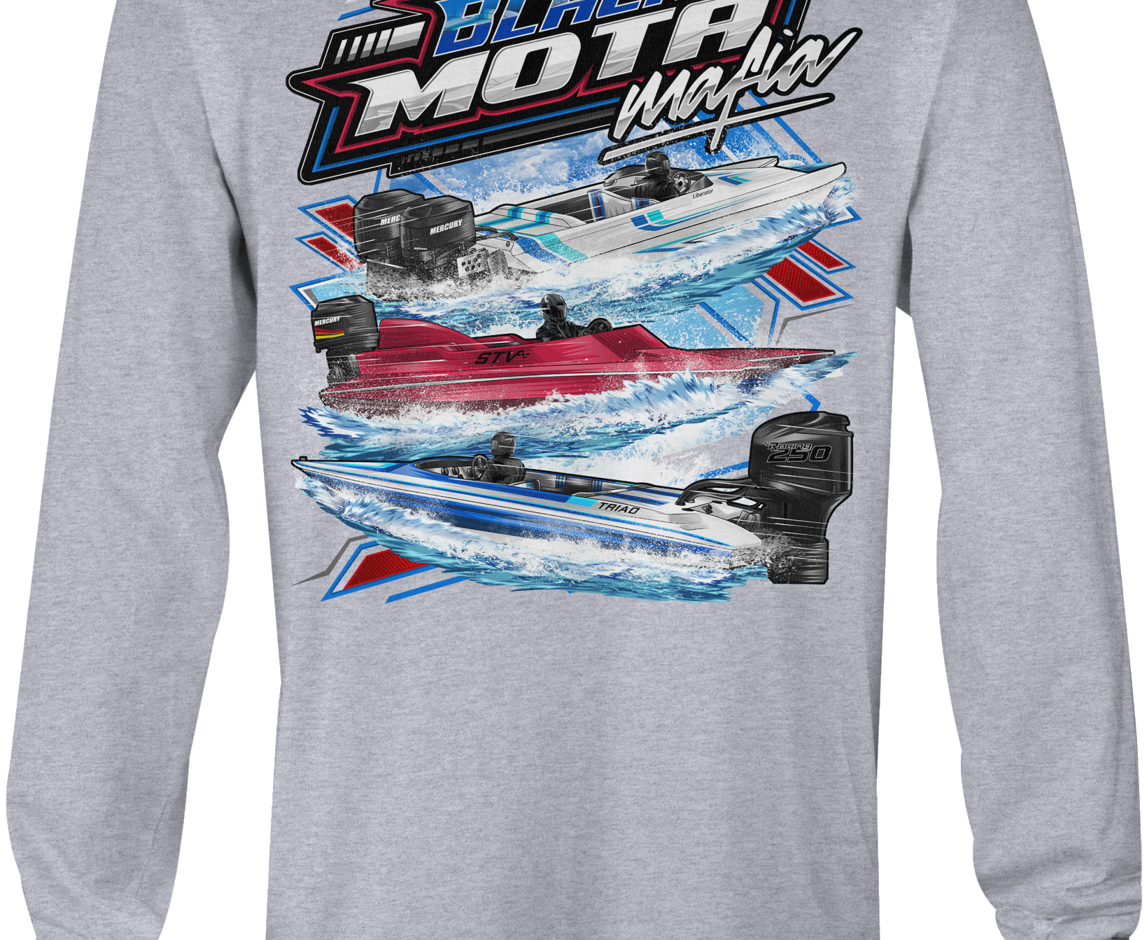 Support Black Mota Mafia with their custom apparel! Available in Black, Sports Gray and White. Graphics are direct to garment printed with a left chest image and a full back image.