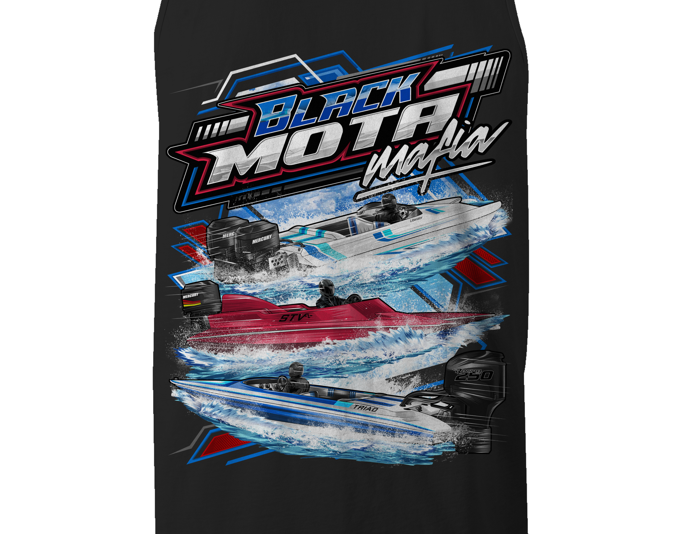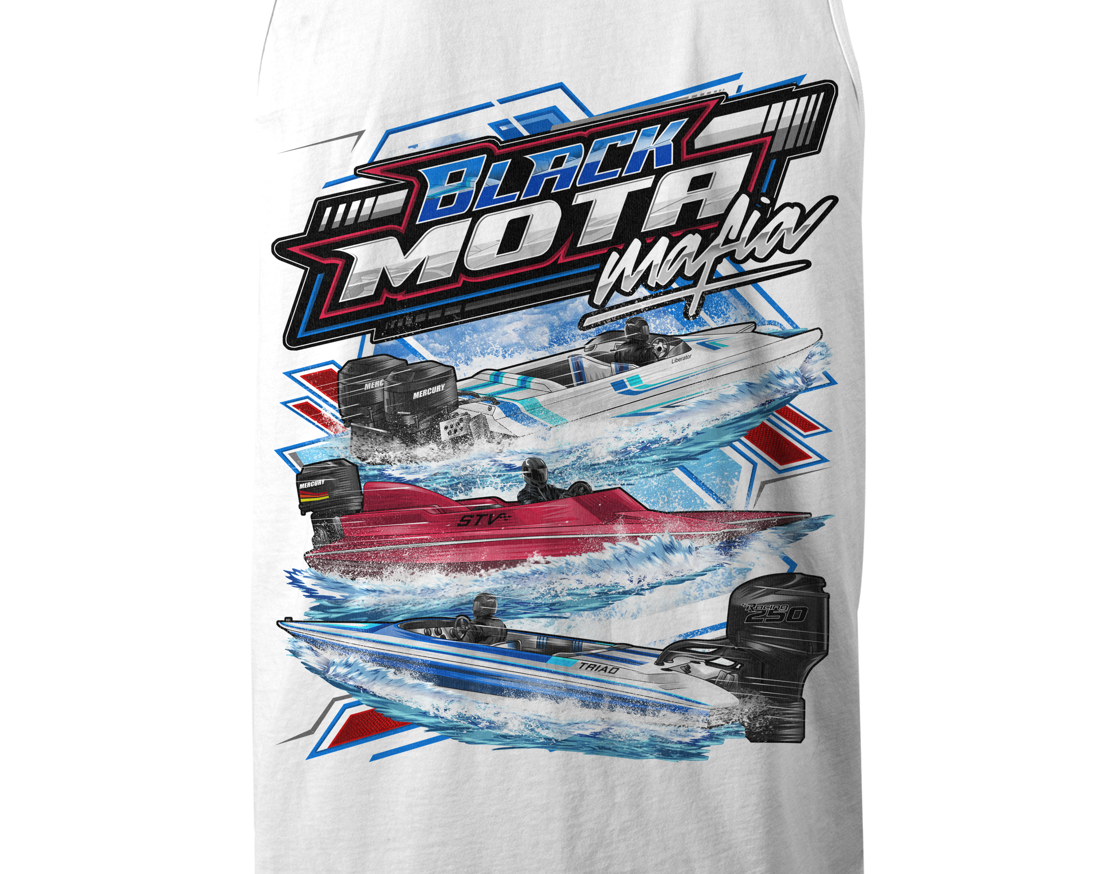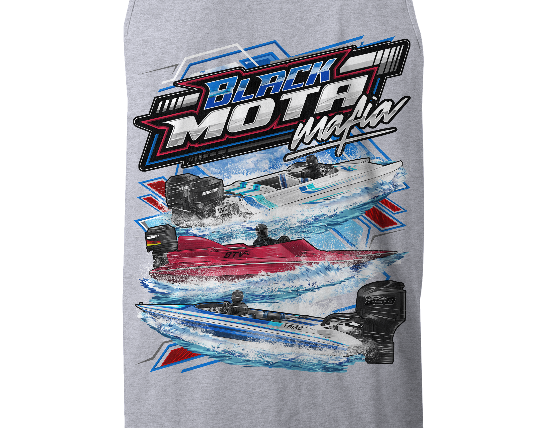 Support Black Mota Mafia with their custom apparel! Available in Black, Sports Gray and White. Graphics are direct to garment printed with a left chest image and a full back image.