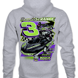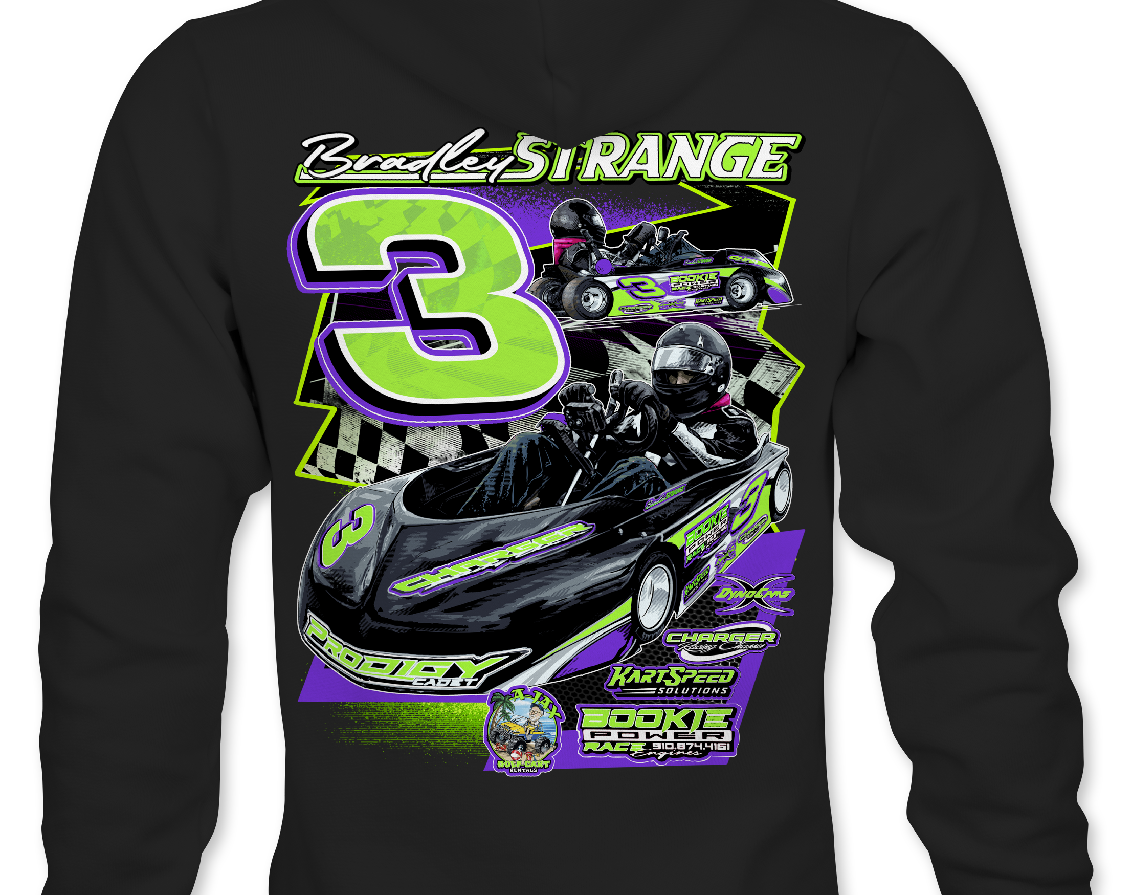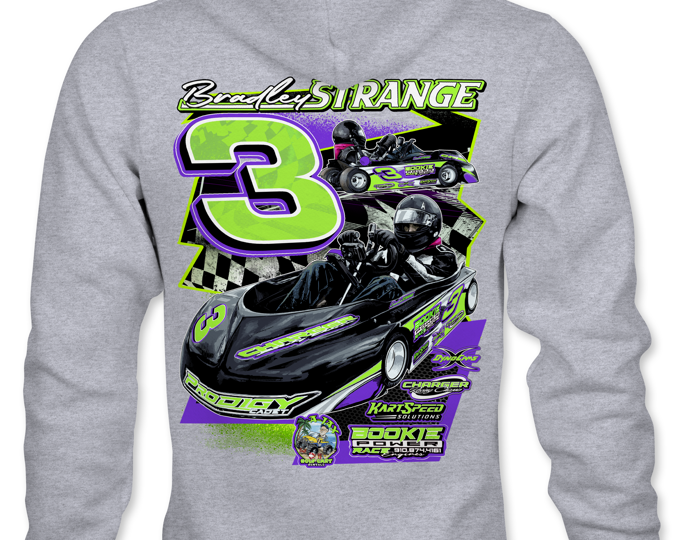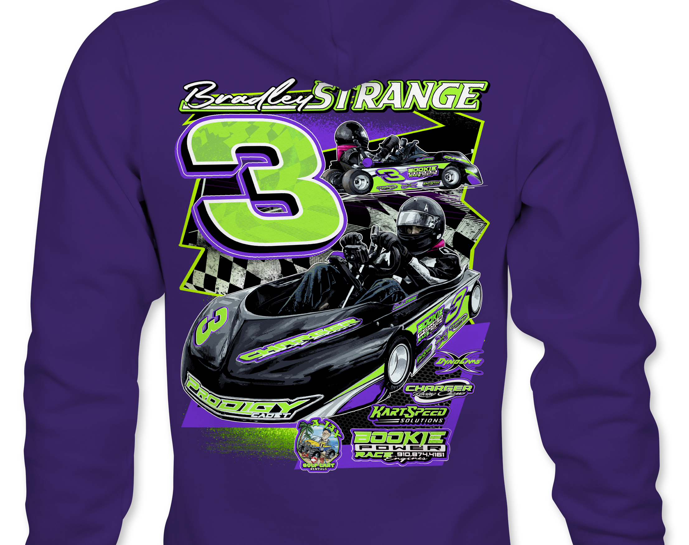 Support Bradley Strange and his team with their custom apparel! Available in Black, White, Sport Gray and Purple. Graphics are direct to garment printed with a left chest image and a full back image.