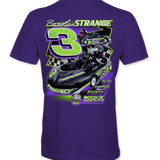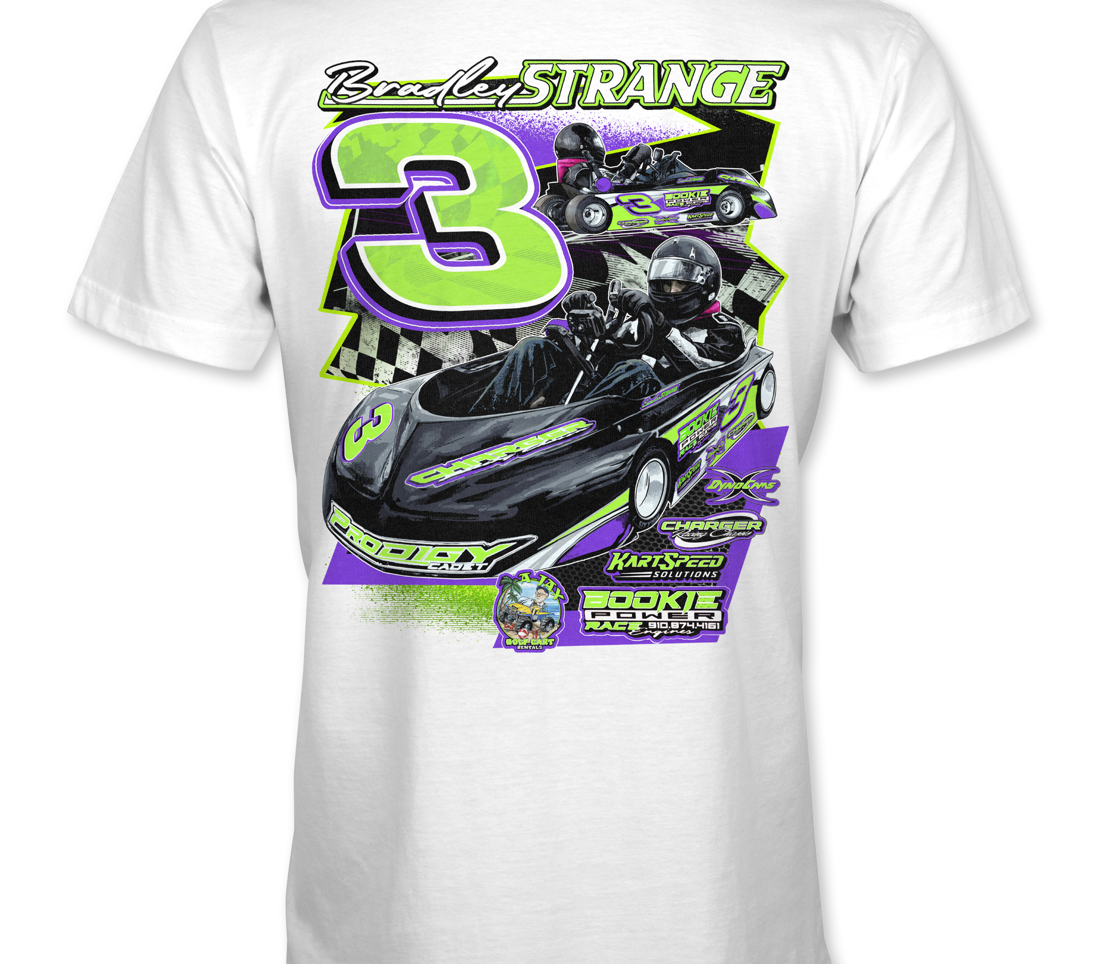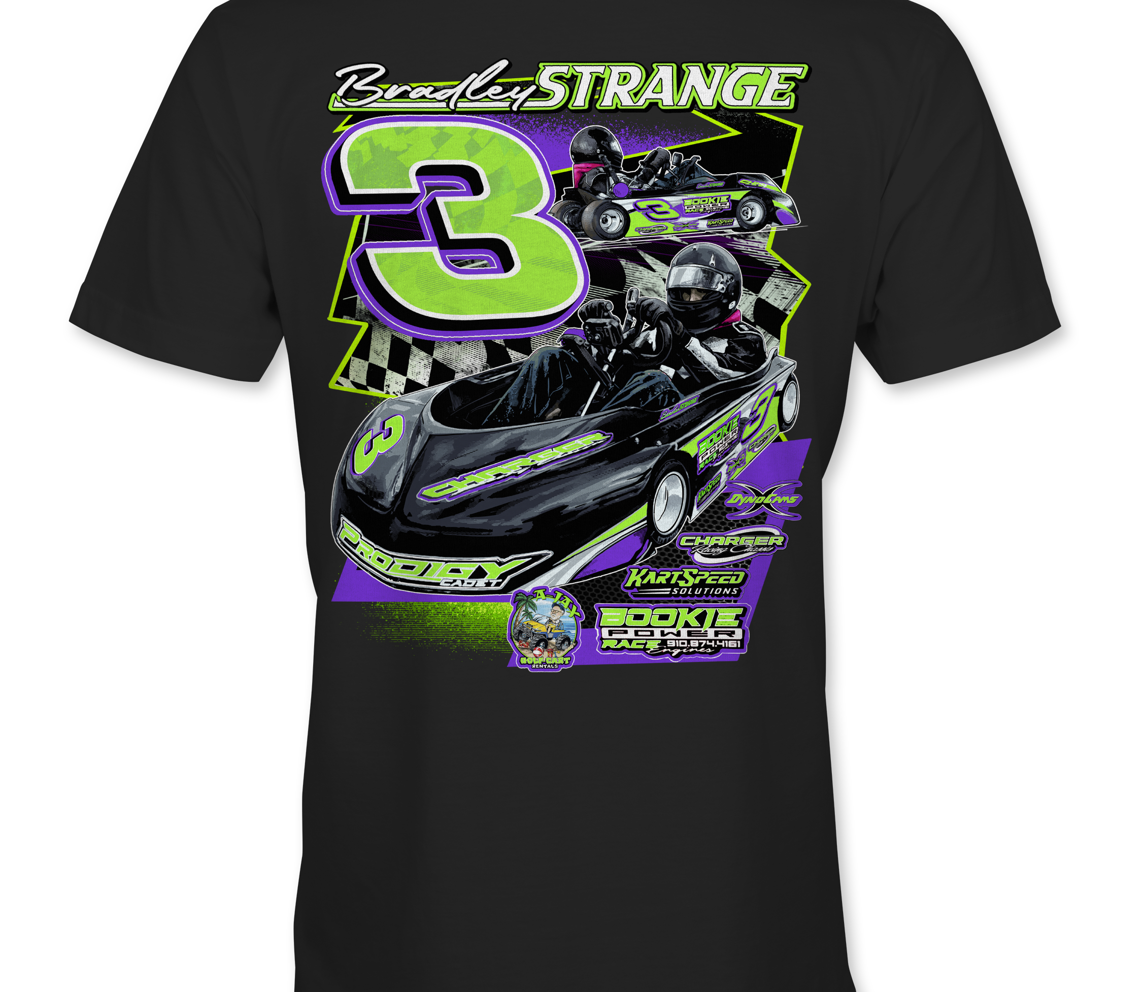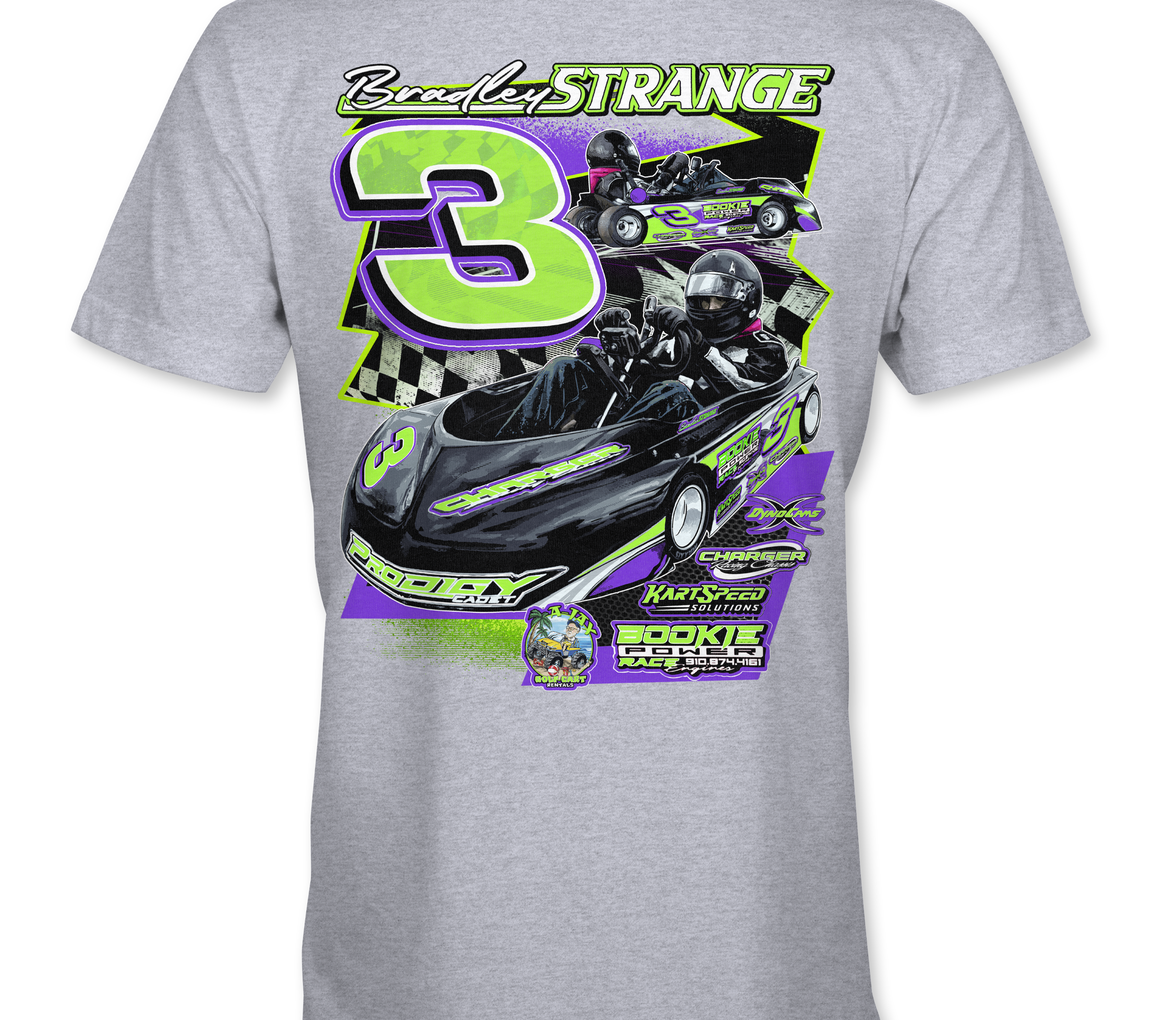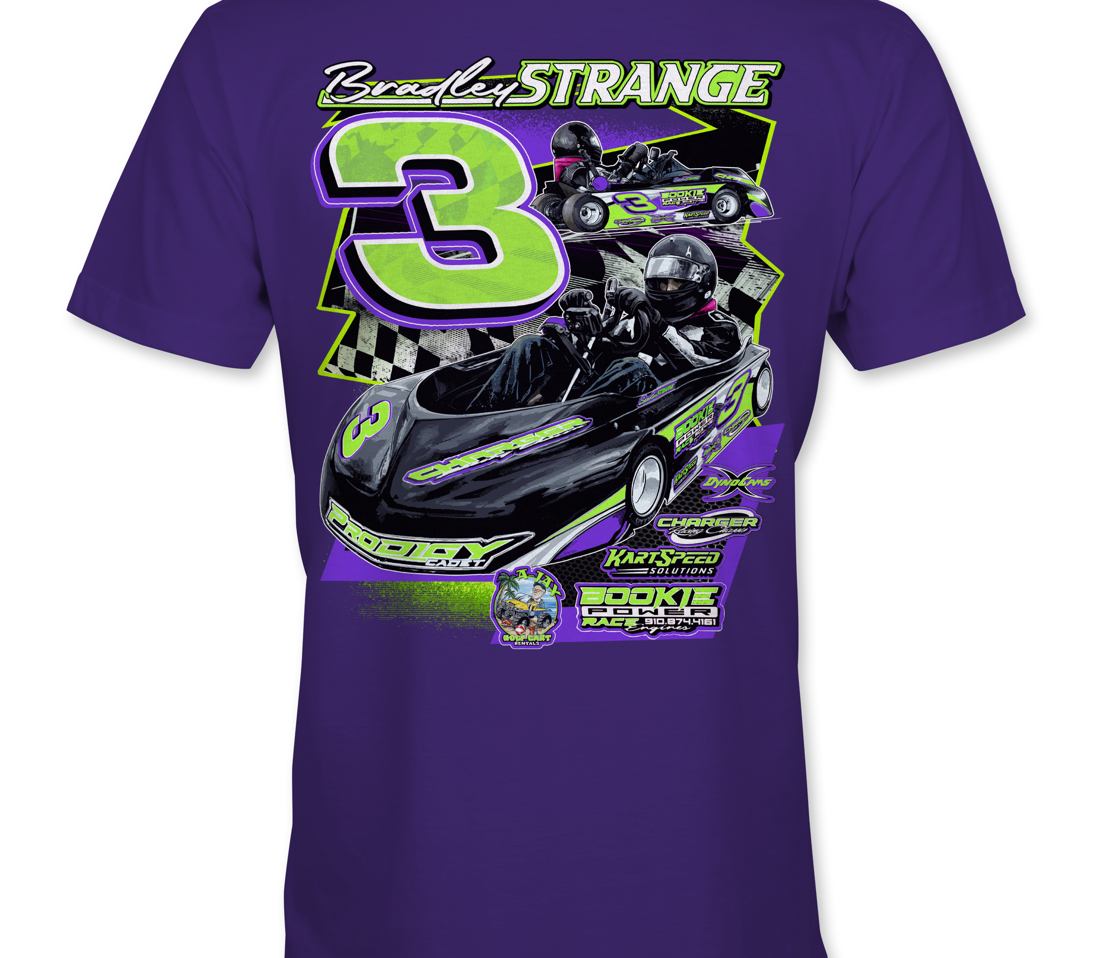 Support Bradley Strange and his team with their custom apparel! Available in Black, White, Sport Gray and Purple. Graphics are direct to garment printed with a left chest image and a full back image.
