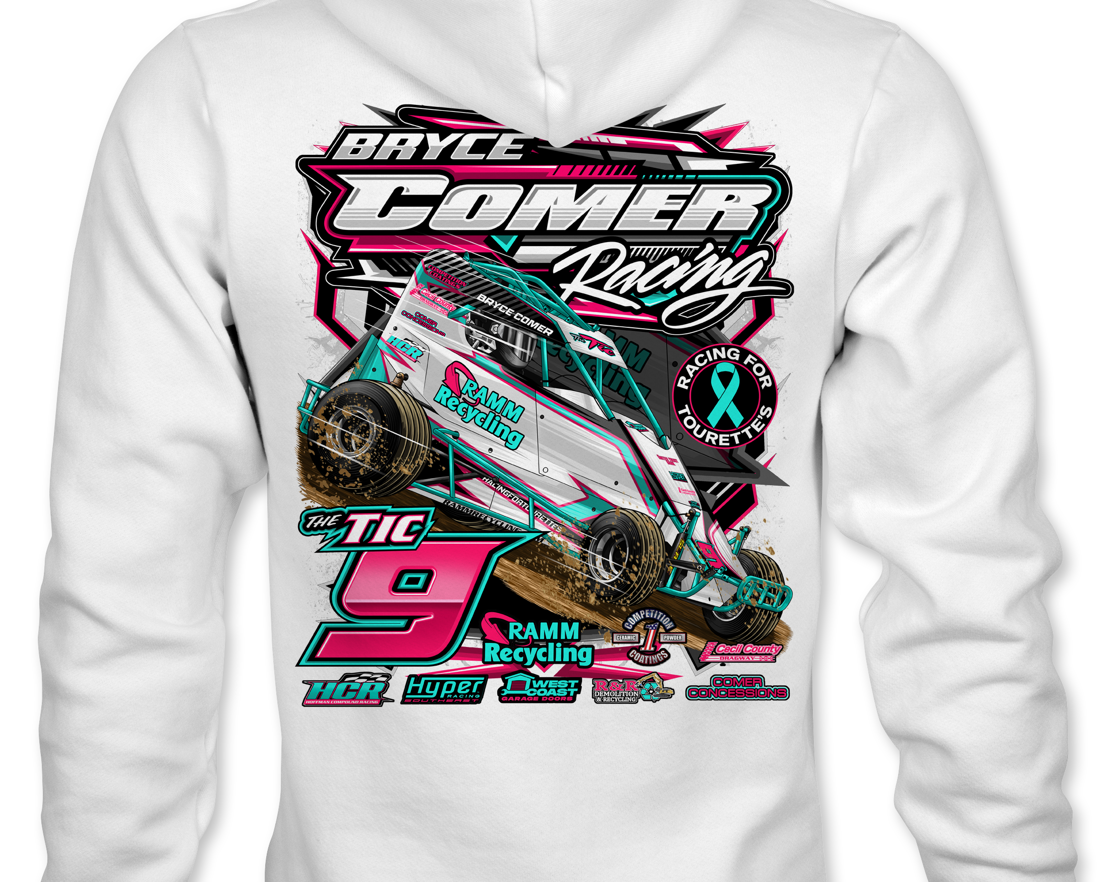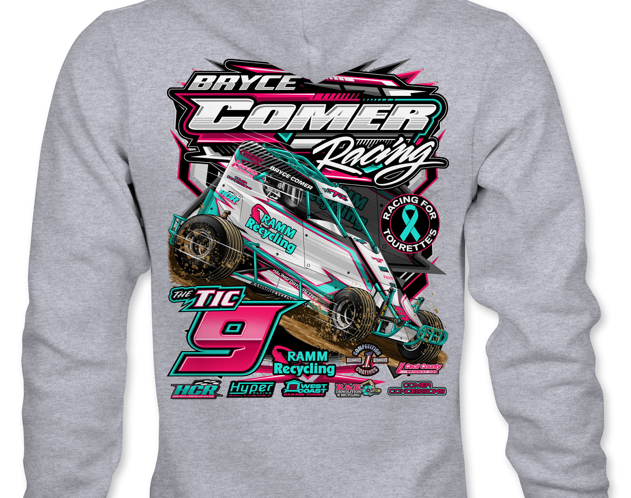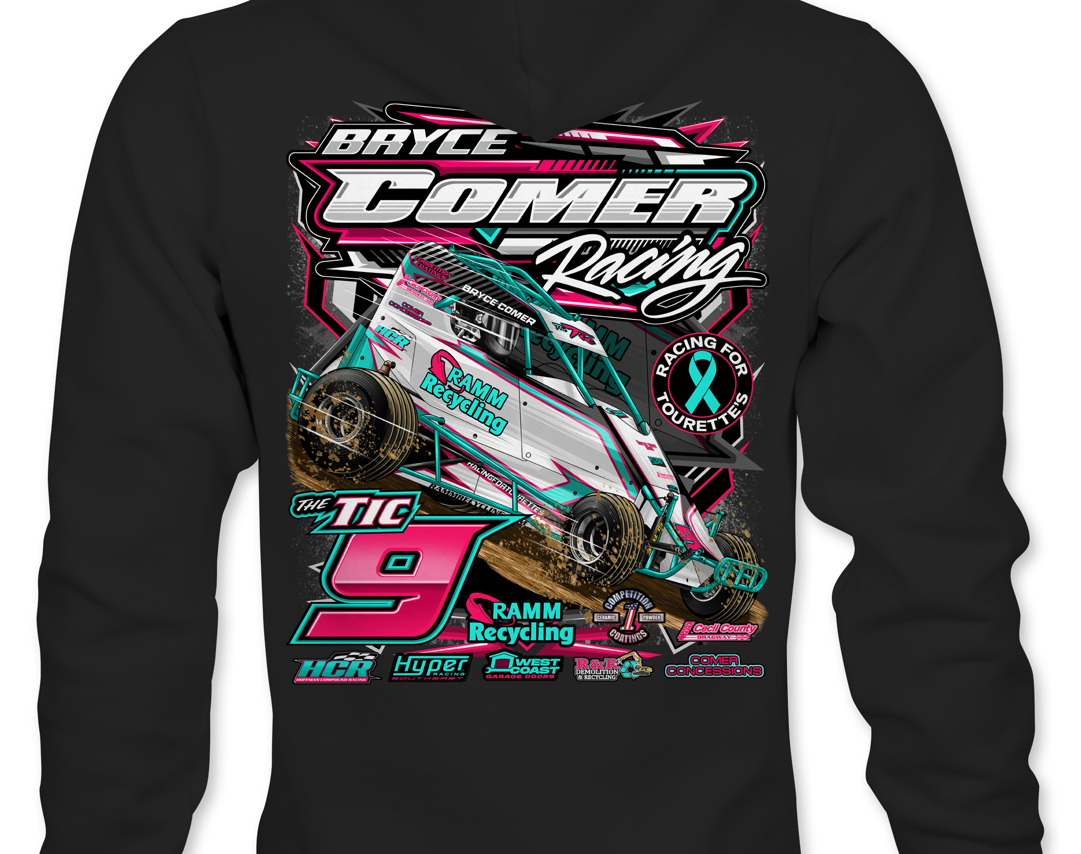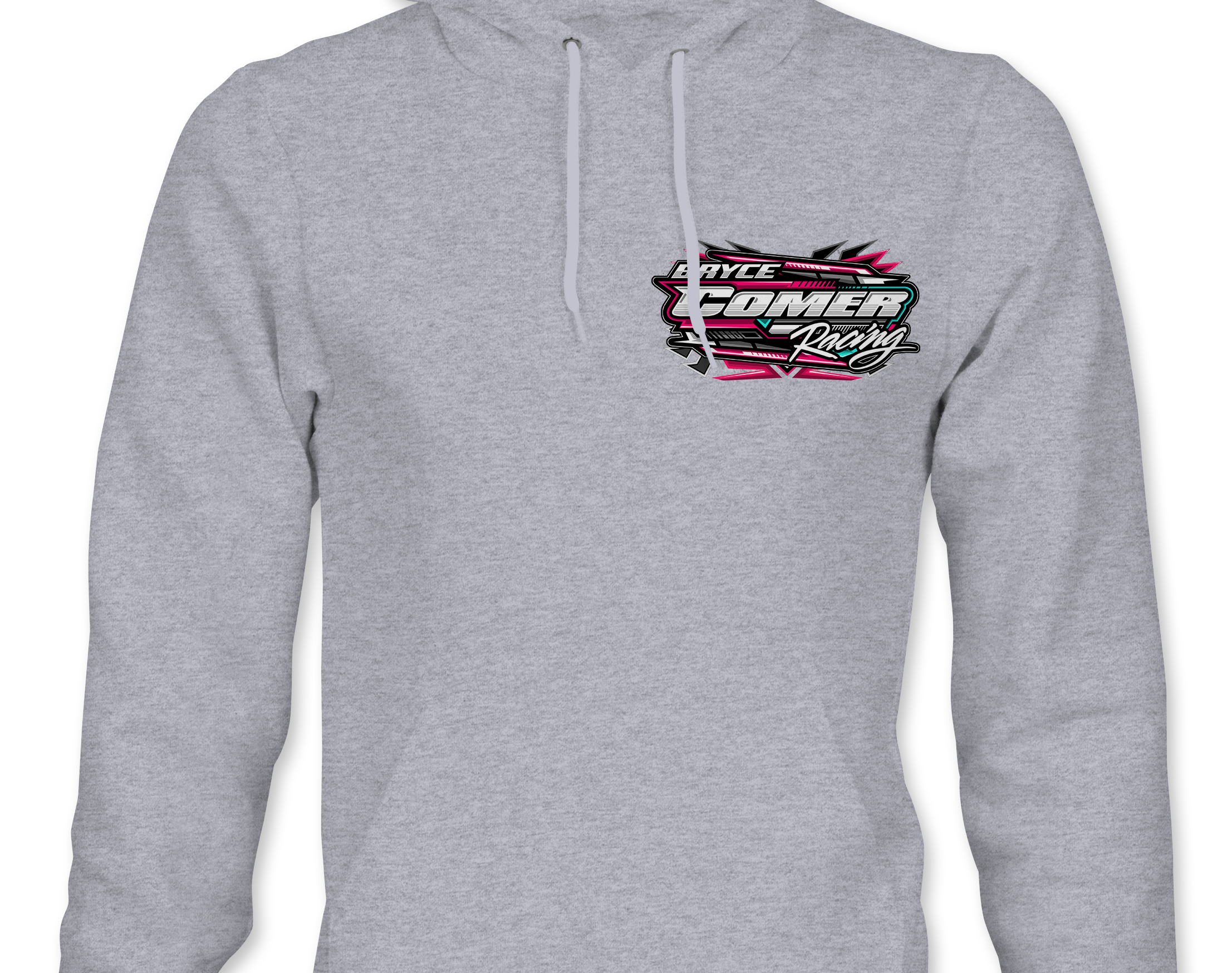 Support Bryce Comer Racing 2025 with their custom apparel! Available in Black, Sports Gray and White. Graphics are direct to garment printed with a left chest image and a full back image.