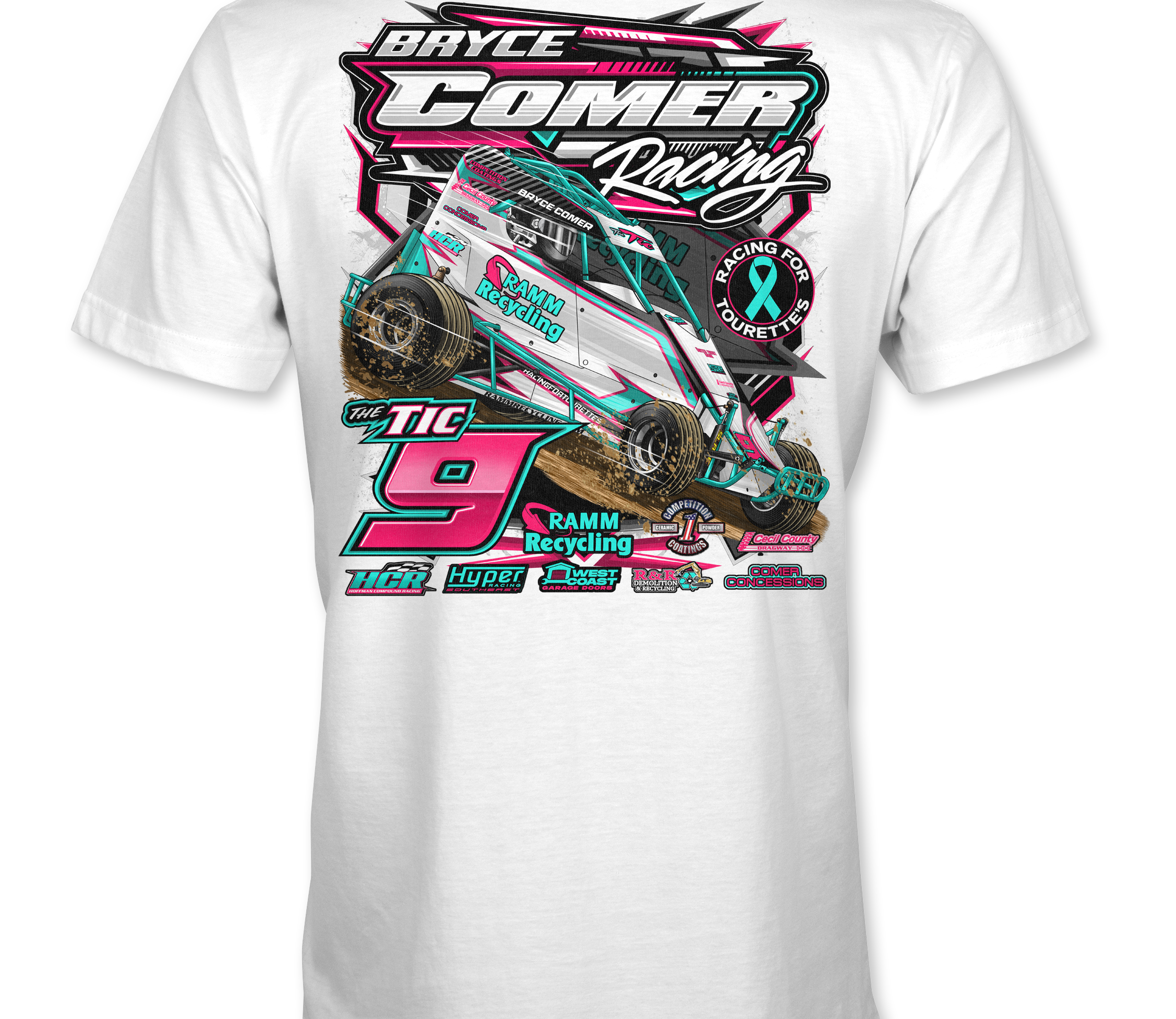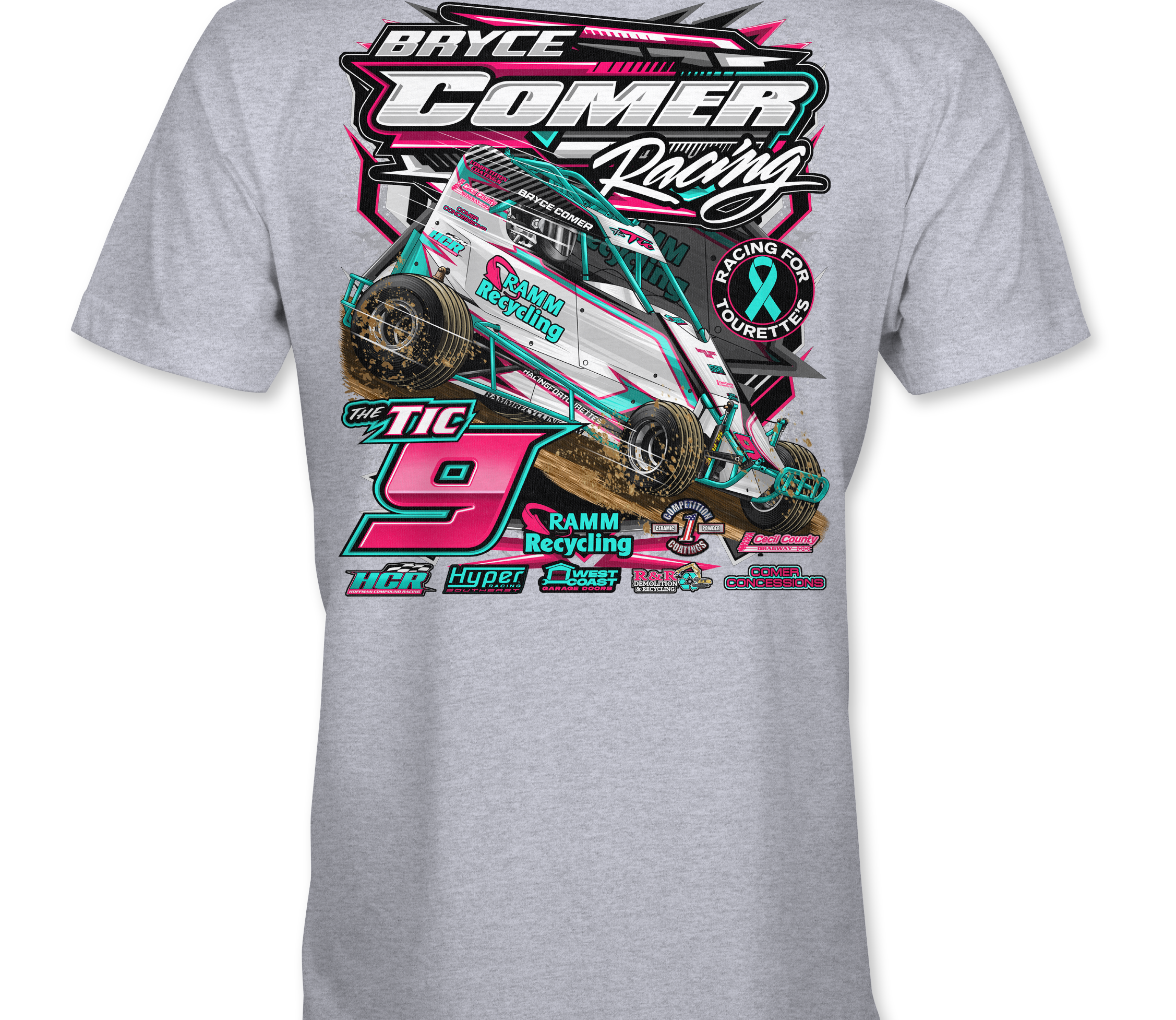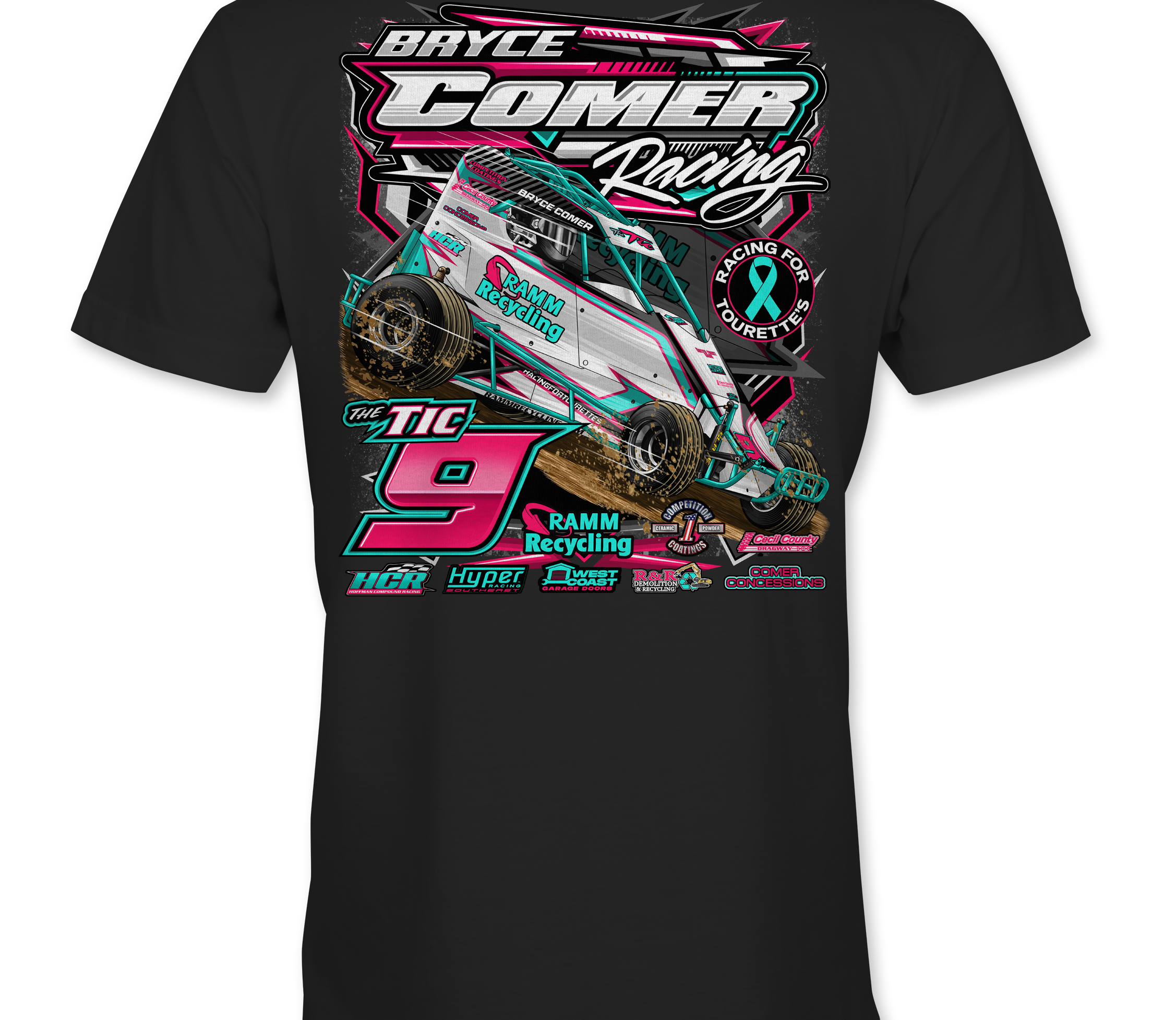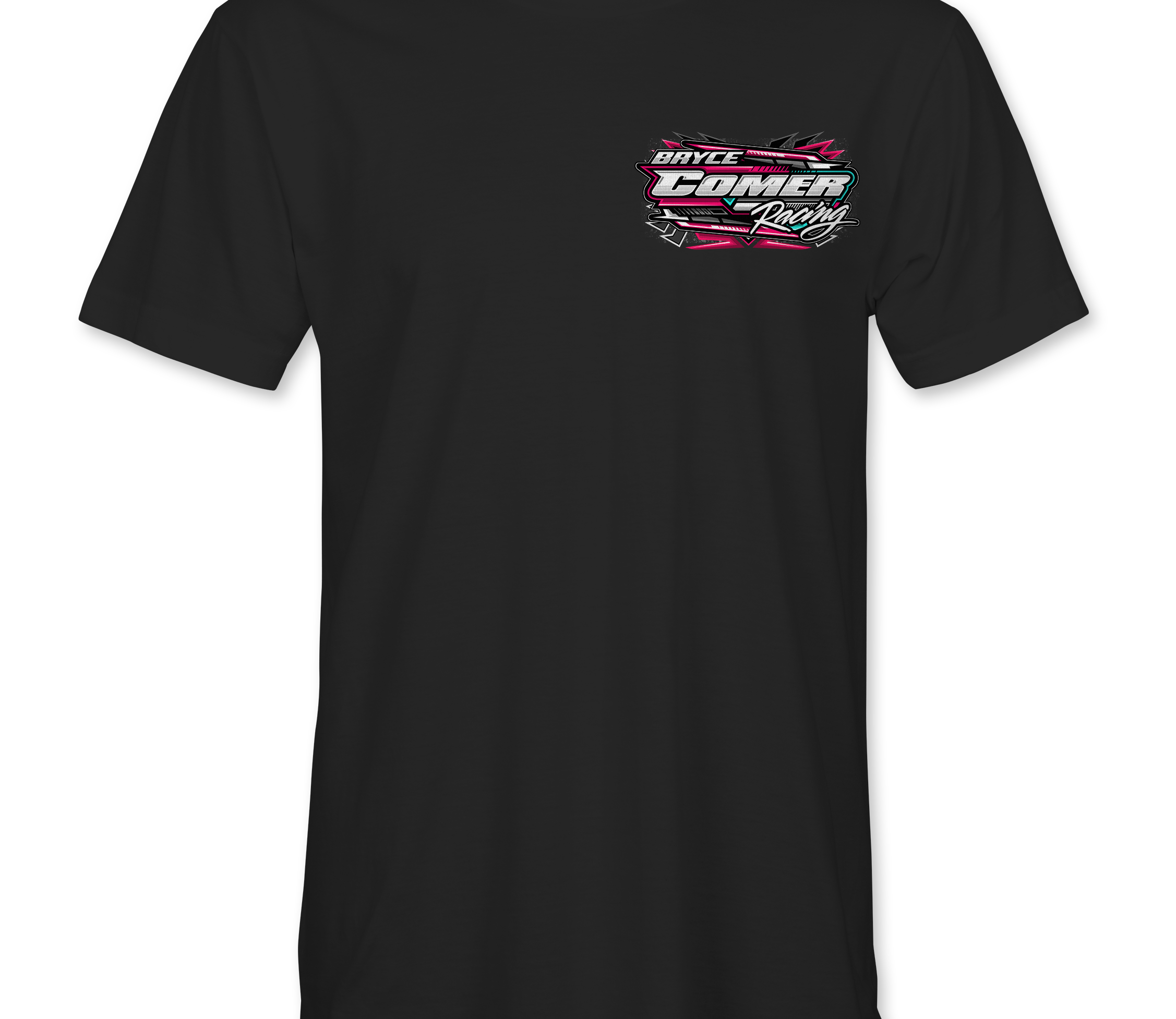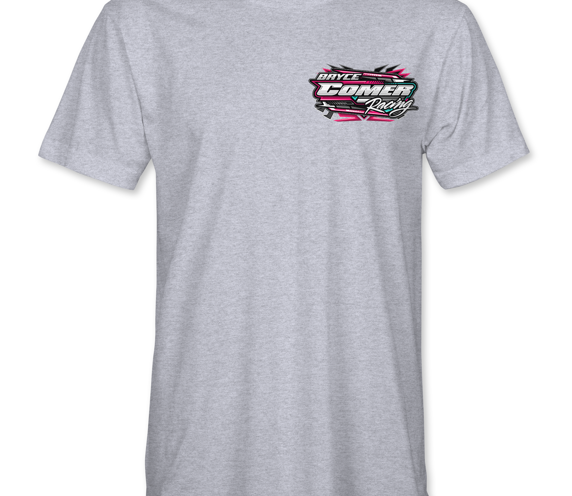 Support Bryce Comer Racing 2025 with their custom apparel! Available in Black, Sports Gray and White. Graphics are direct to garment printed with a left chest image and a full back image.