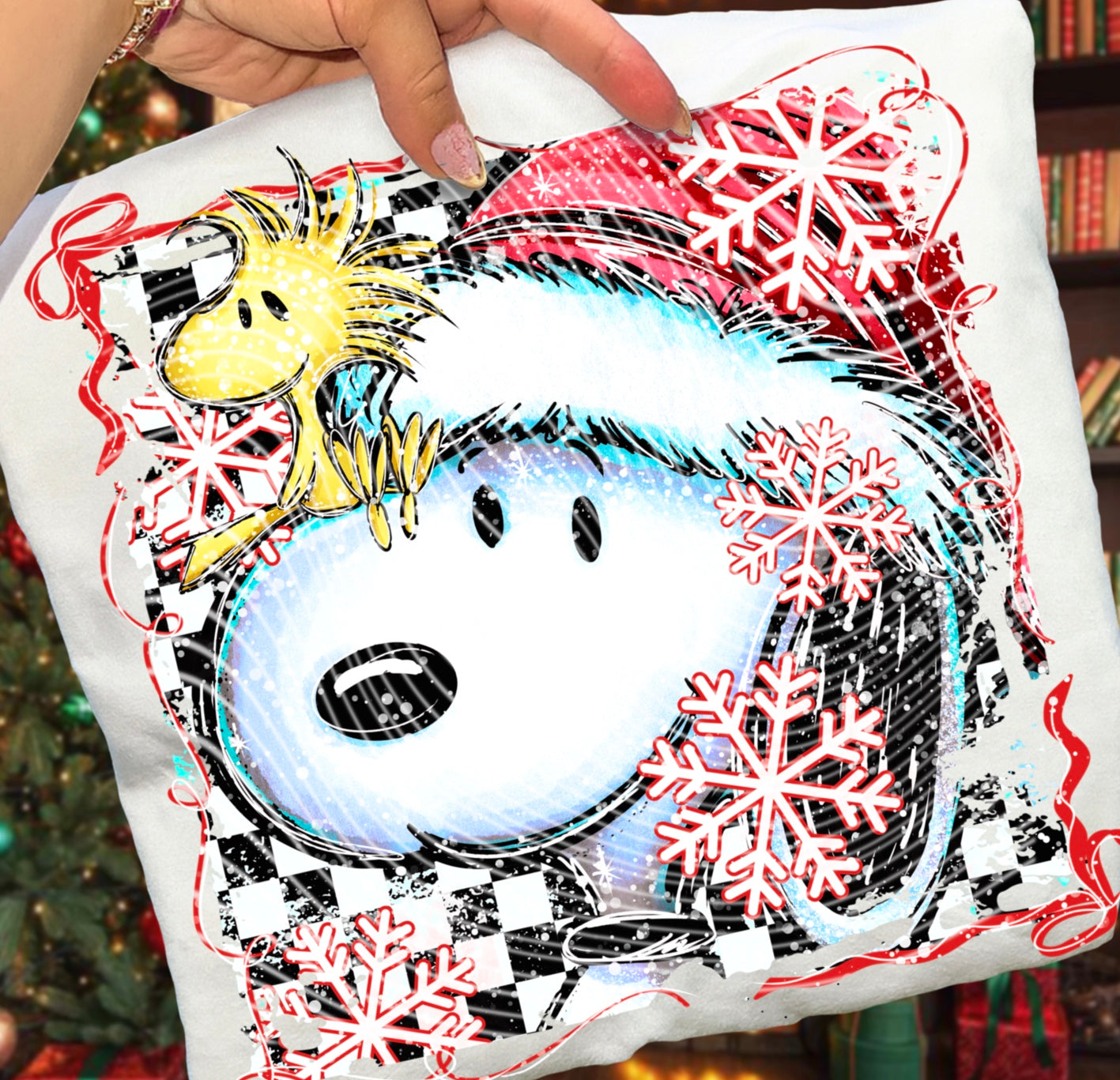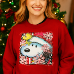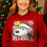 Cozy and fun, this Checkered Snoopy crewneck features a candy-check background, Snoopy in his Santa hat, and Woodstock perched on top. Perfect for winter lounging, Christmas movies, and holiday outings.