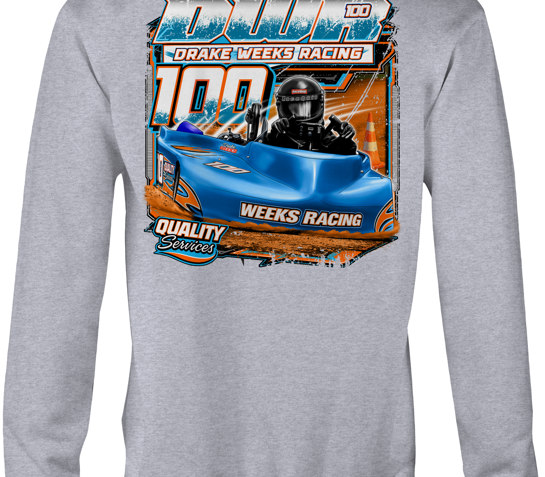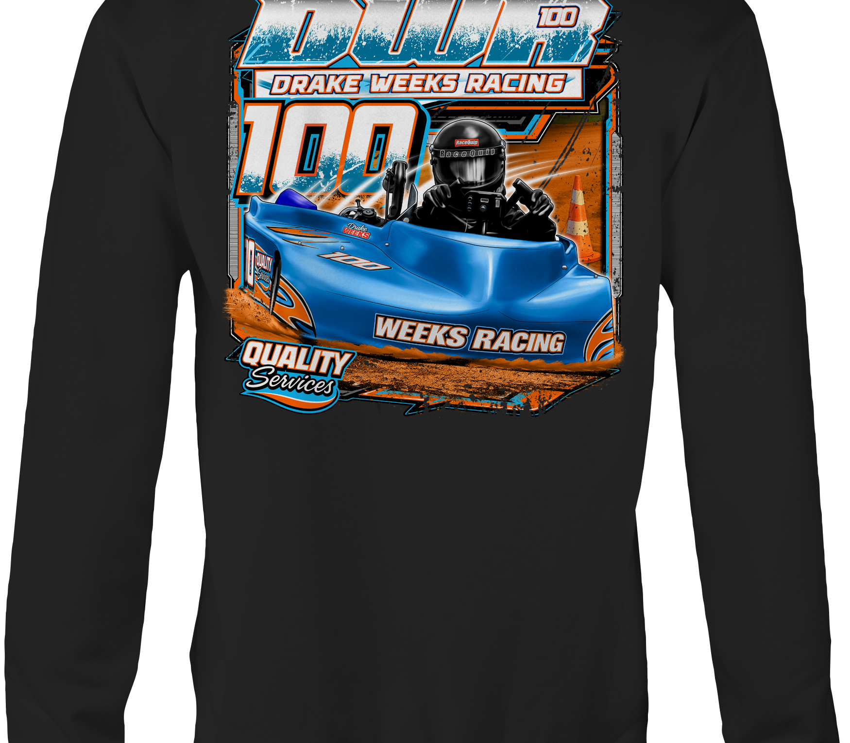 Support Drake Weeks with their custom apparel!  Available in Black, Sports Gray and White. Graphics are direct to garment printed with a left chest image and a full back image.