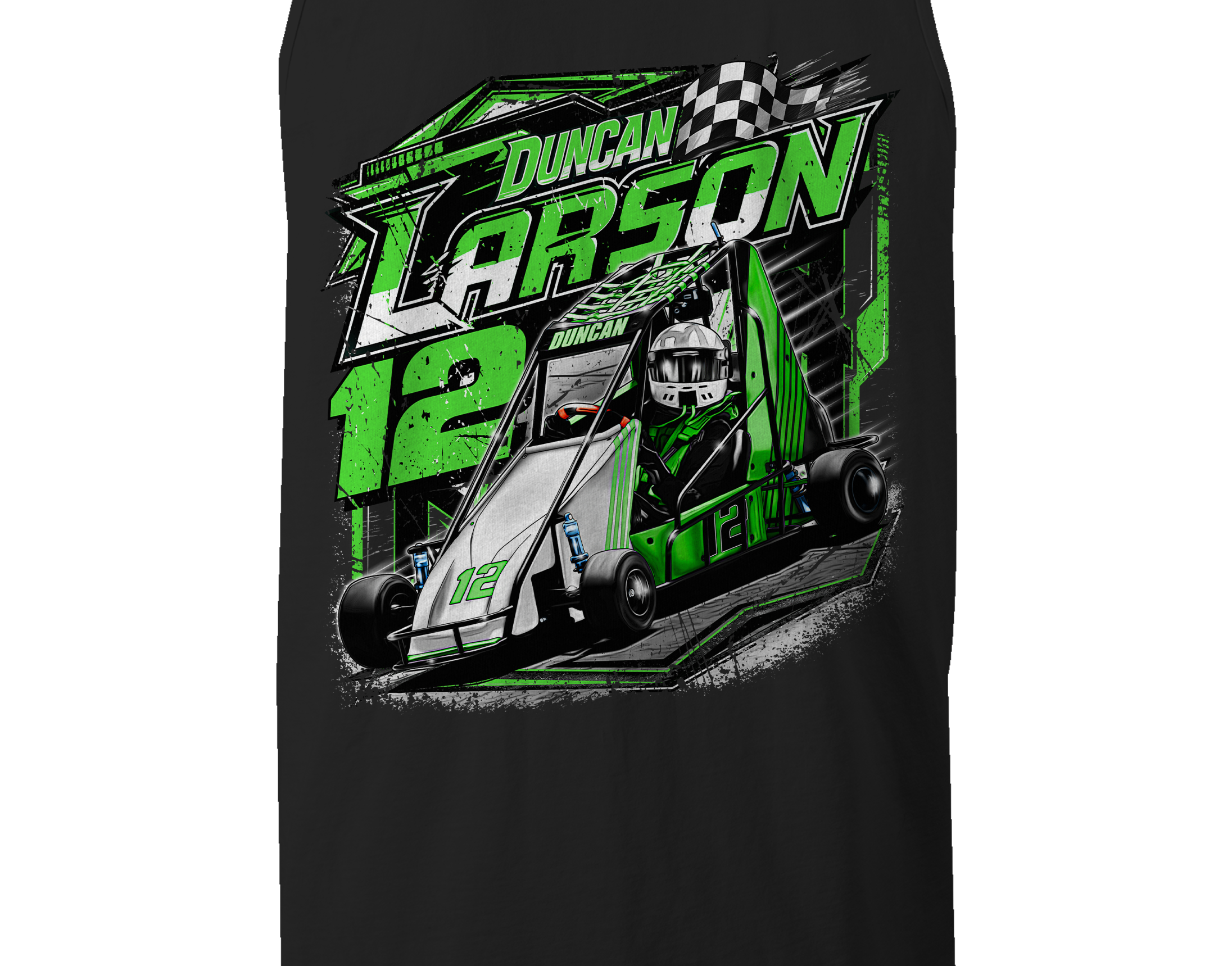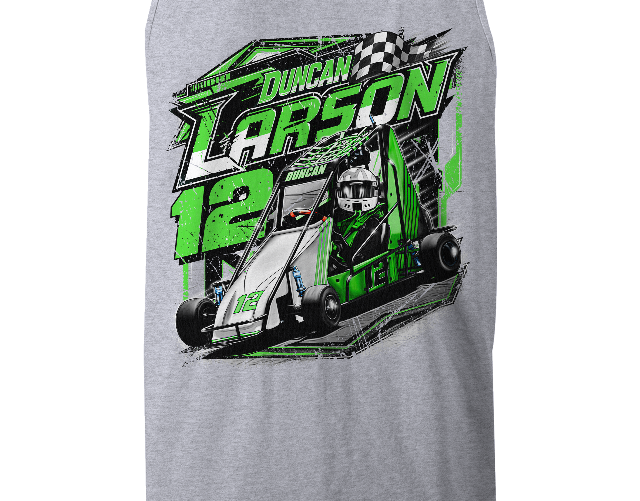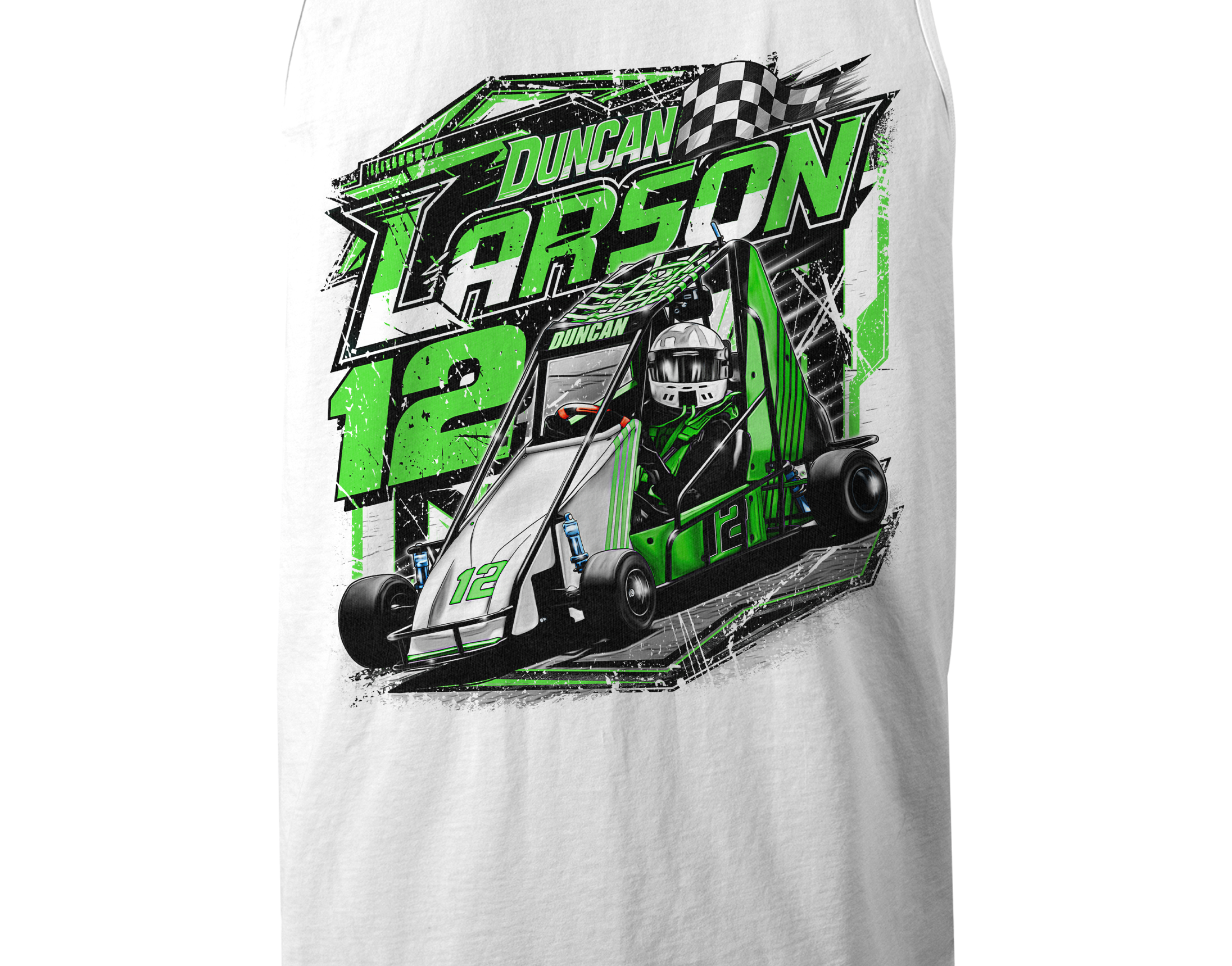 Support Duncan Larson with their custom apparel! Available in Black, Sports Gray and White. Graphics are direct to garment printed with a left chest image and a full back image.