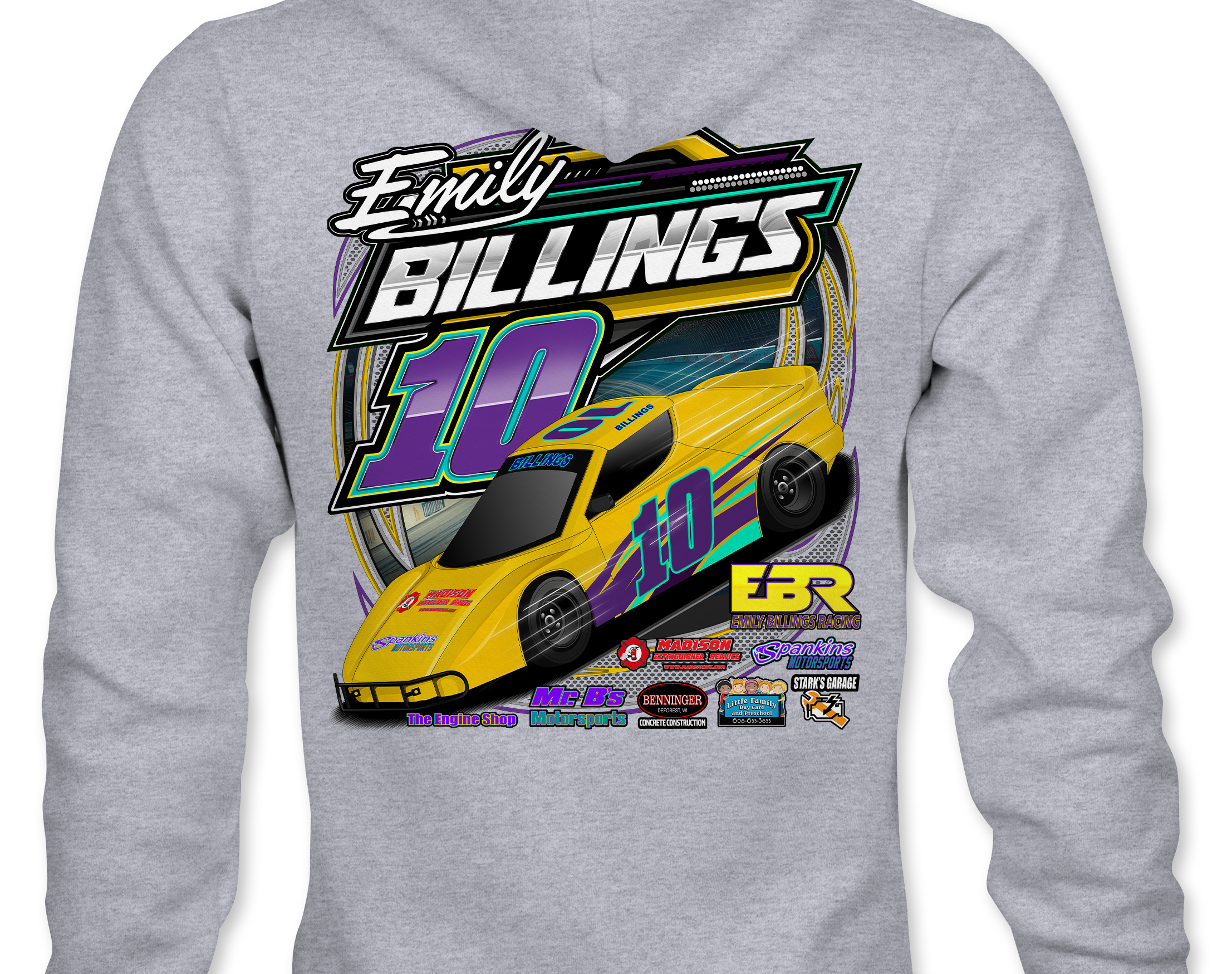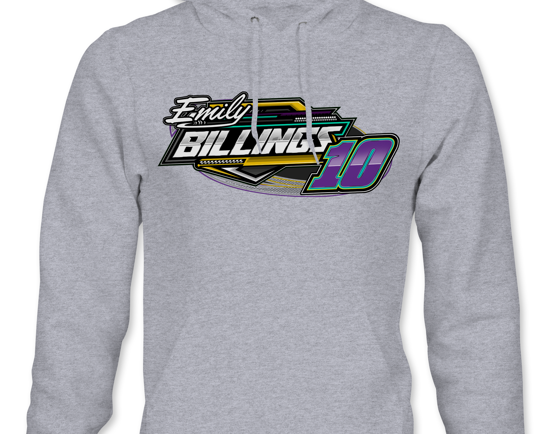 Support Emily Billings Racing with their custom apparel!  Available in Black, Sports Gray and White. Graphics are direct to garment printed with a left chest image and a full back image.
