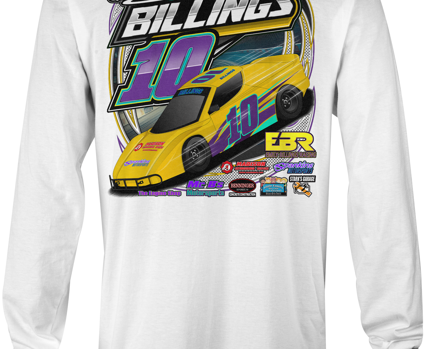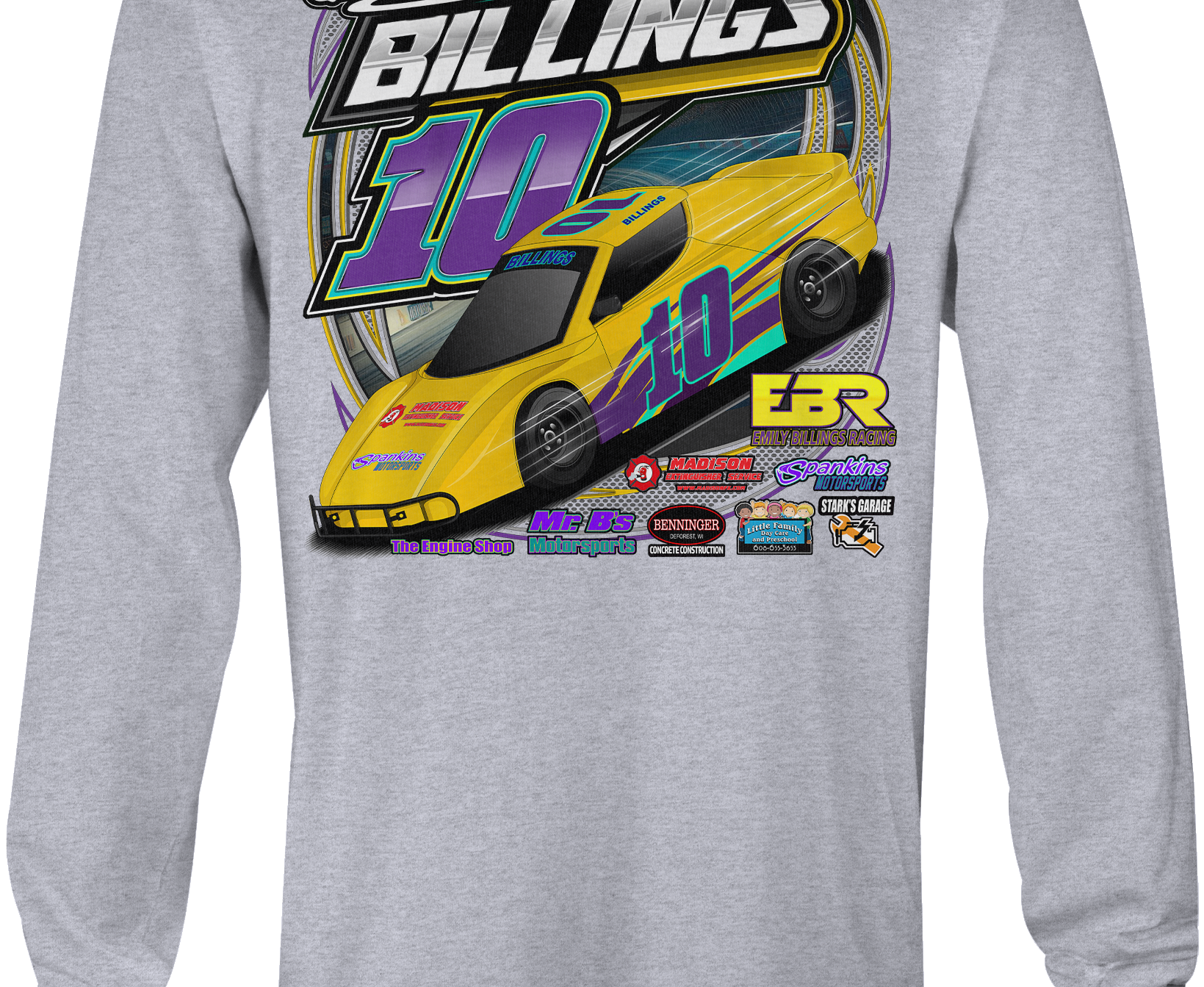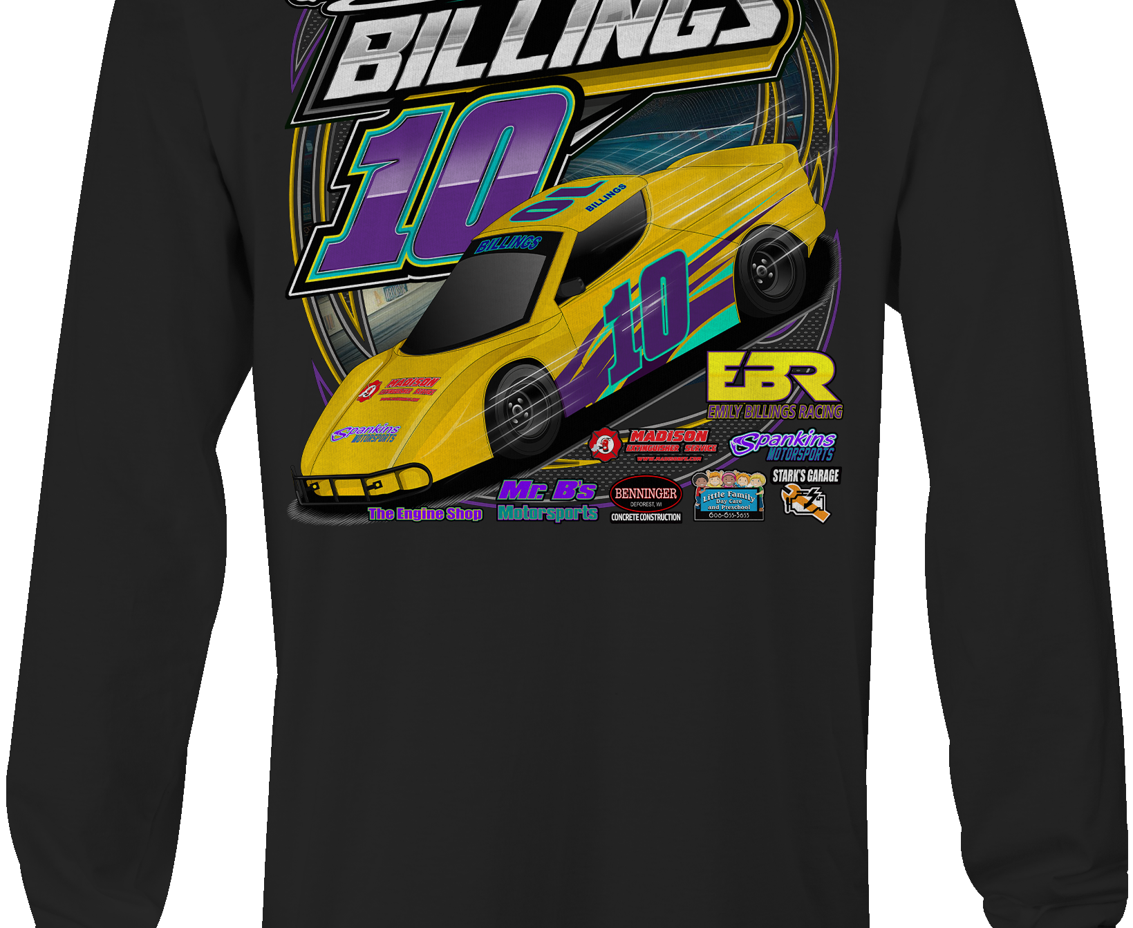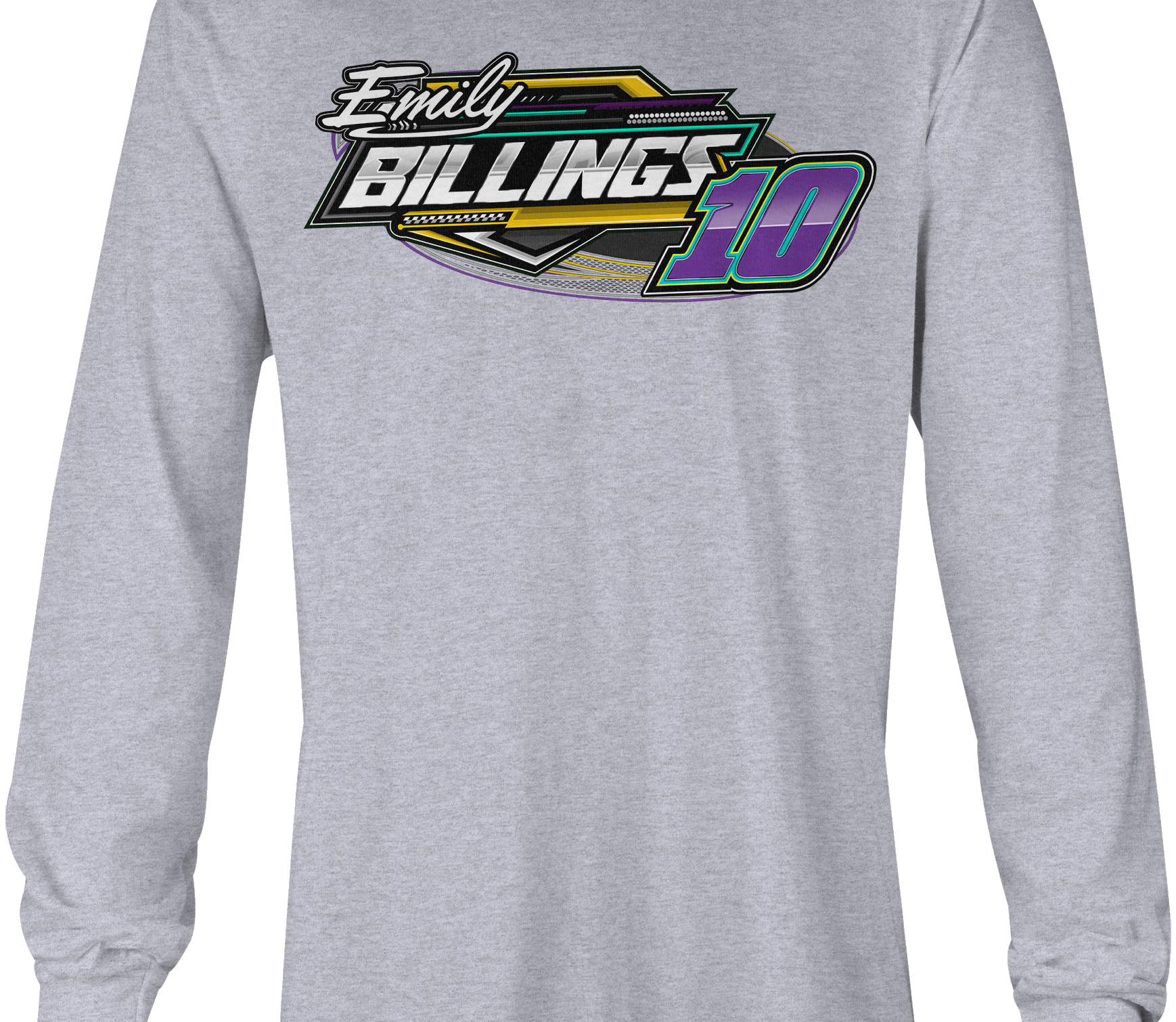 Support Emily Billings Racing with their custom apparel! Available in Black, Sports Gray and White. Graphics are direct to garment printed with a left chest image and a full back image.