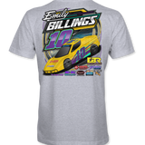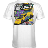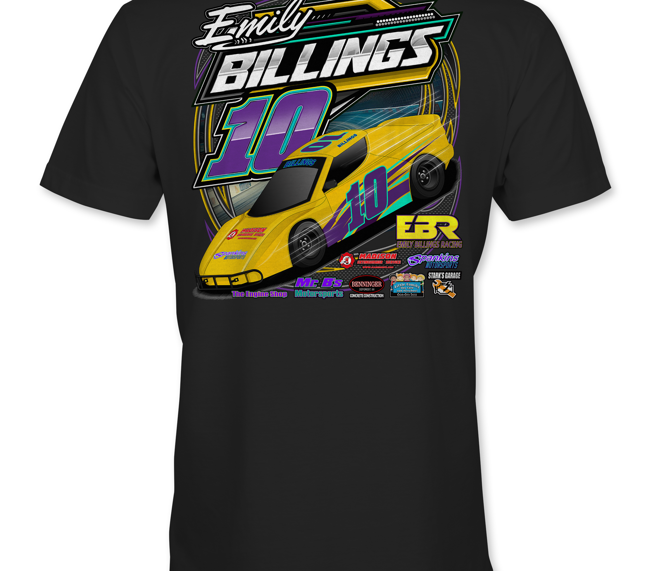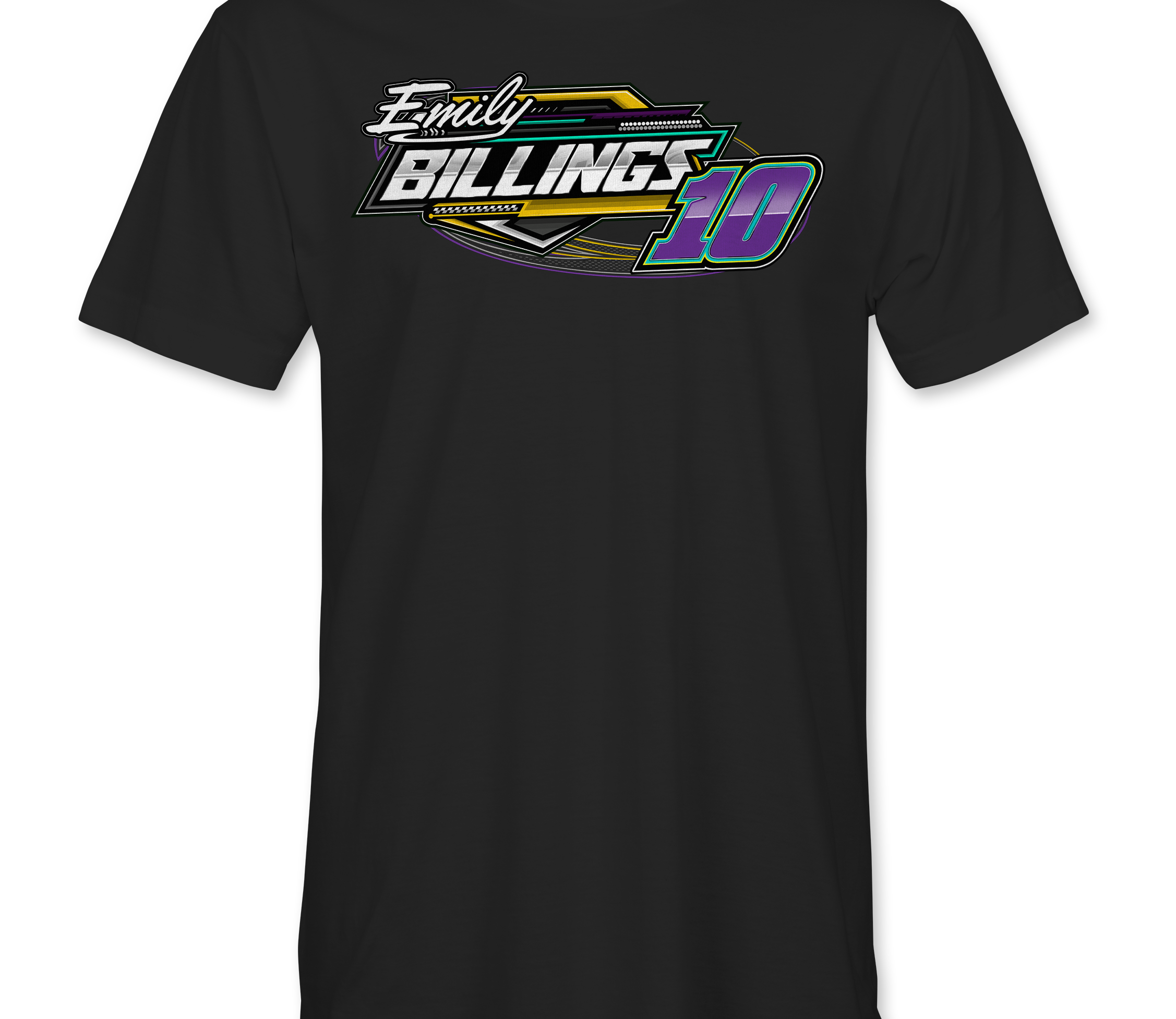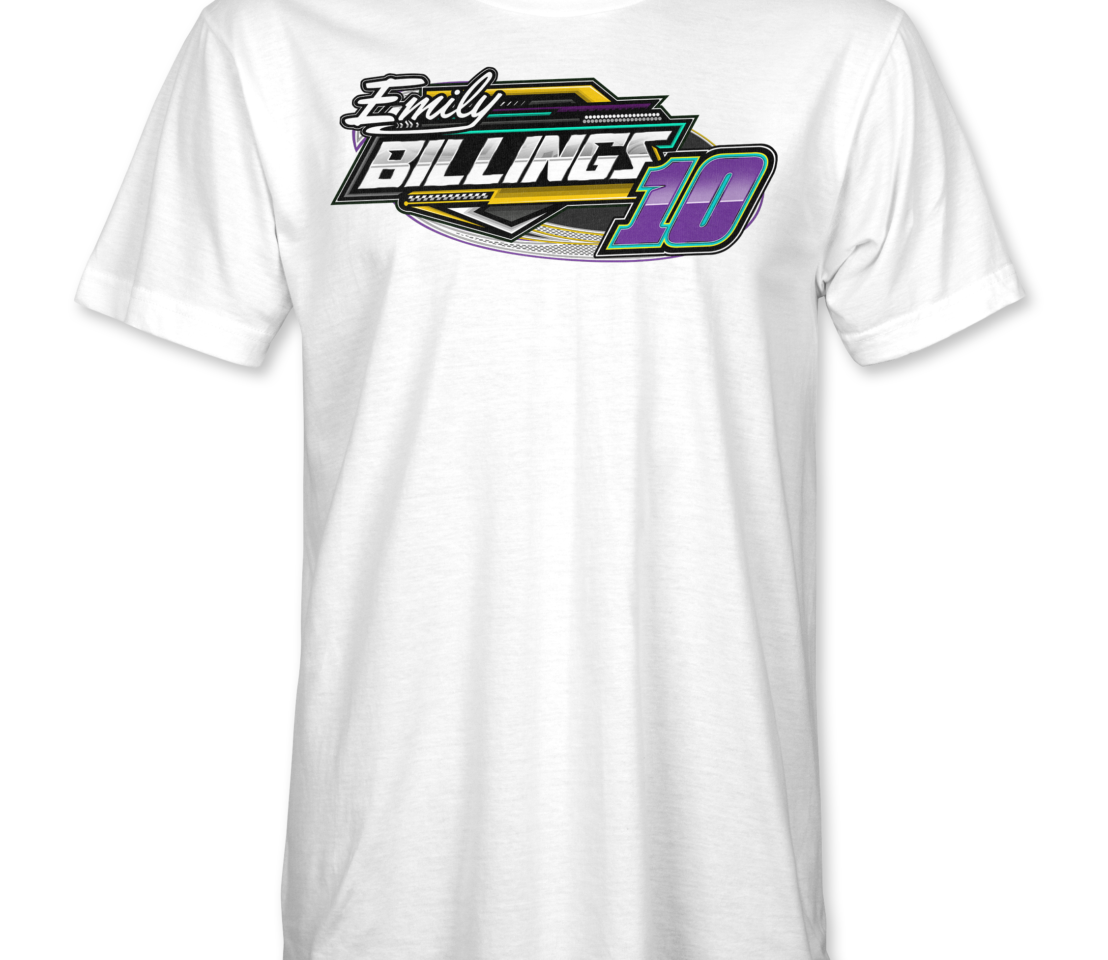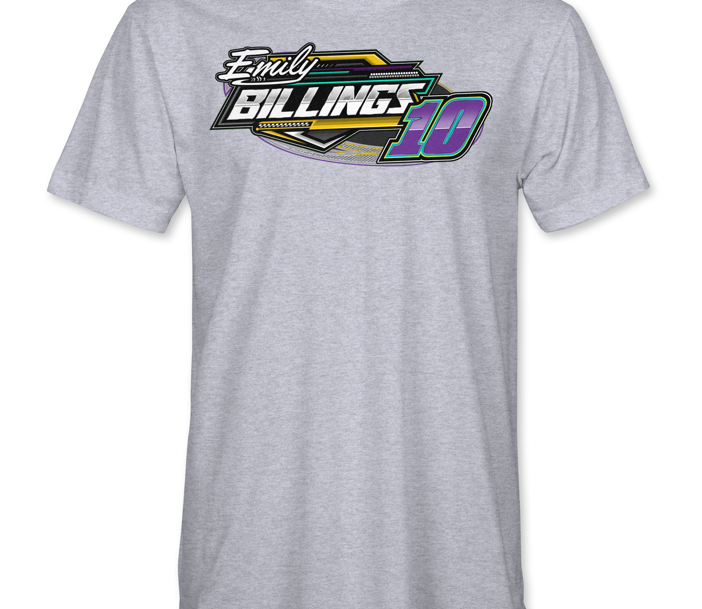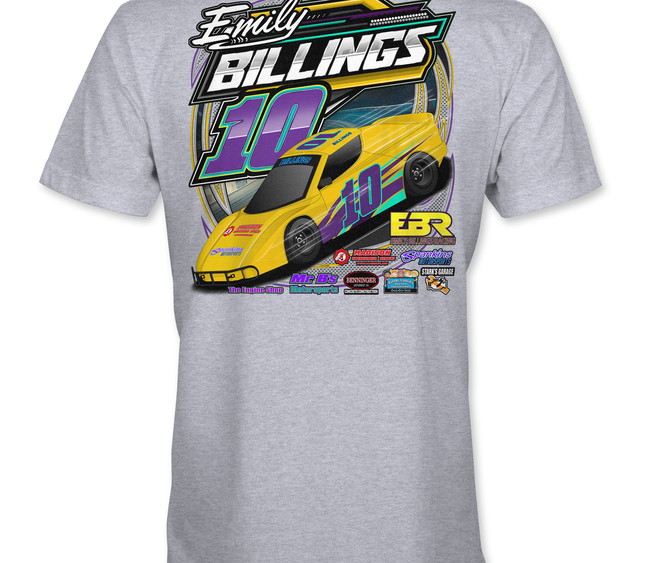 Support Emily Billings Racing with their custom apparel! Available in Black, Sports Gray and White. Graphics are direct to garment printed with a left chest image and a full back image.