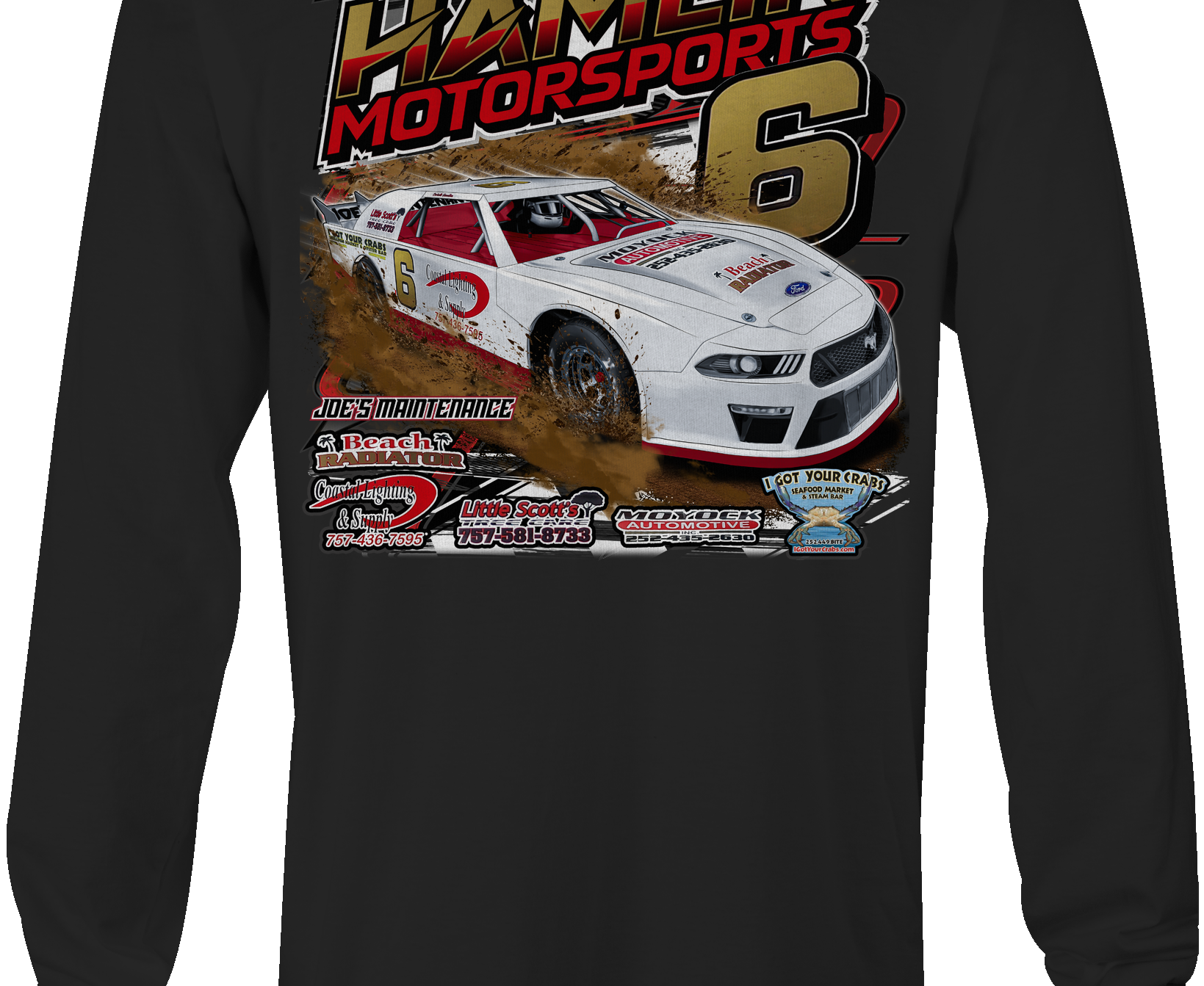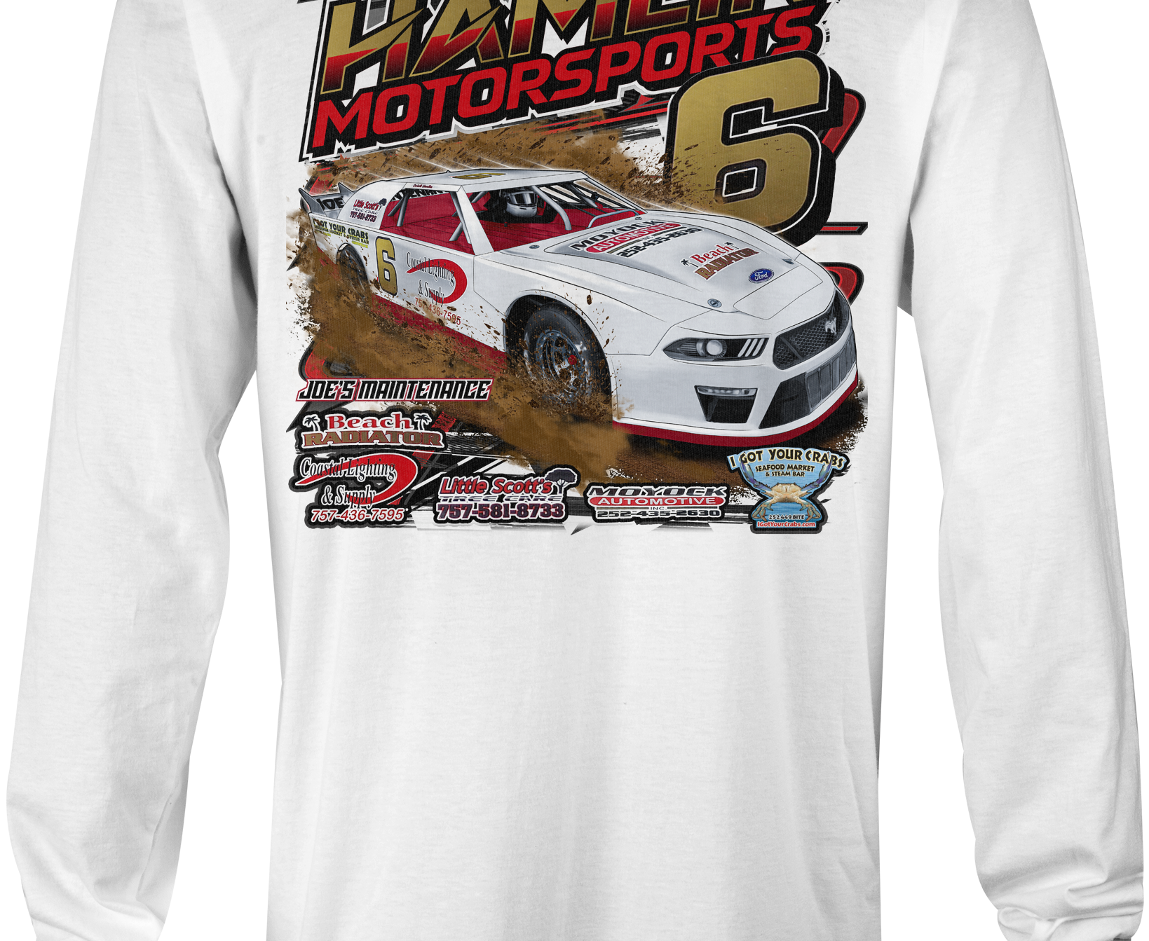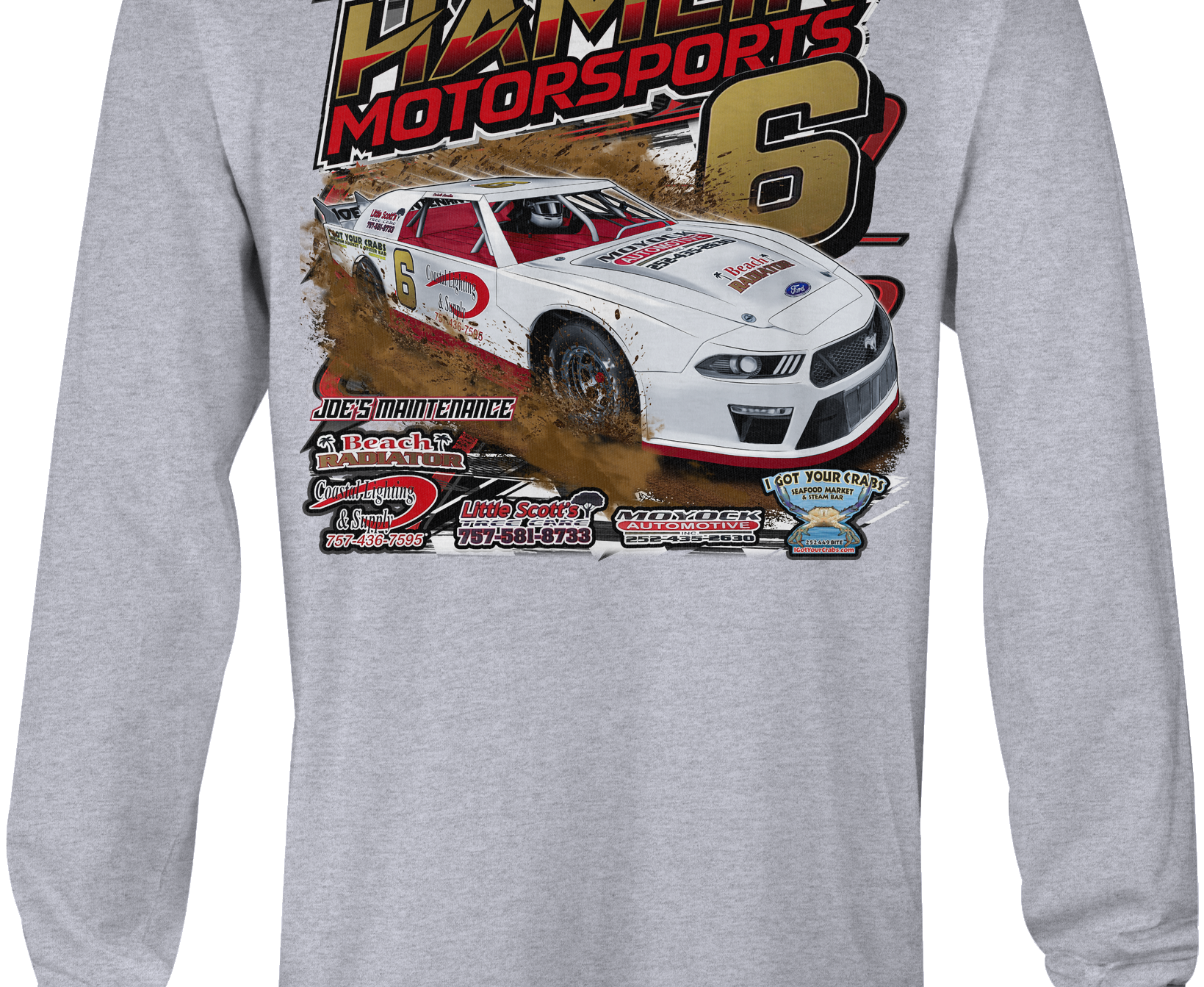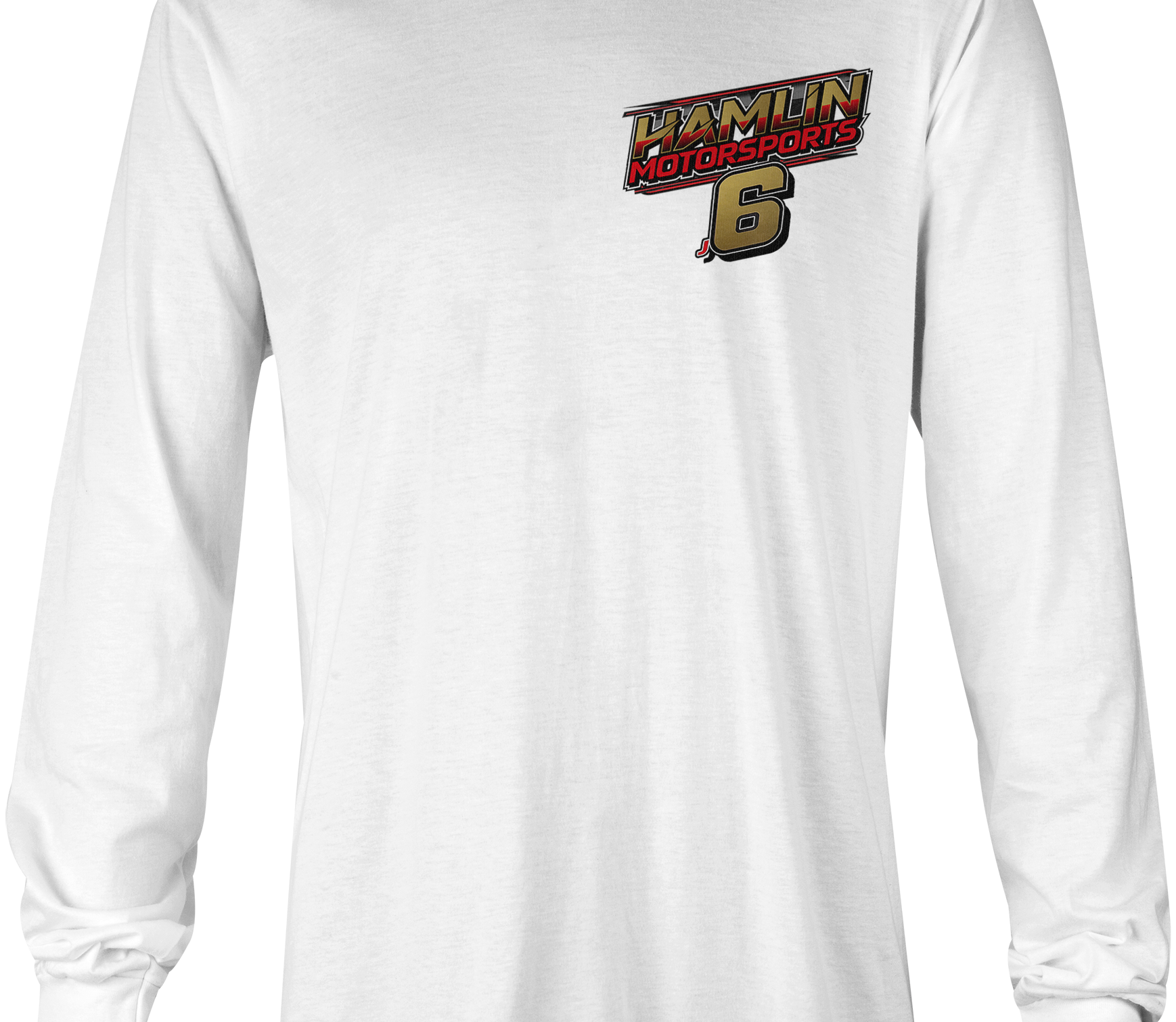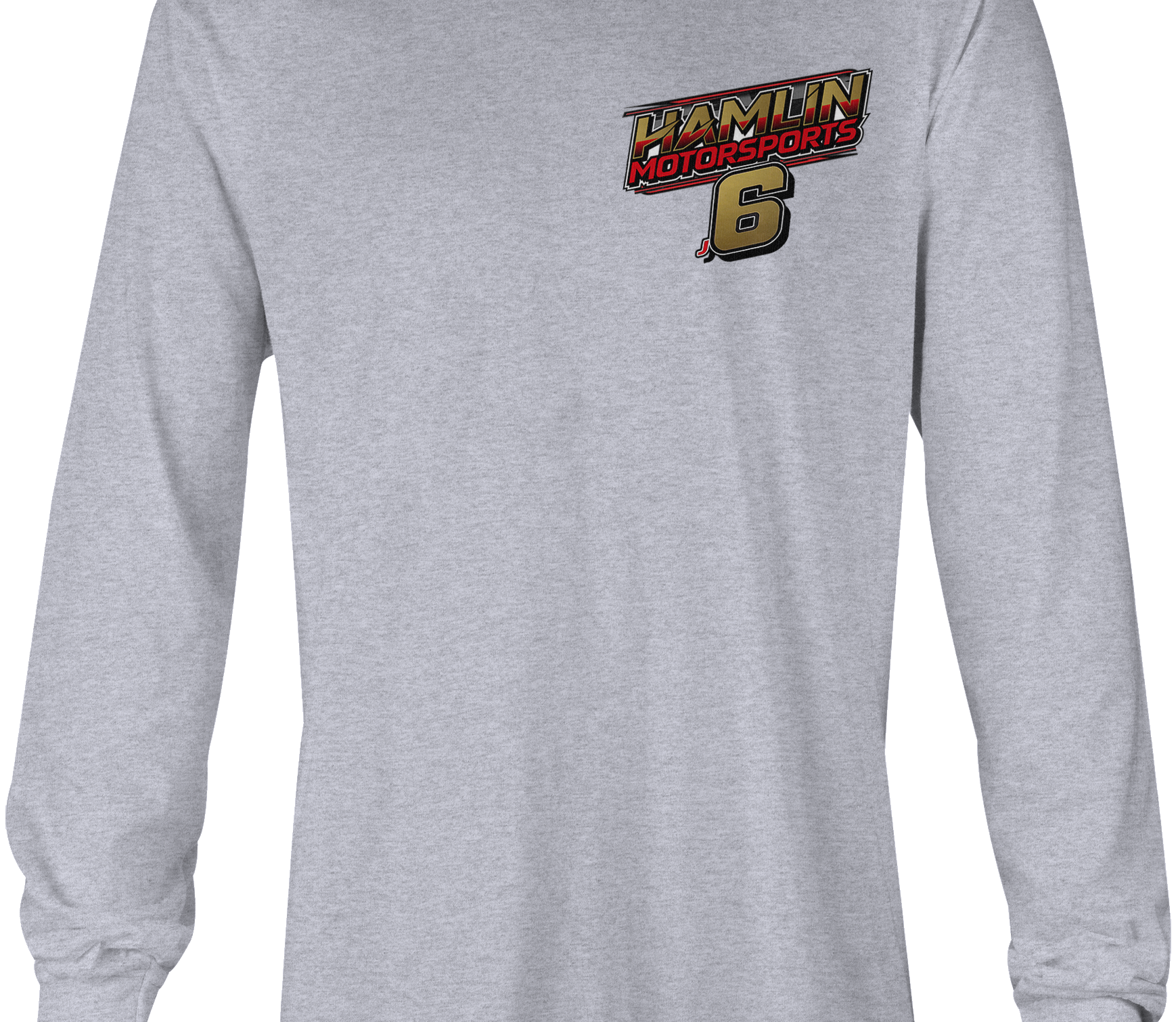 Support Hamlin Motorsports with their custom apparel! Available in Black, Sports Gray and White. Graphics are direct to garment printed with a left chest image and a full back image.