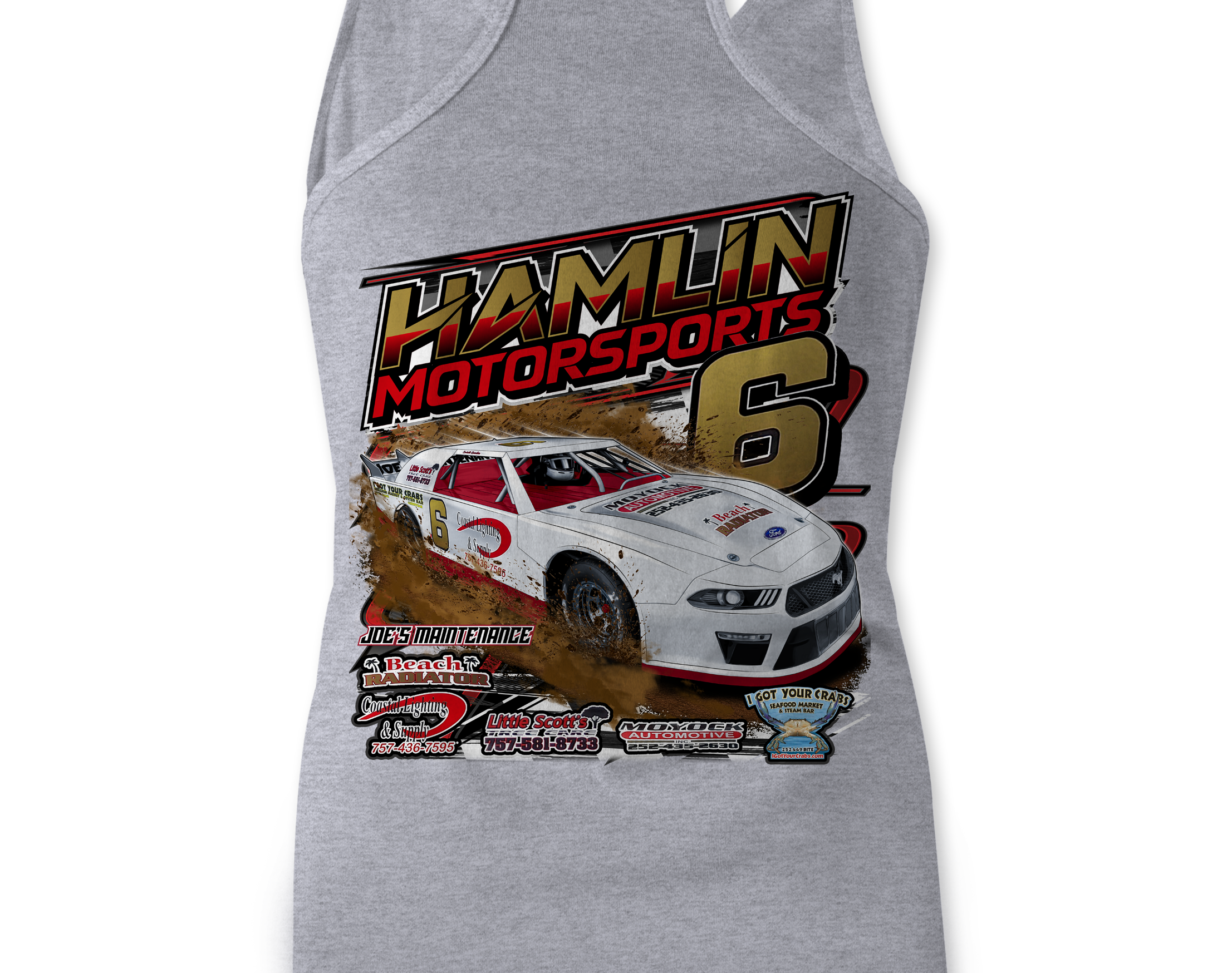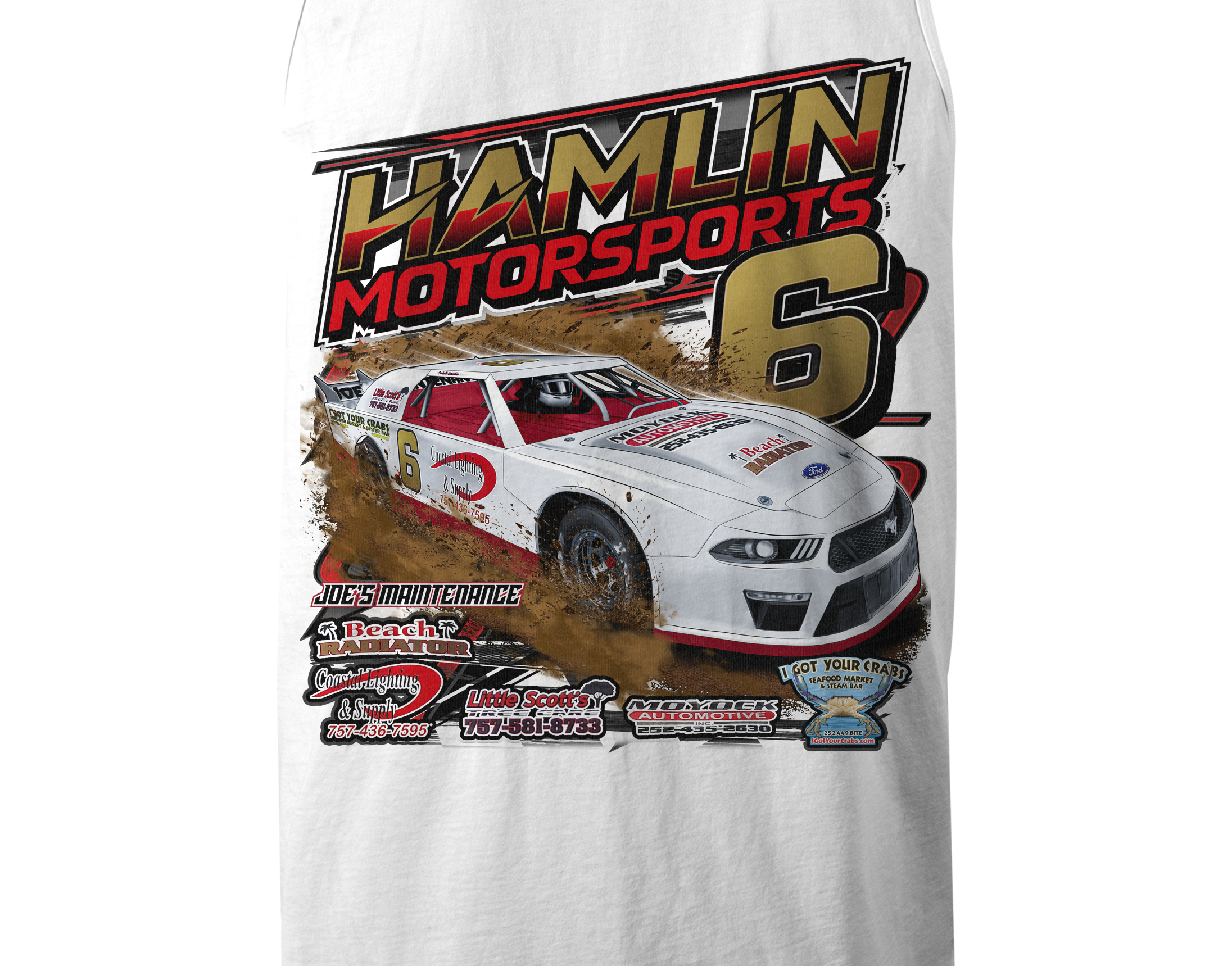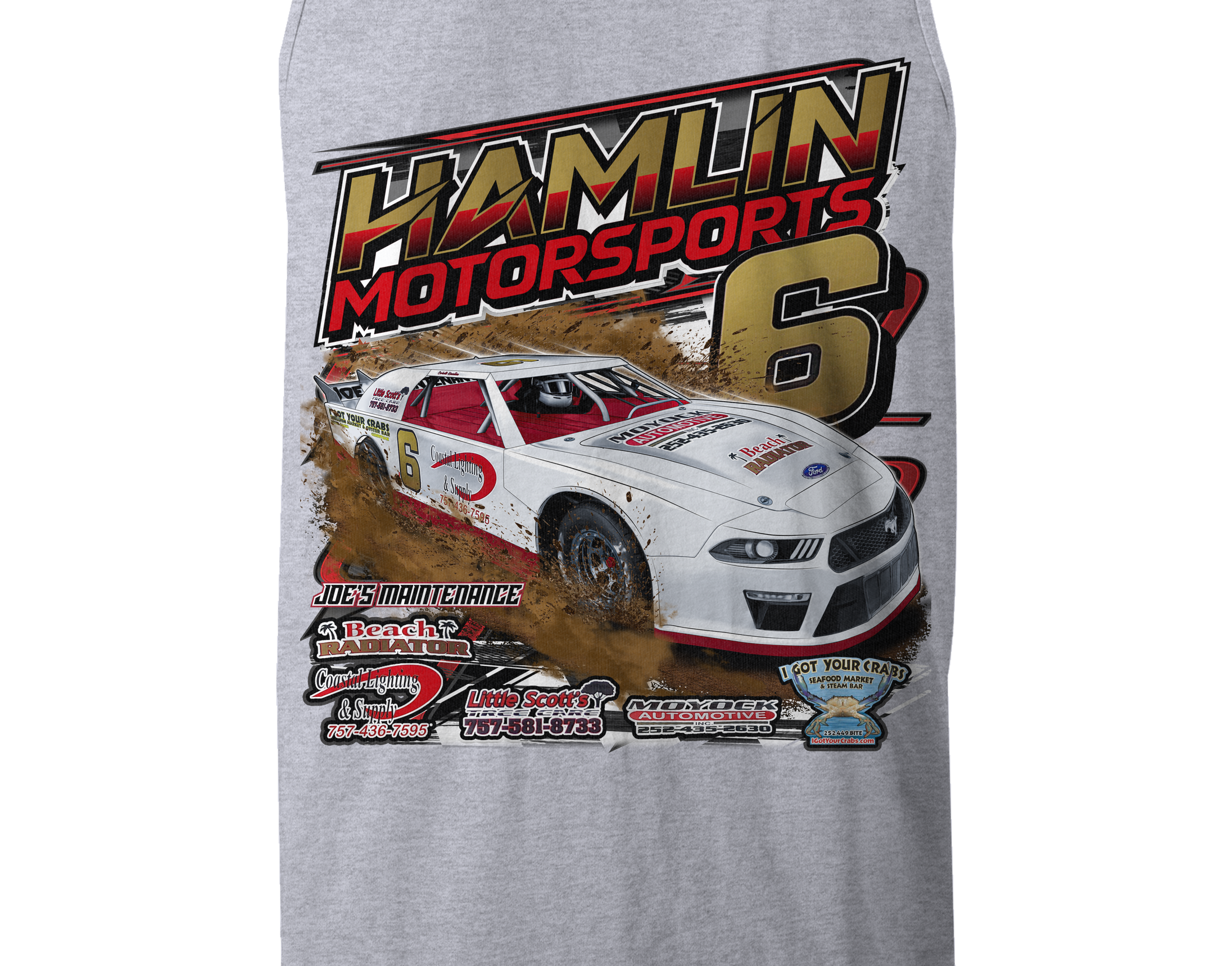 Support Hamlin Motorsports with their custom apparel! Available in Black, Sports Gray and White. Graphics are direct to garment printed with a left chest image and a full back image.
