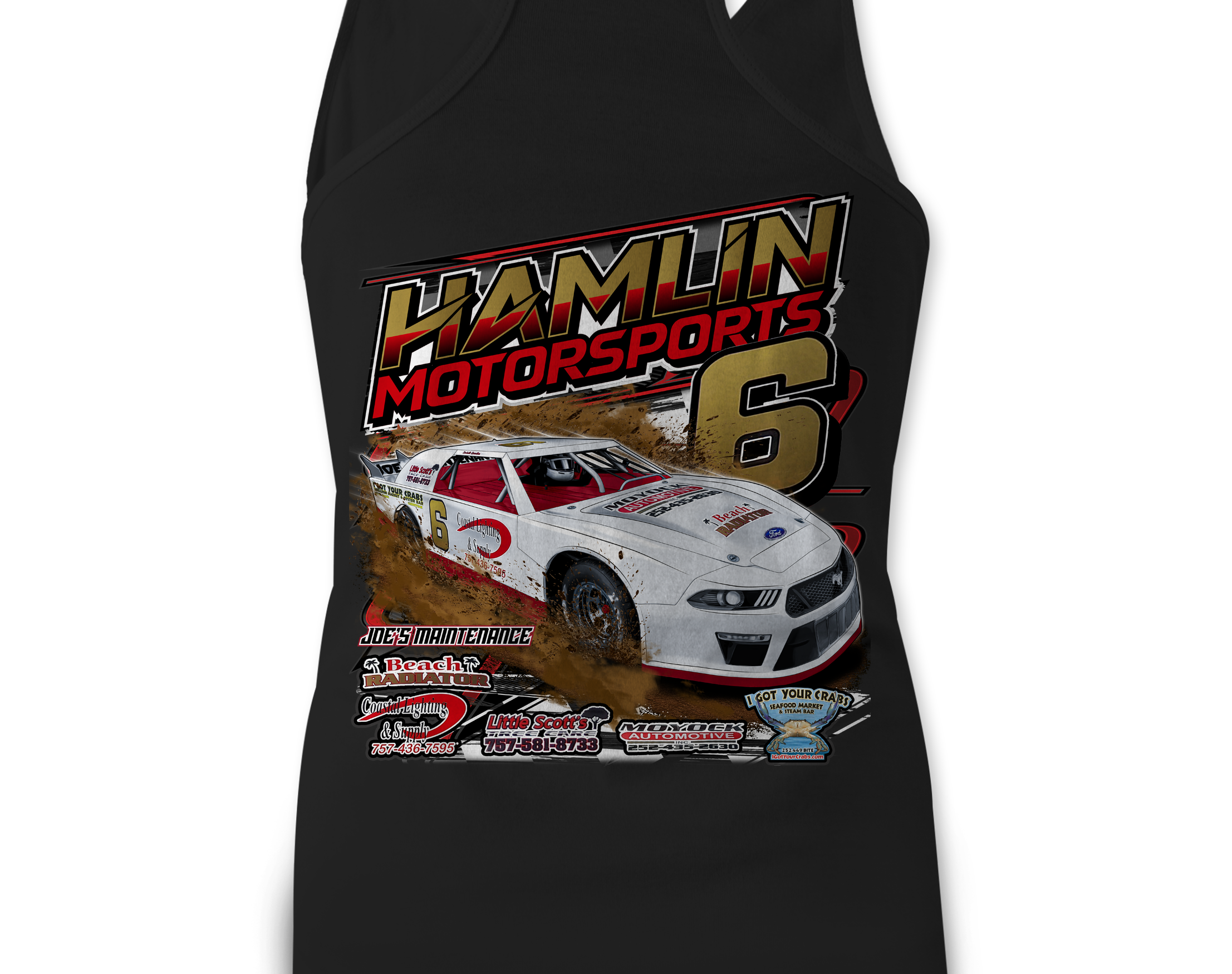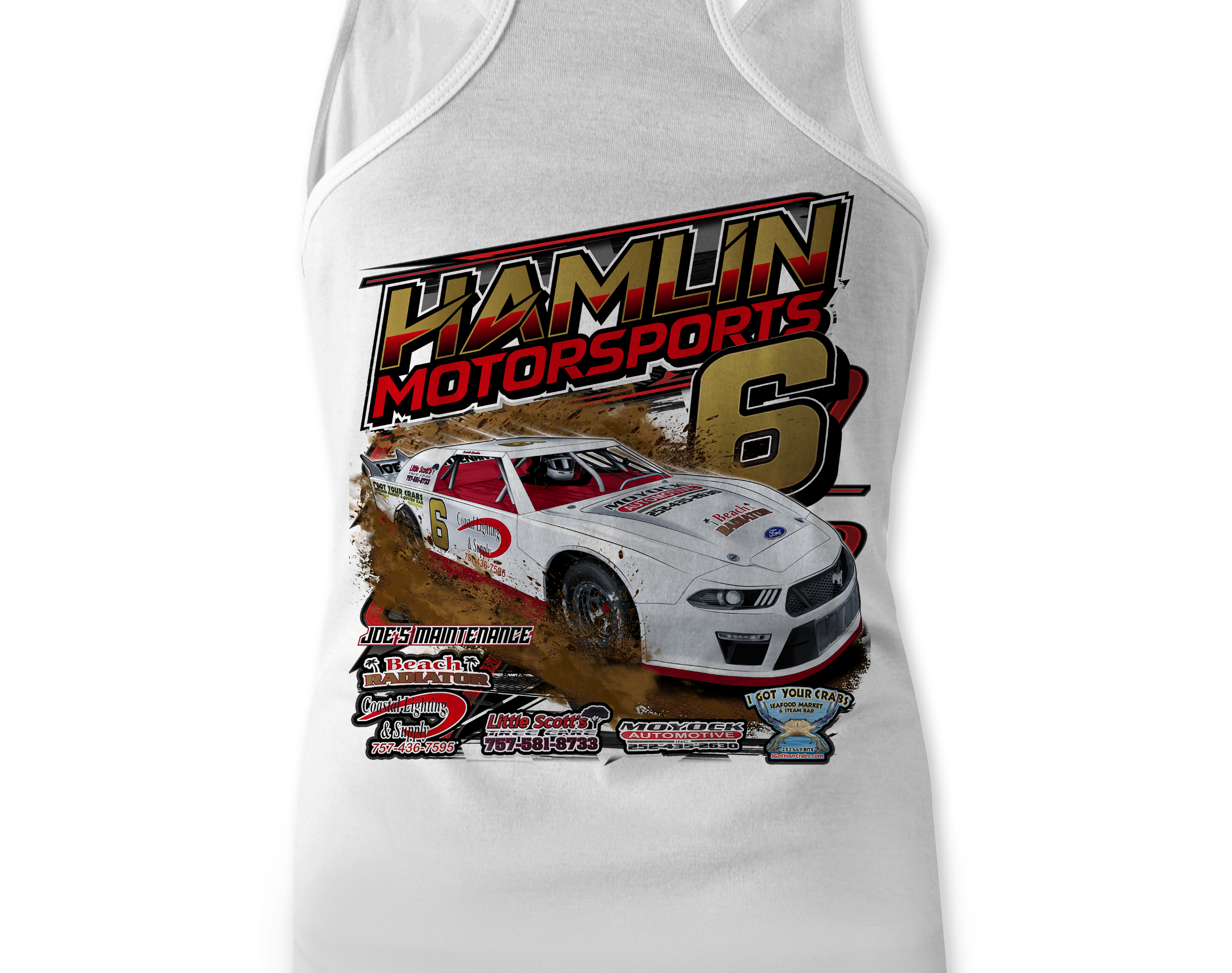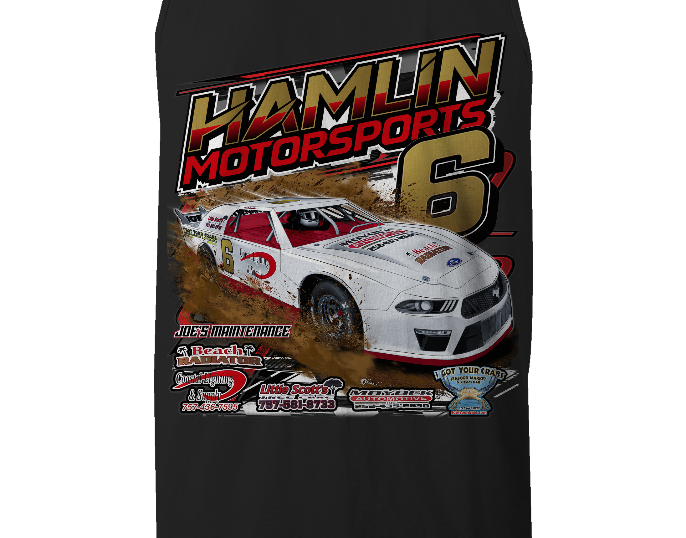 Support Hamlin Motorsports with their custom apparel! Available in Black, Sports Gray and White. Graphics are direct to garment printed with a left chest image and a full back image.