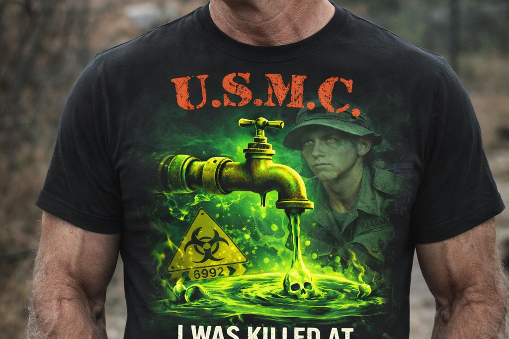This design leans into symbolism rather than explanation: toxic water, hazard markings, and the unmistakable presence of the Marine Corps. It’s meant to be worn by those who understand — and noticed by those who do.