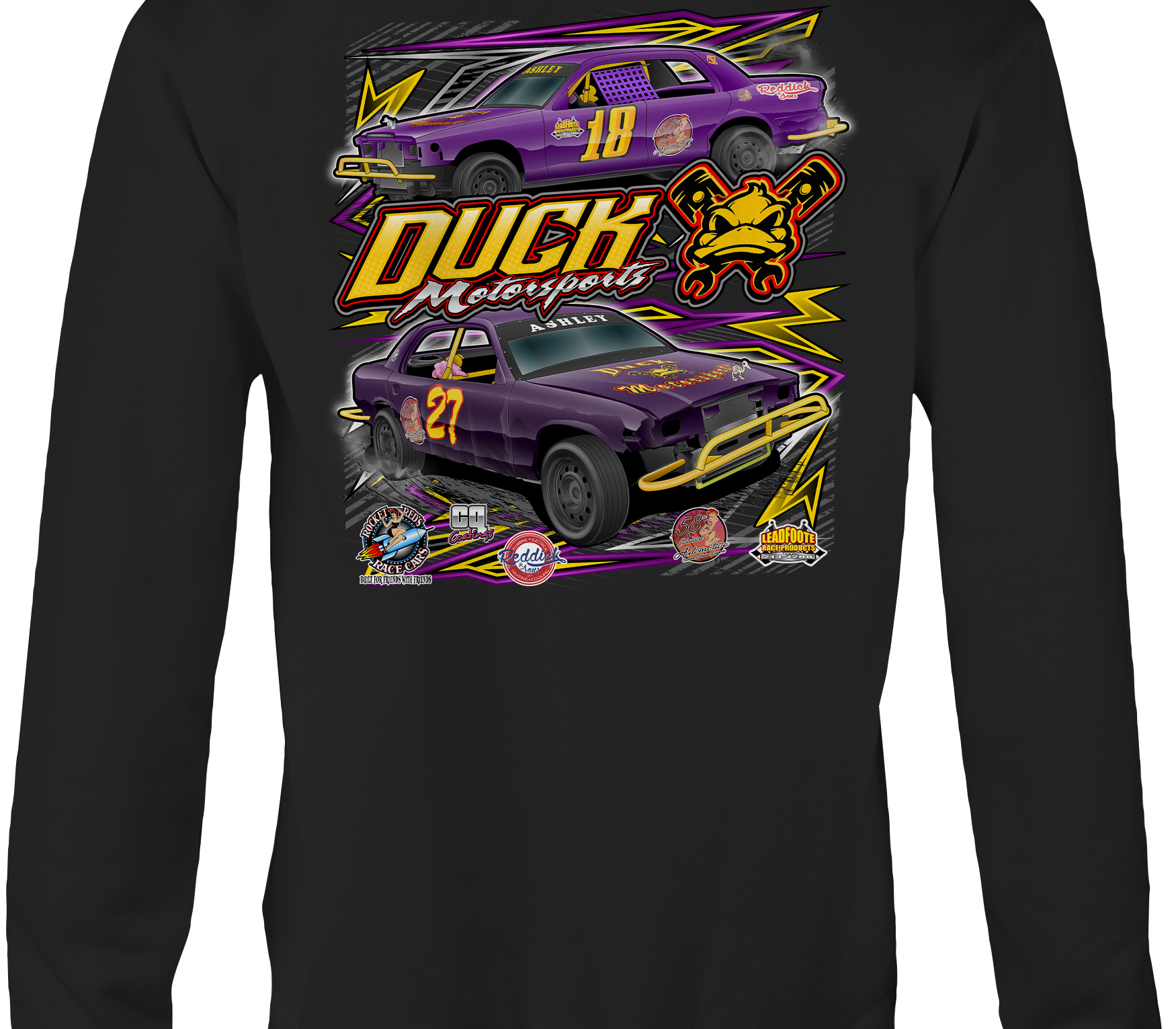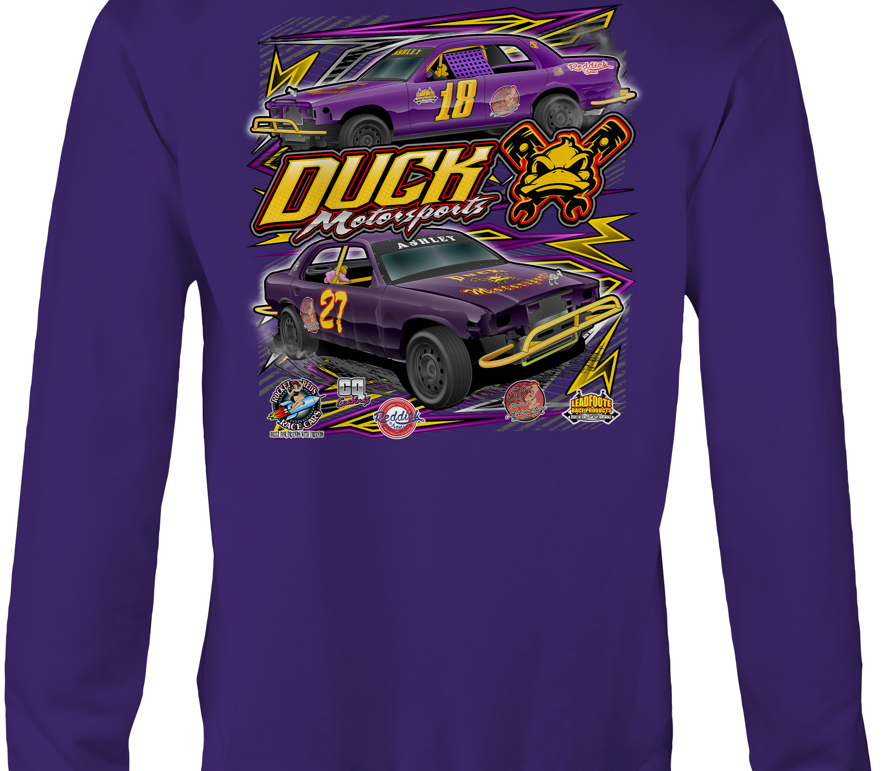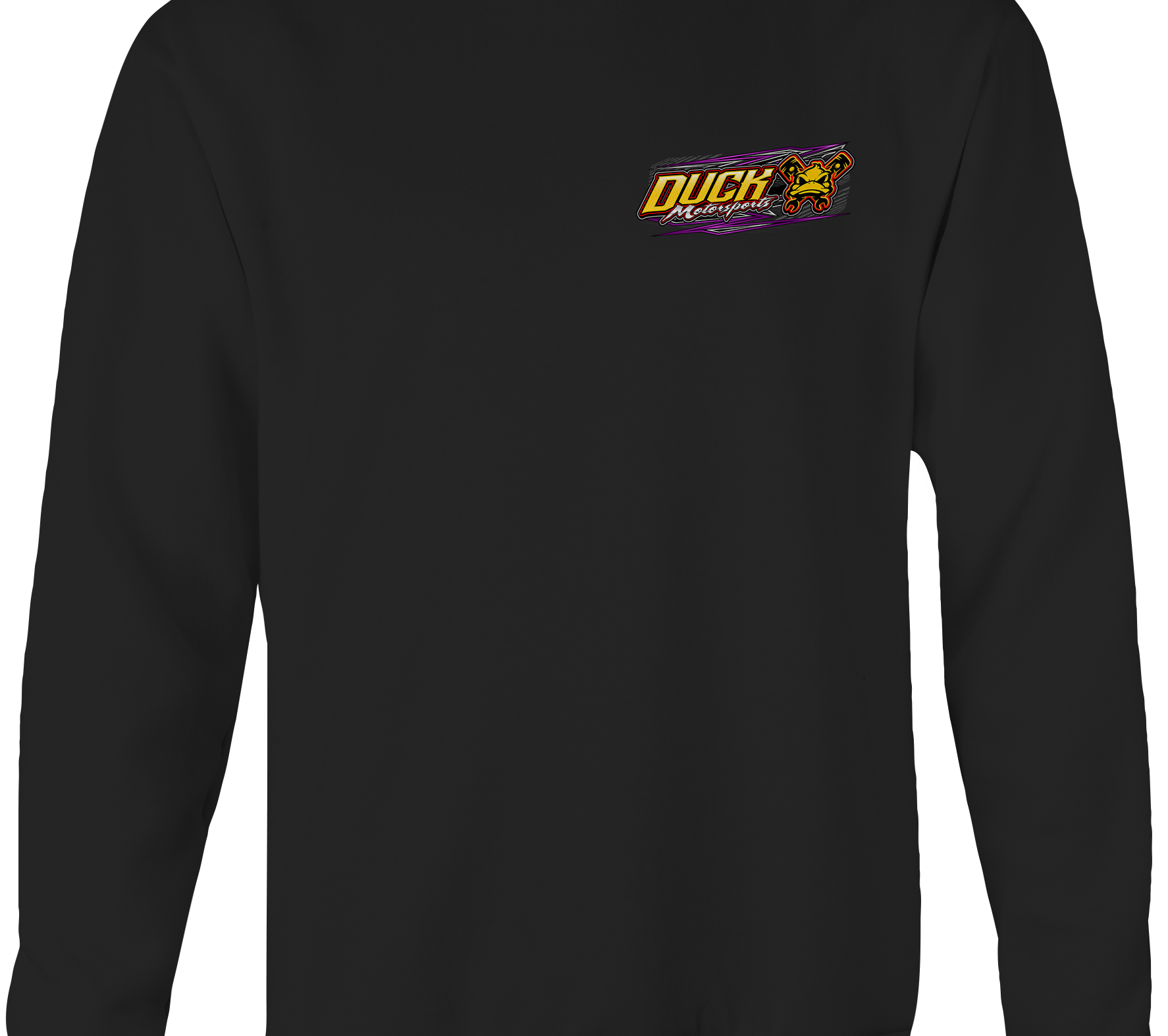 Support Duck Motorsports with their custom apparel! Available in Black, Sports Gray, Purple, Yellow and White. Graphics are direct to garment printed with a left chest image and a full back image.
