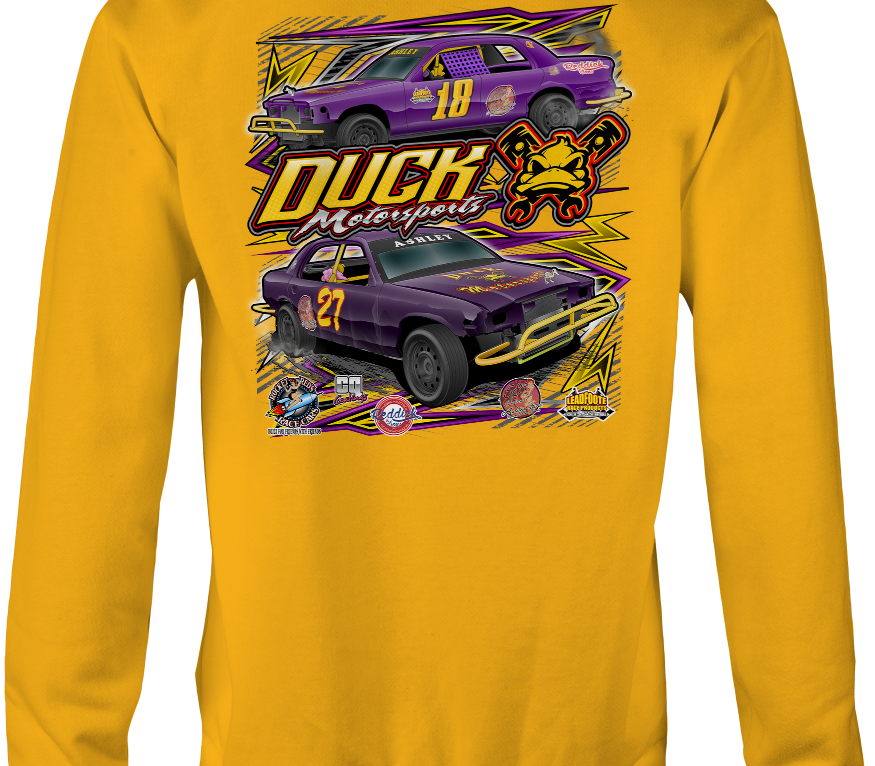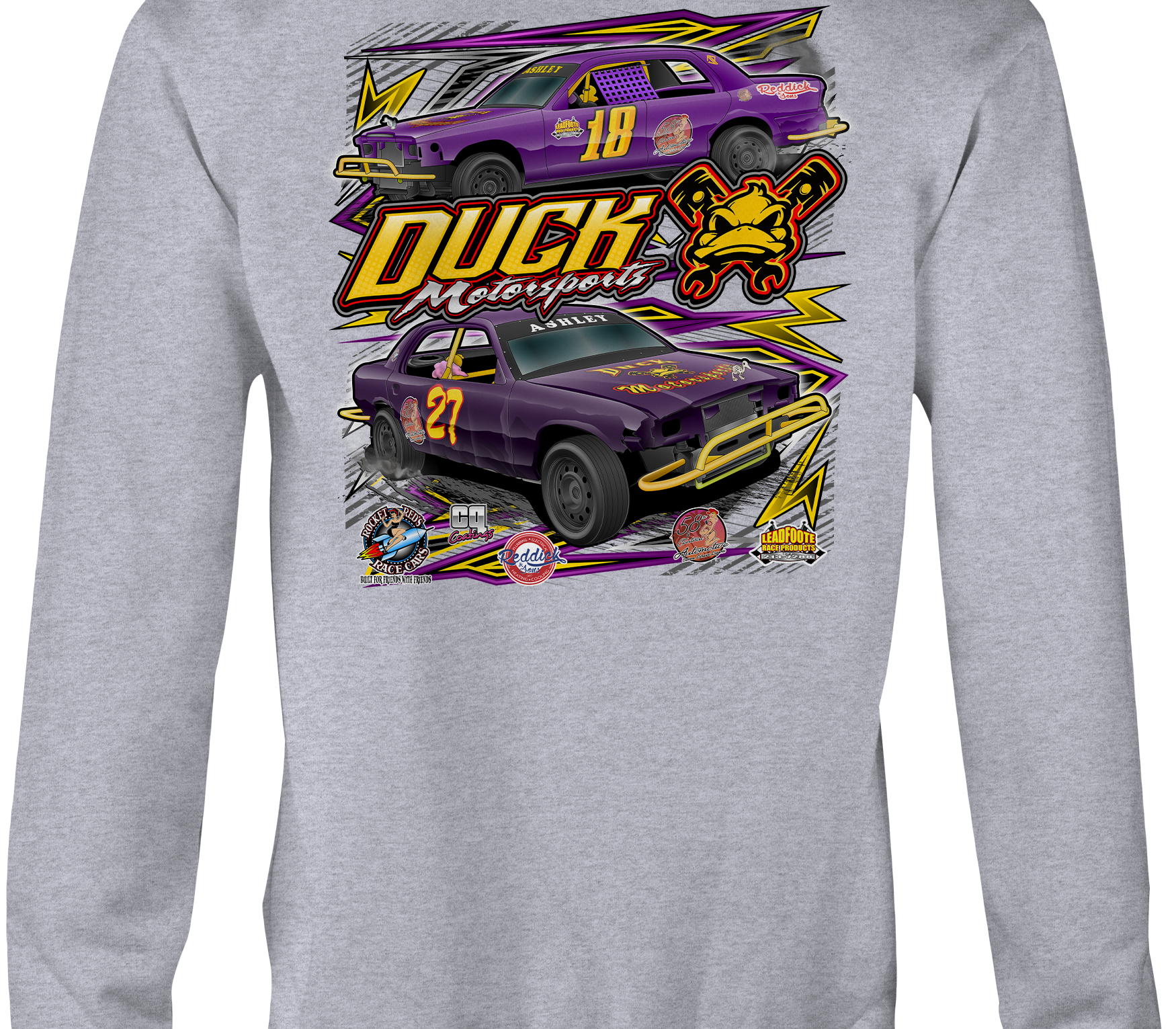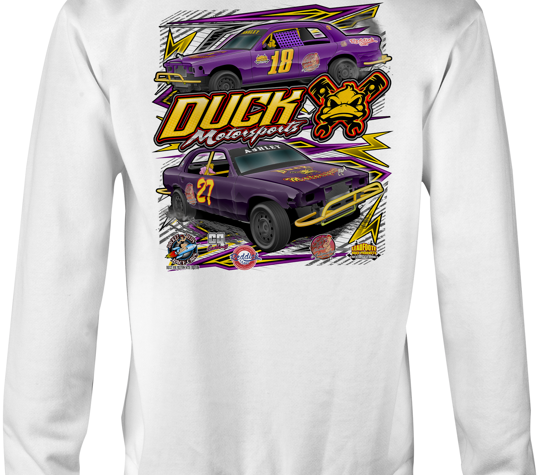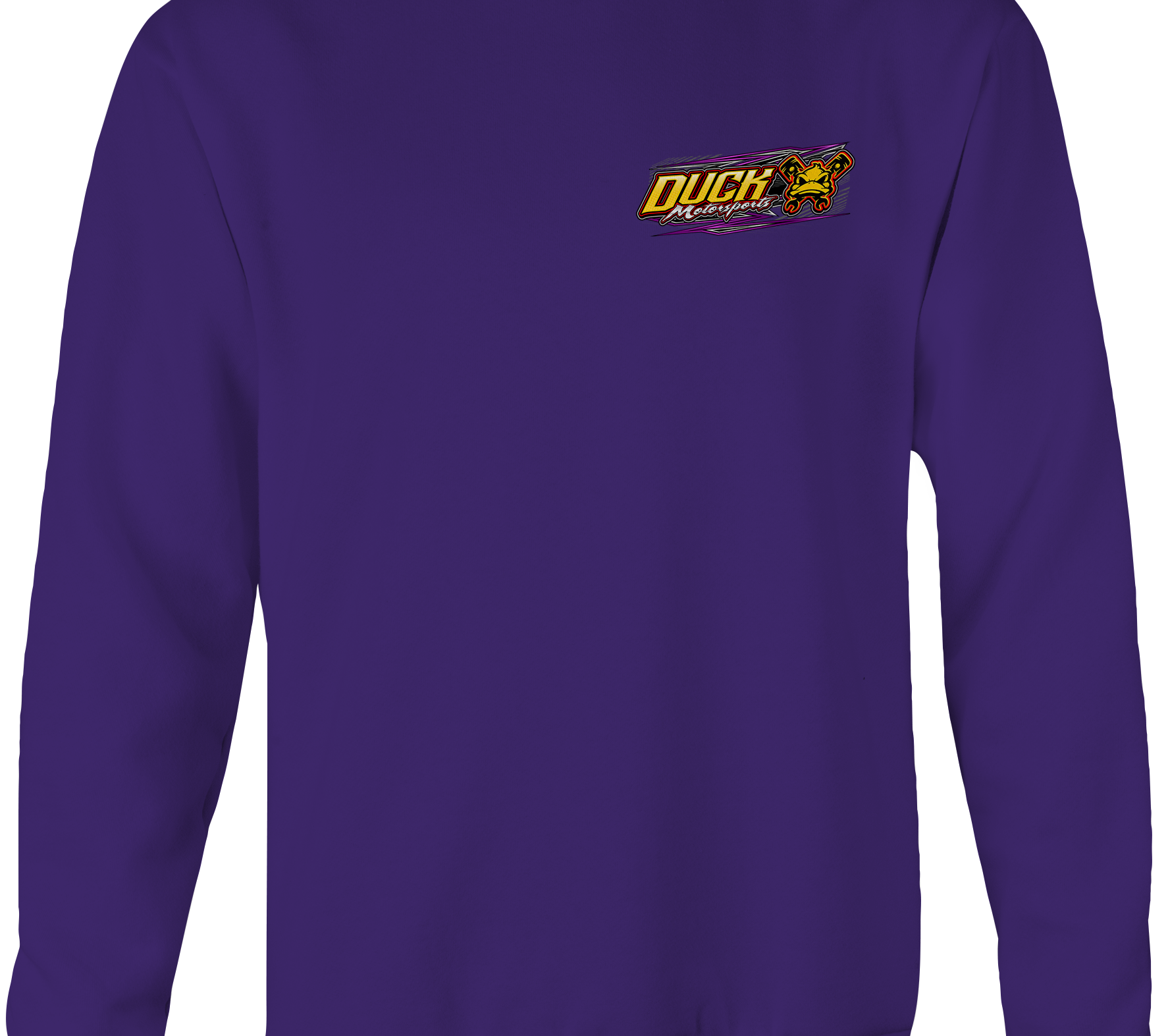 Support Duck Motorsports with their custom apparel! Available in Black, Sports Gray, Purple, Yellow and White. Graphics are direct to garment printed with a left chest image and a full back image.
