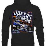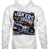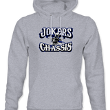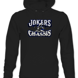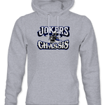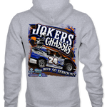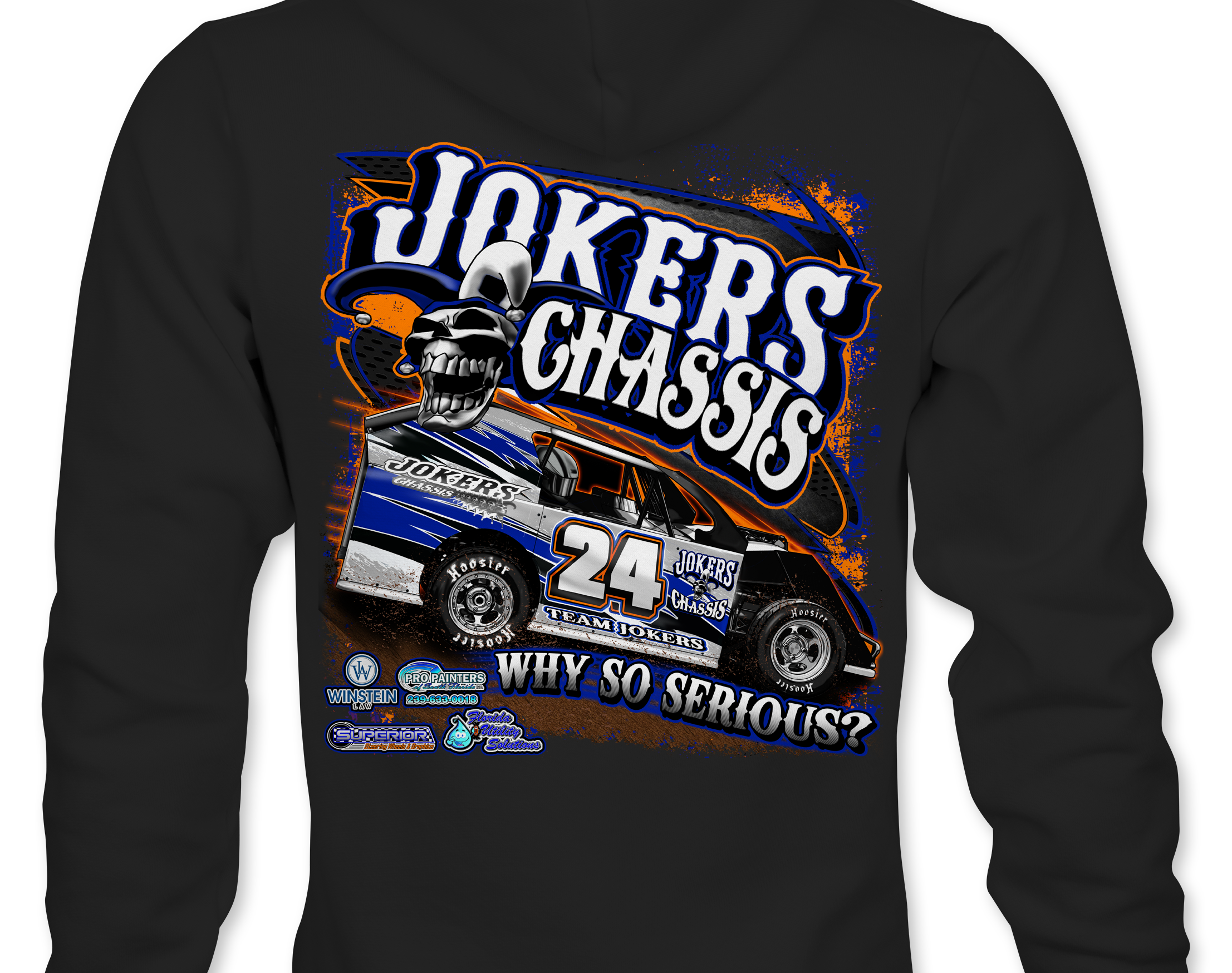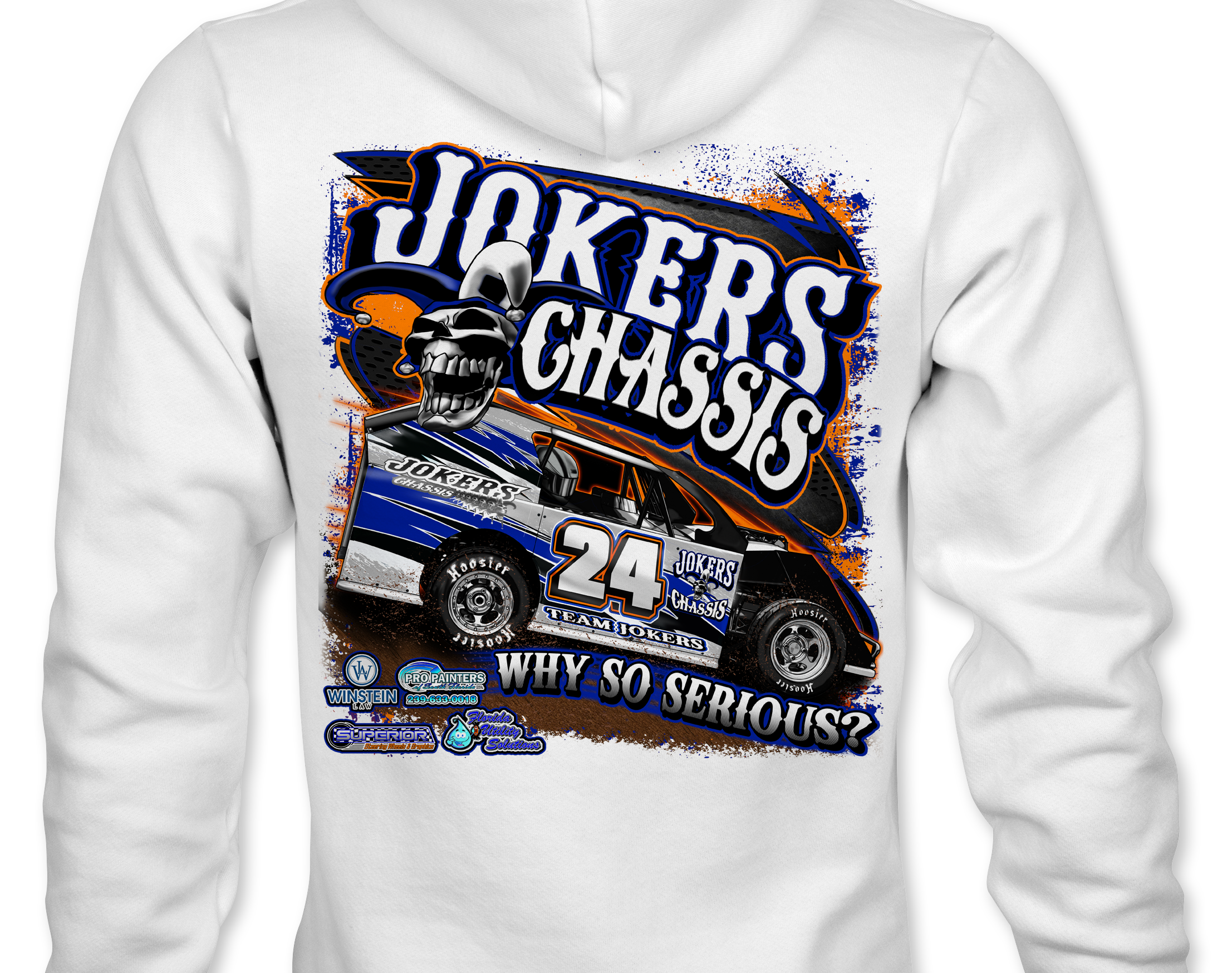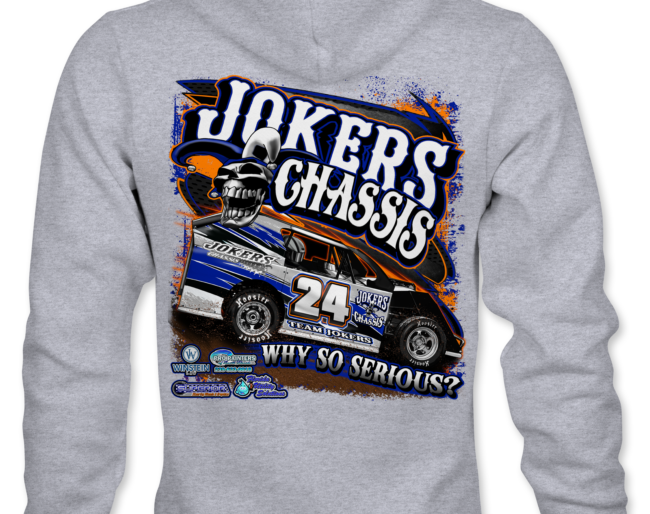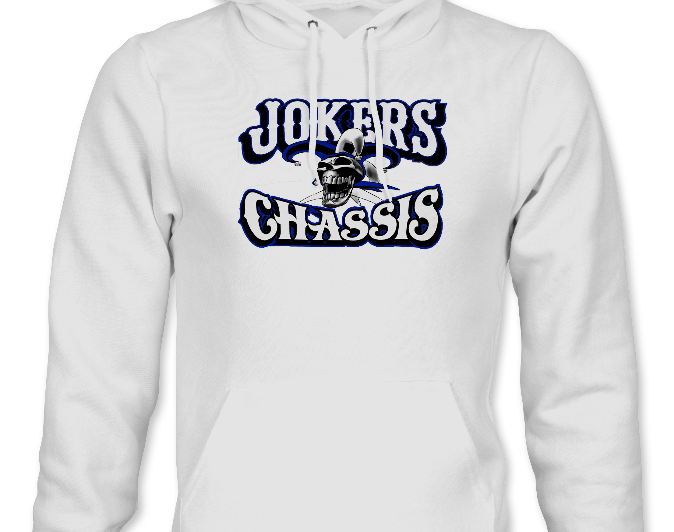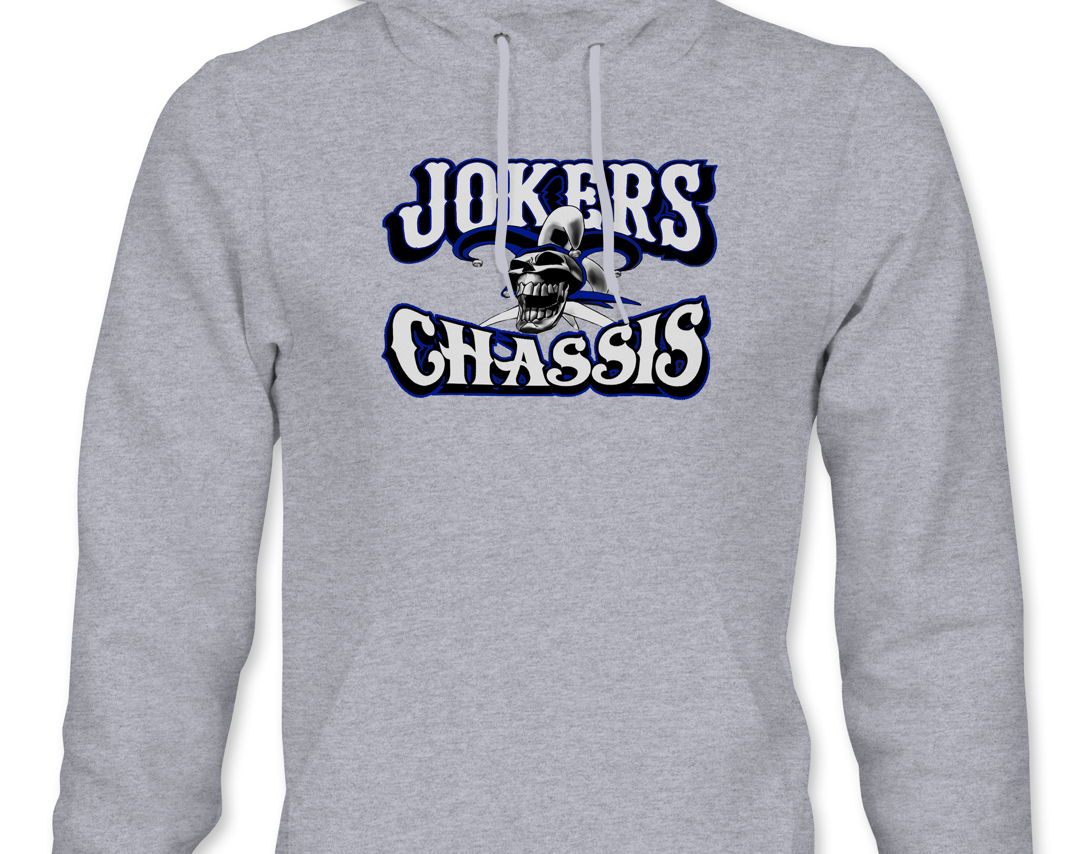 Support Jokers Chassis with their custom apparel!  Available in Black, Sports Gray and White. Graphics are direct to garment printed with a left chest image and a full back image.