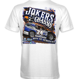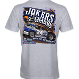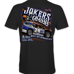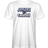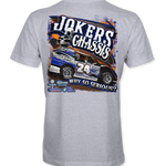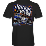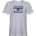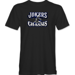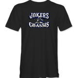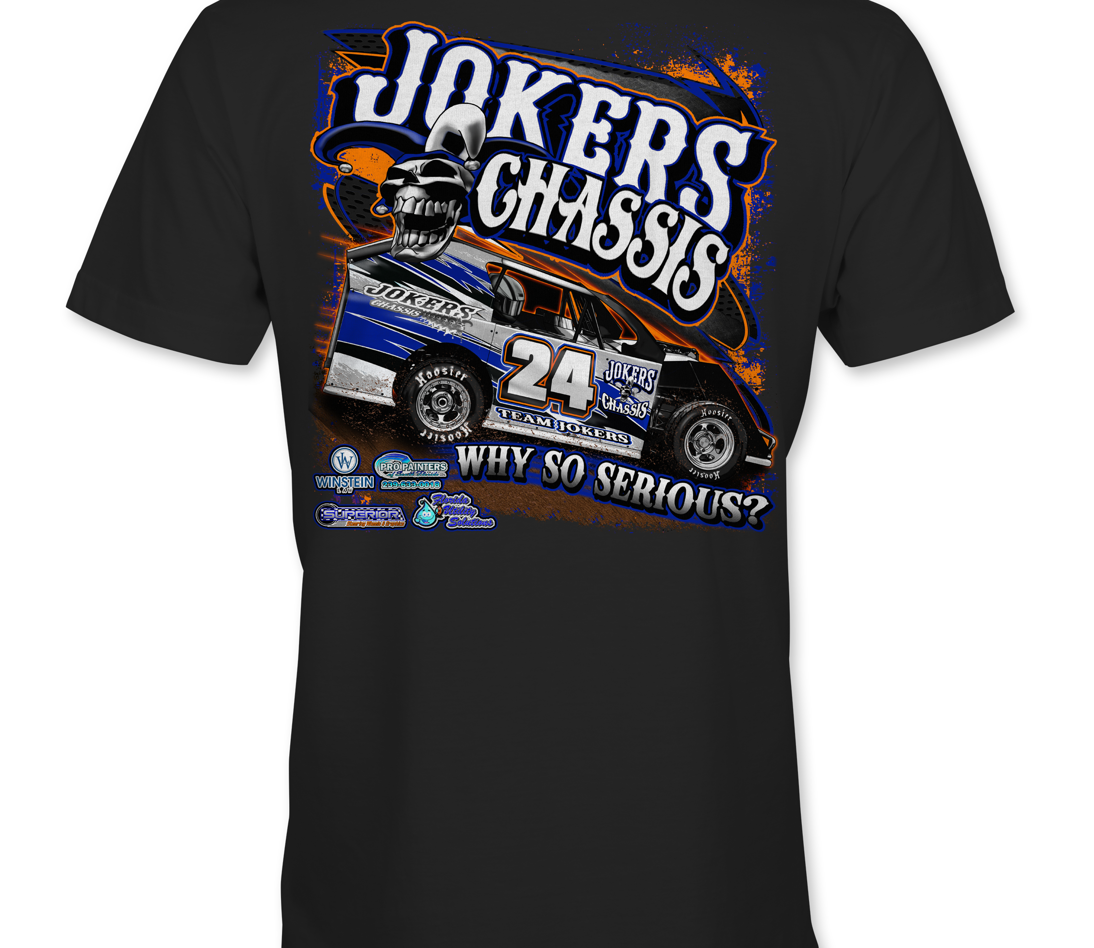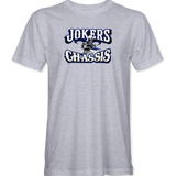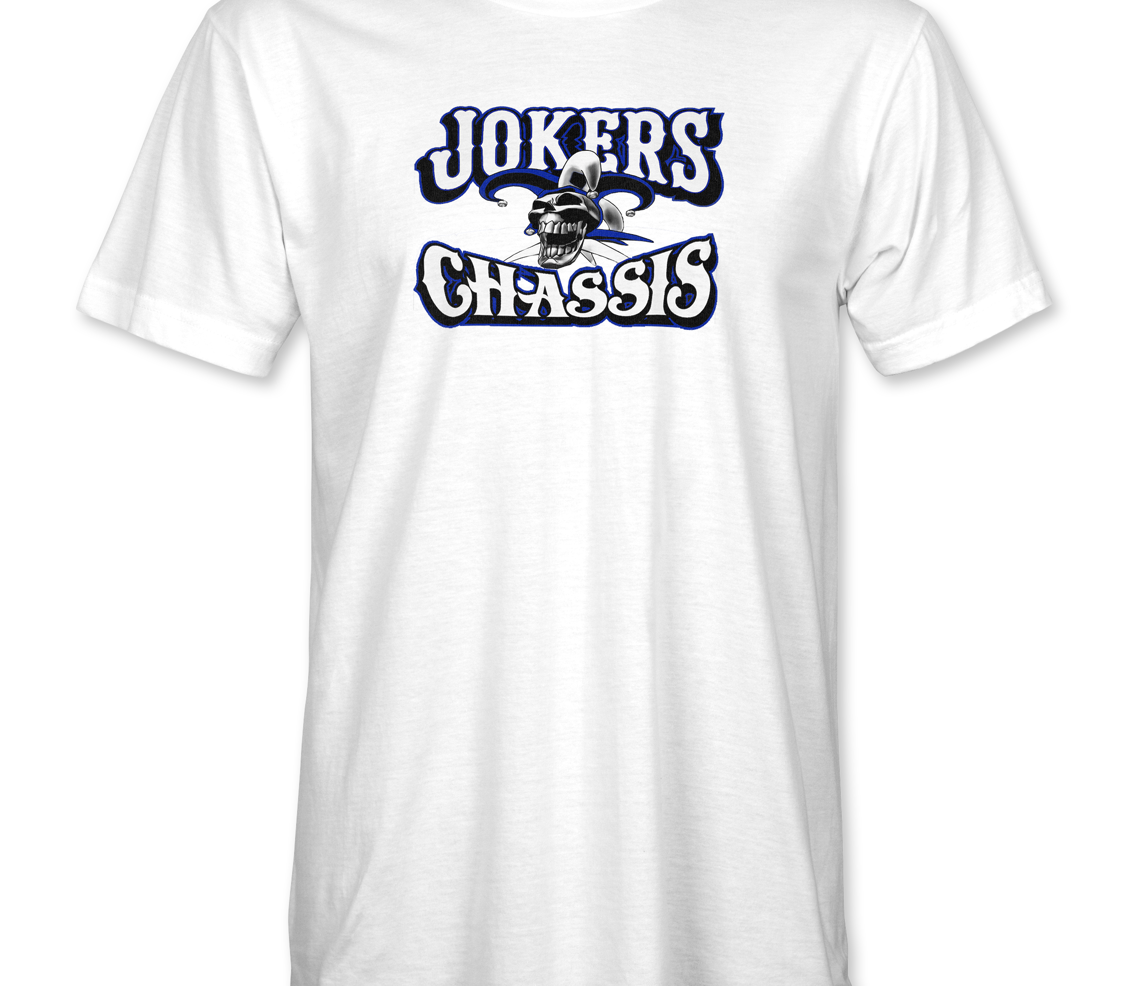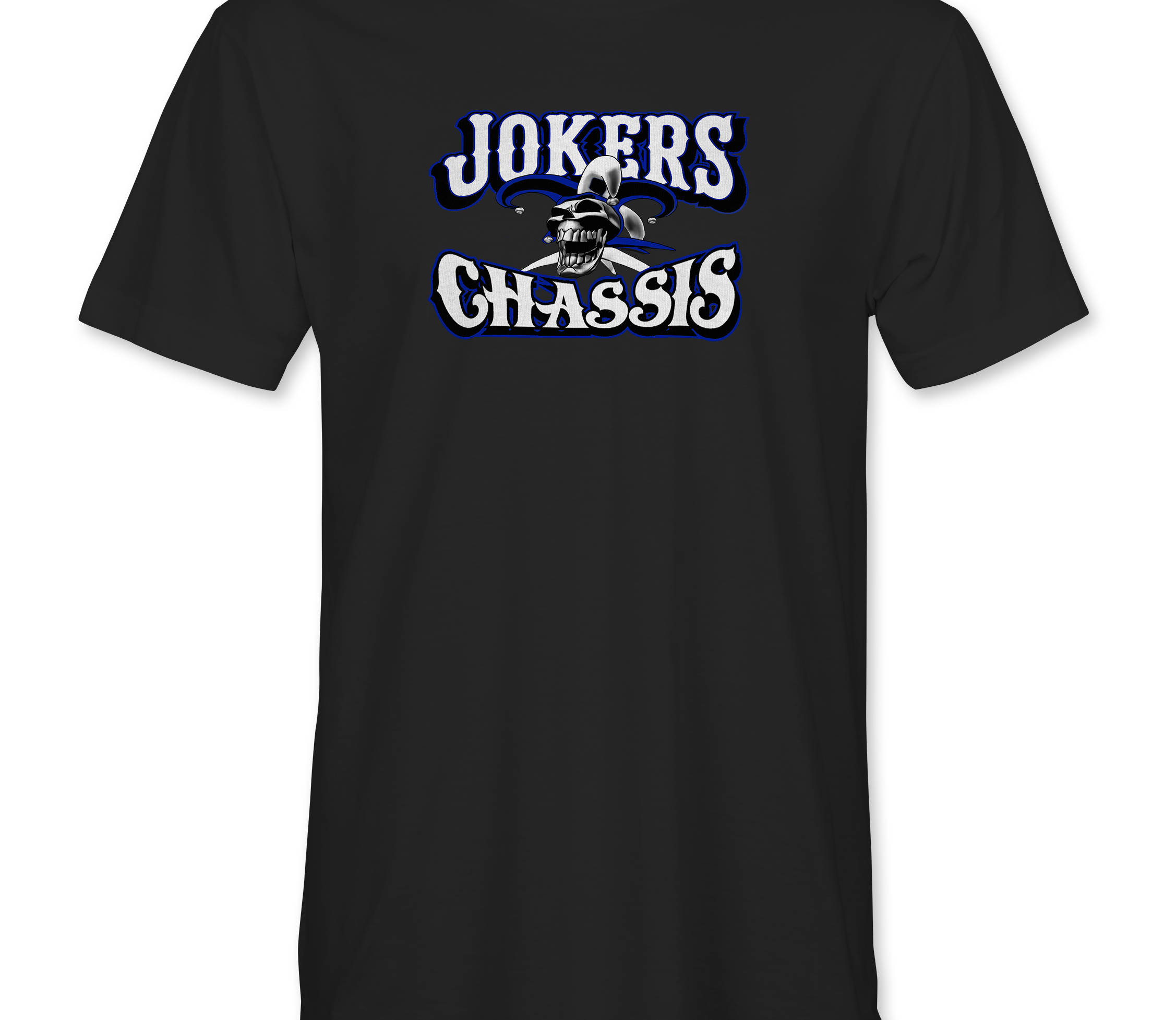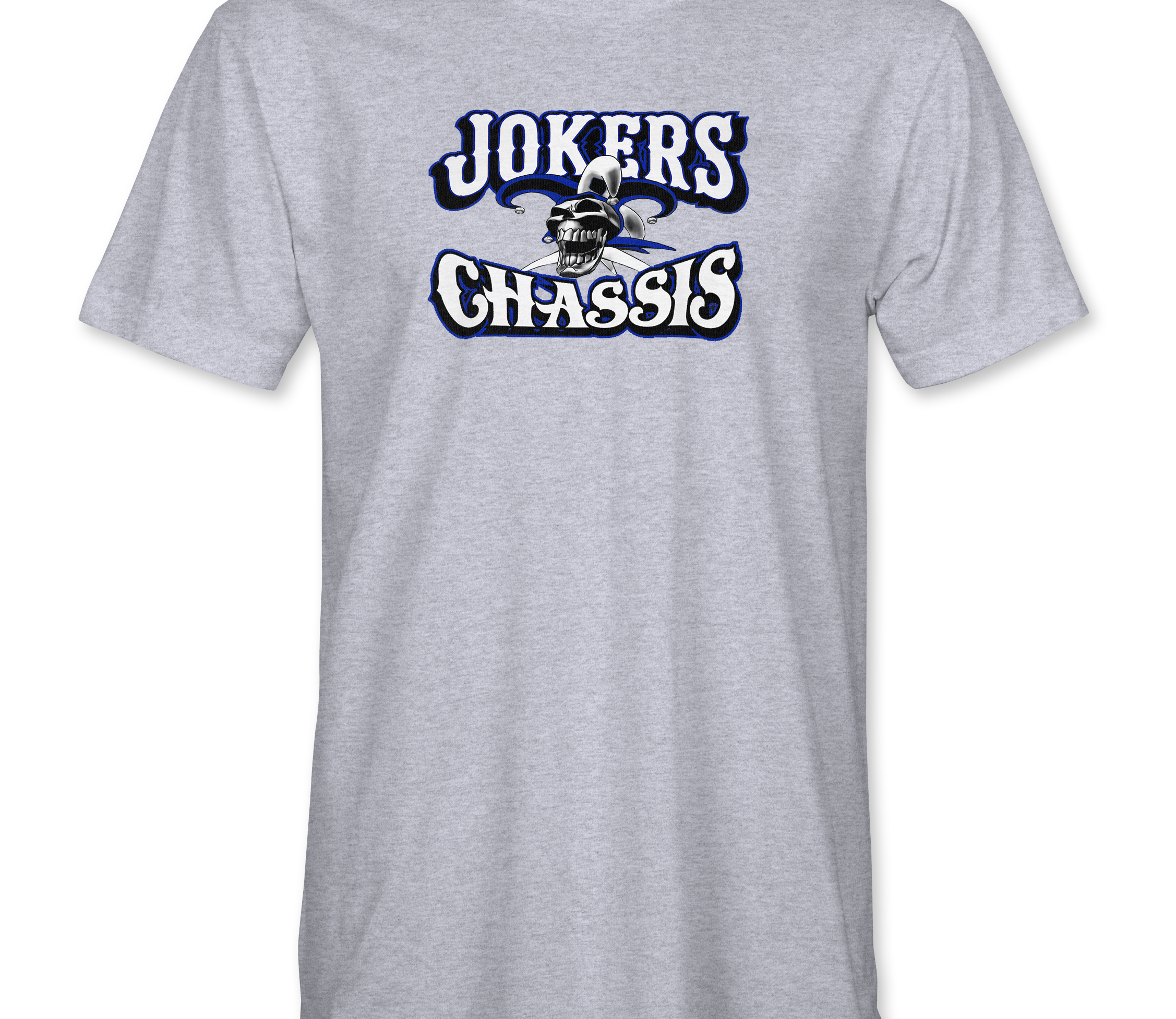 Support Jokers Chassis with their custom apparel! Available in Black, Sports Gray and White. Graphics are direct to garment printed with a left chest image and a full back image.