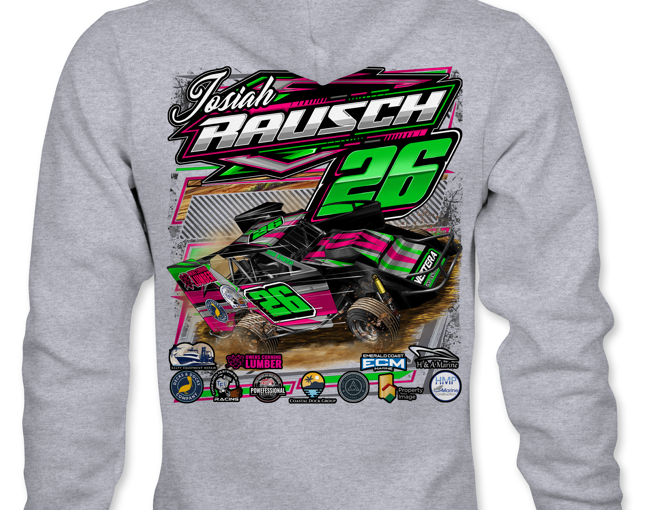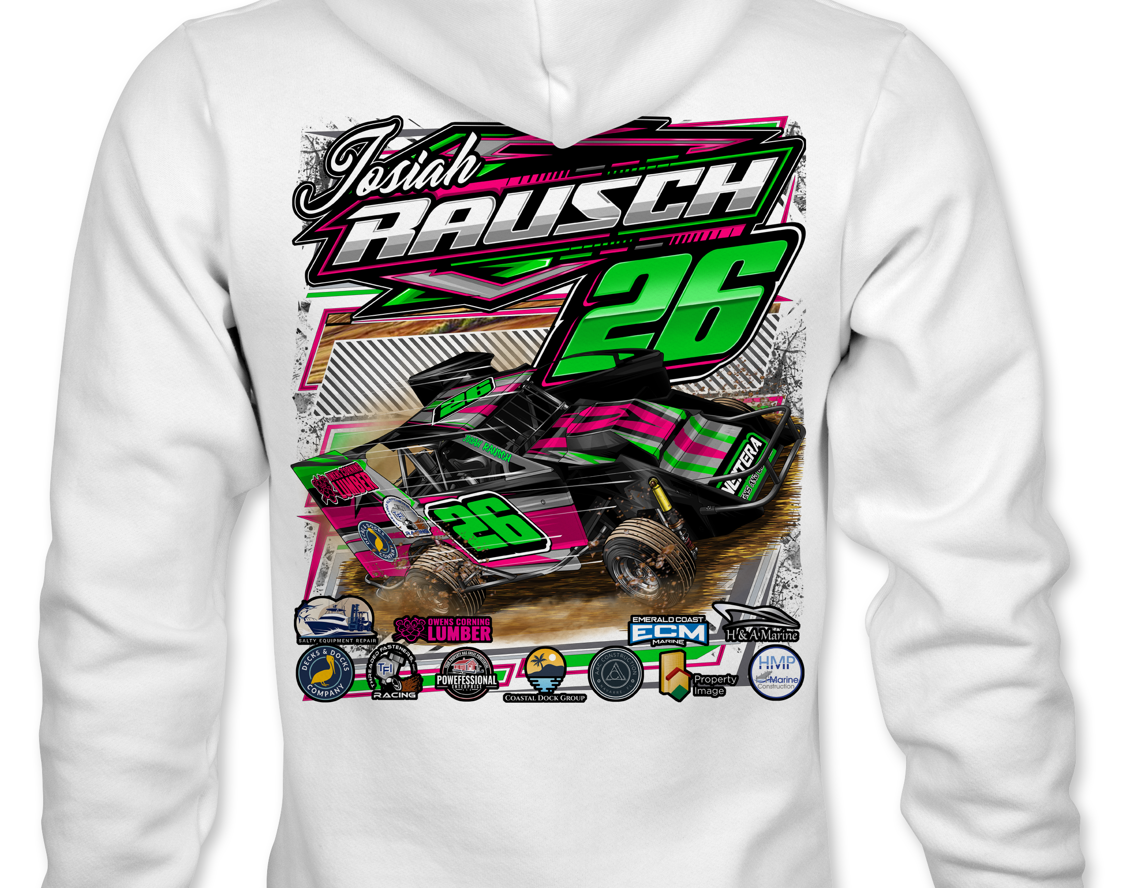 Support Josiah Rausch 2025 with their custom apparel! Available in Black, Sports Gray and White. Graphics are direct to garment printed with a left chest image and a full back image.