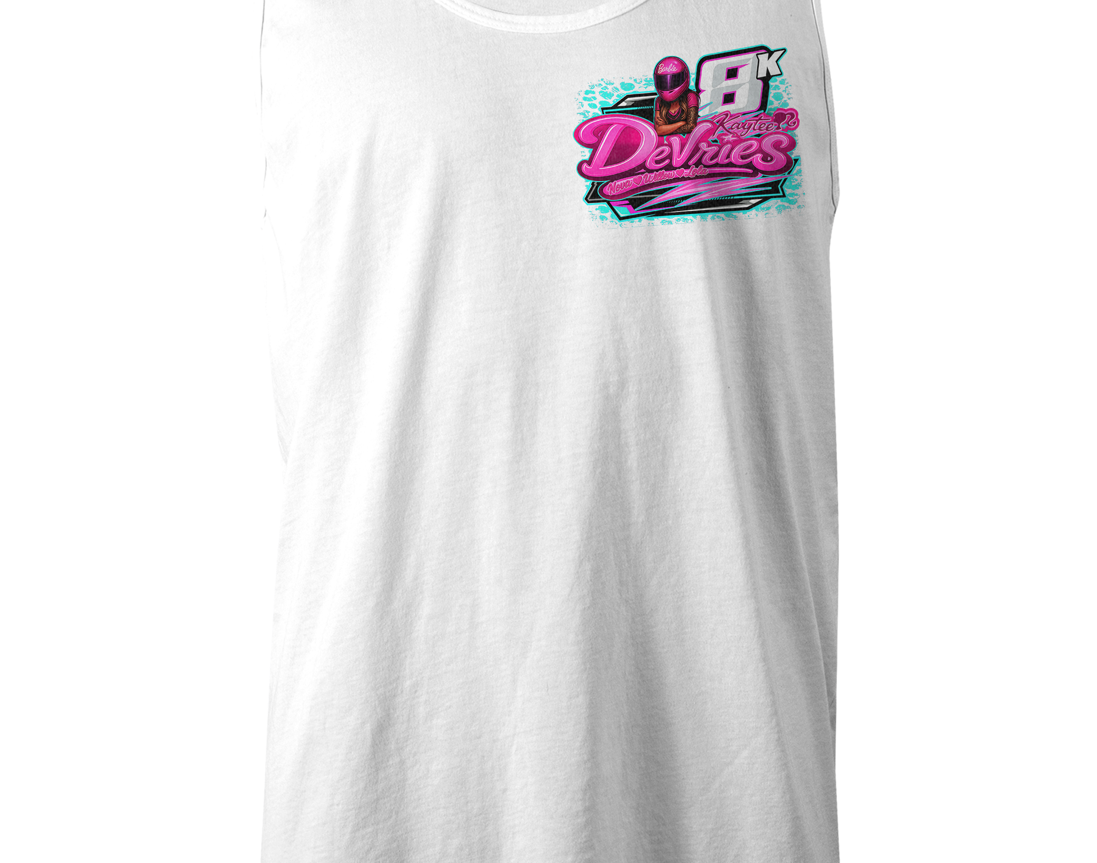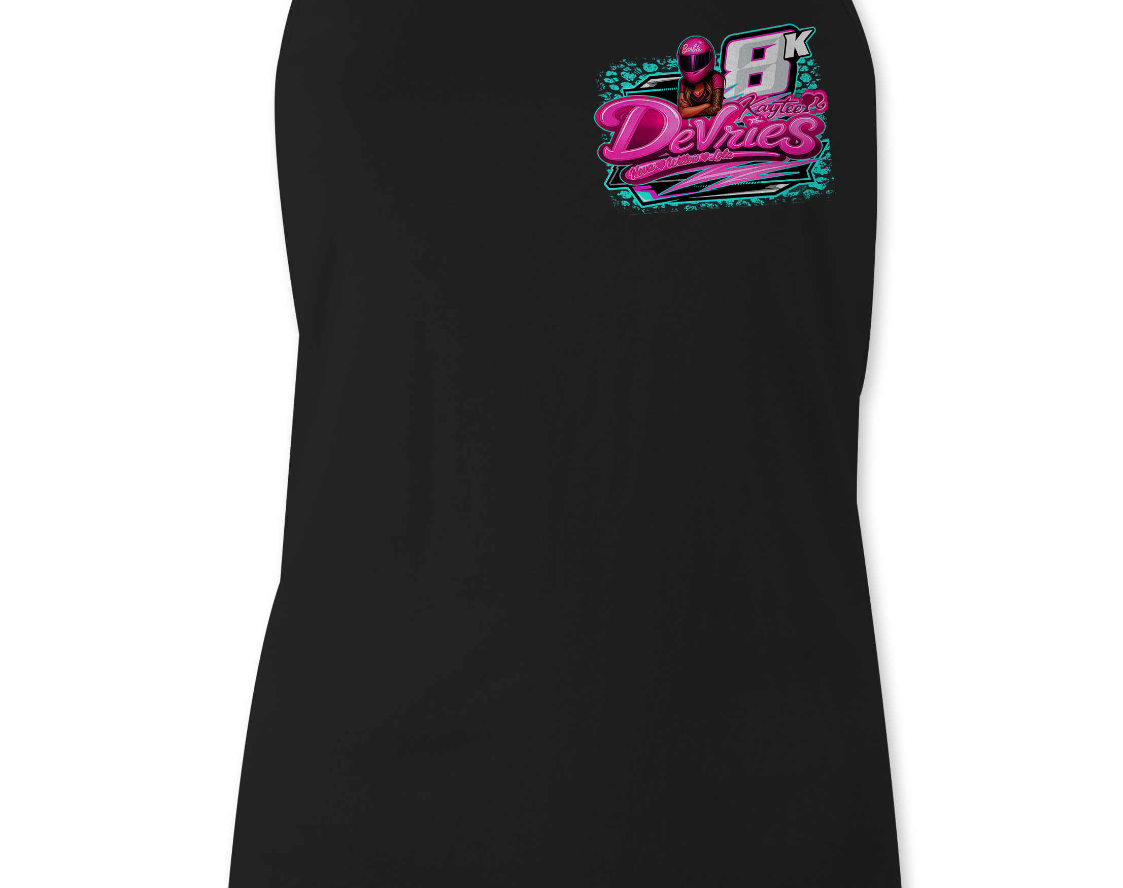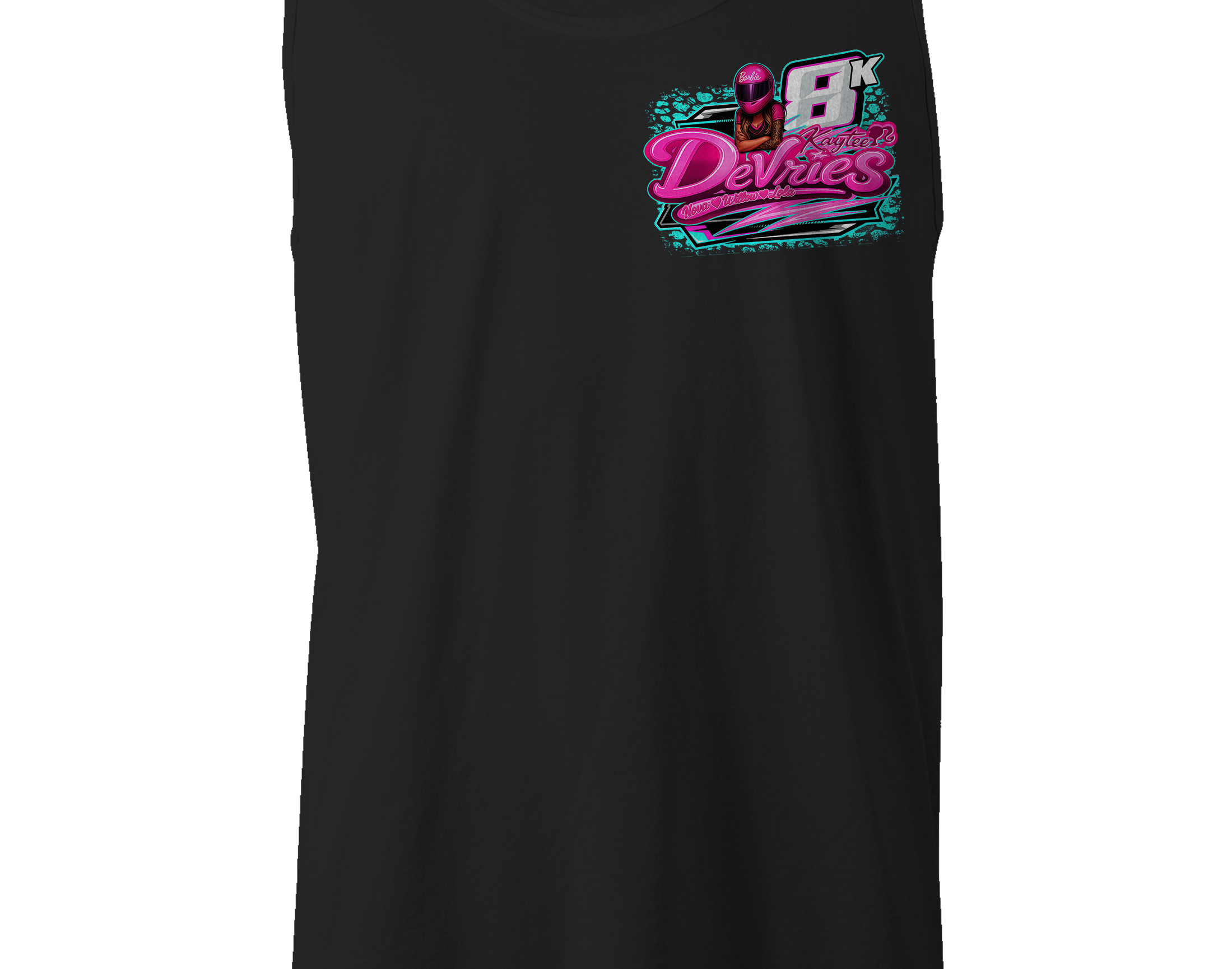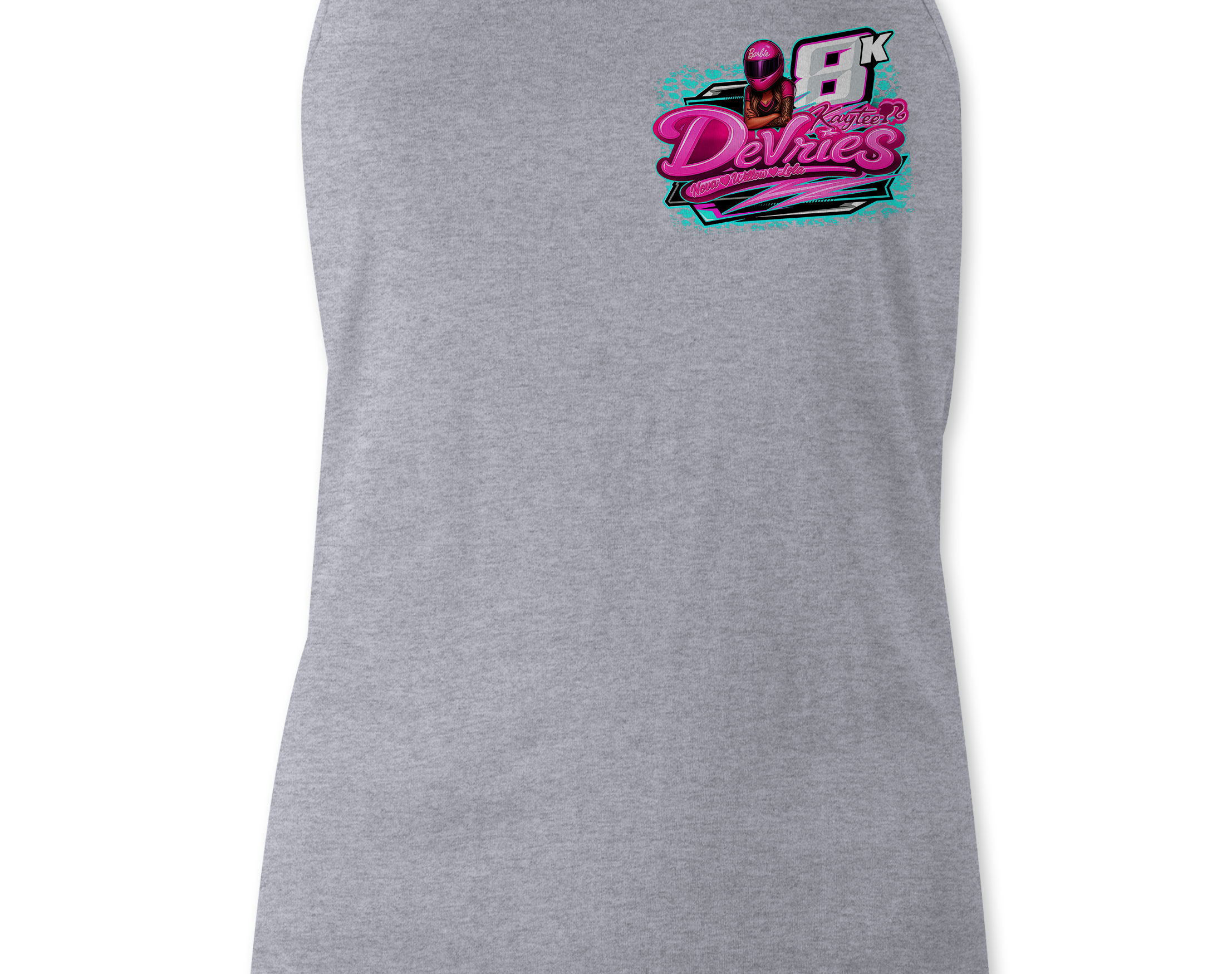 Support Kaytee Devries with their custom apparel! Available in Black, Sports Gray and White. Graphics are direct to garment printed with a left chest image and a full back image.