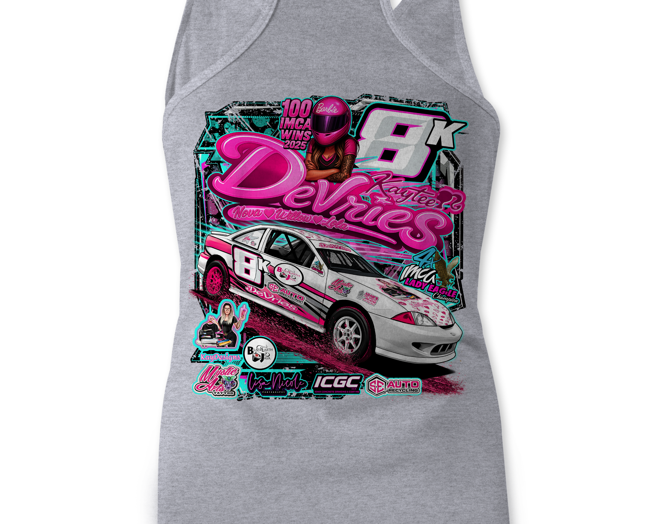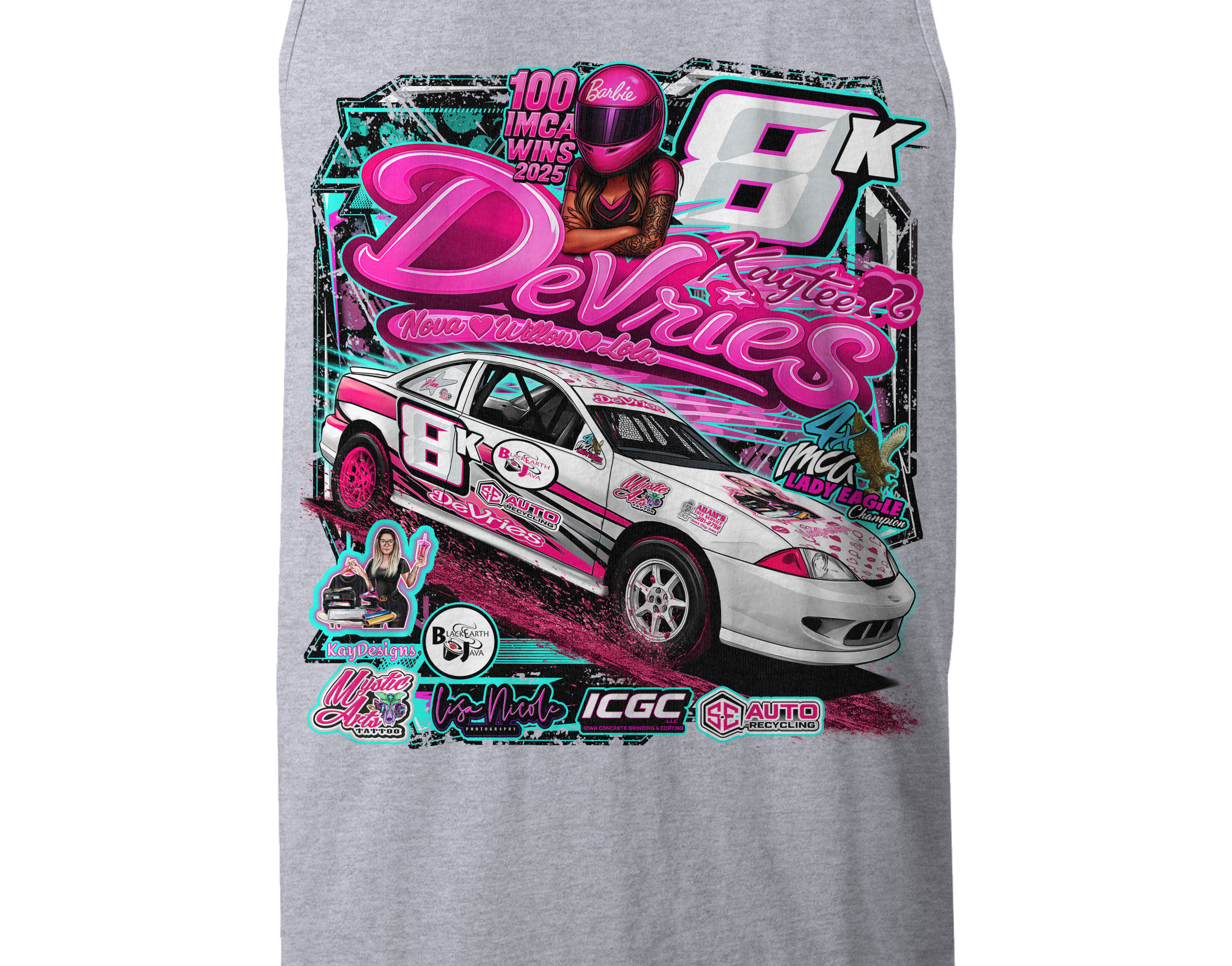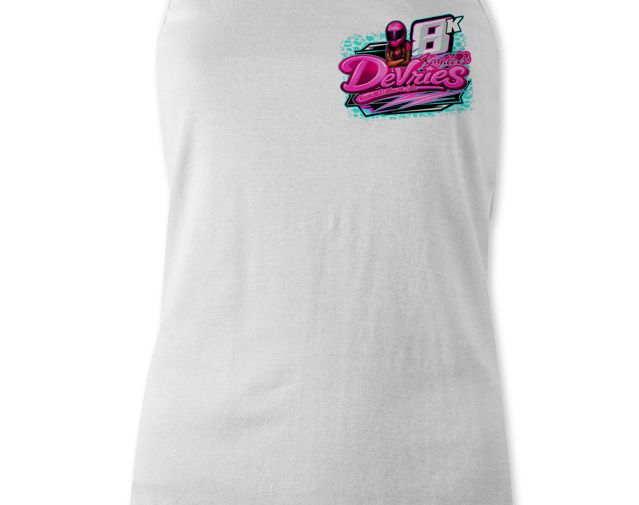 Support Kaytee Devries with their custom apparel! Available in Black, Sports Gray and White. Graphics are direct to garment printed with a left chest image and a full back image.
