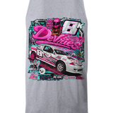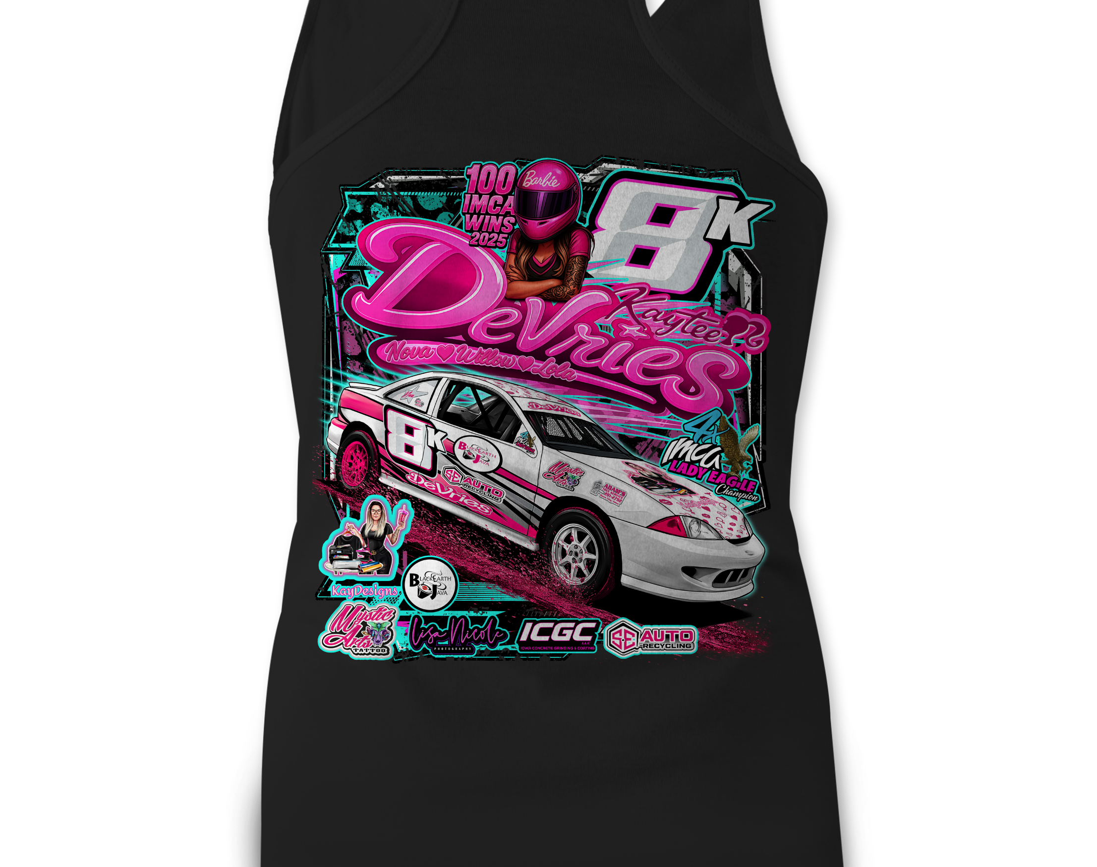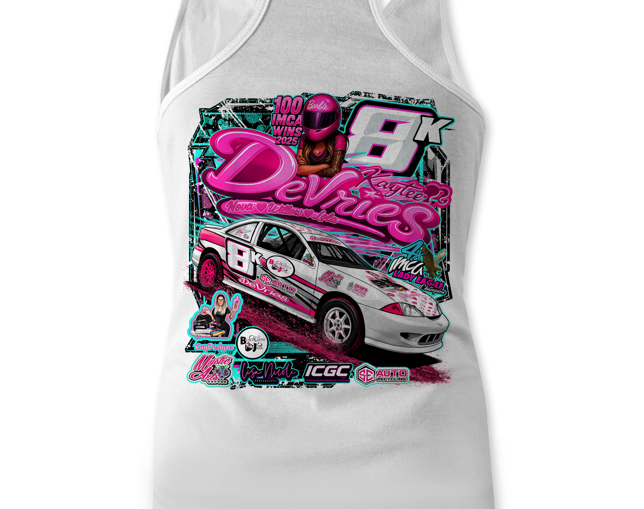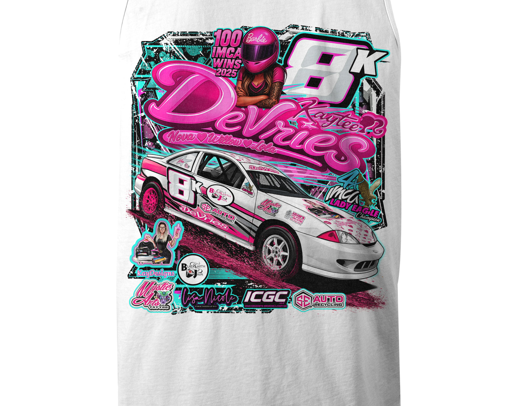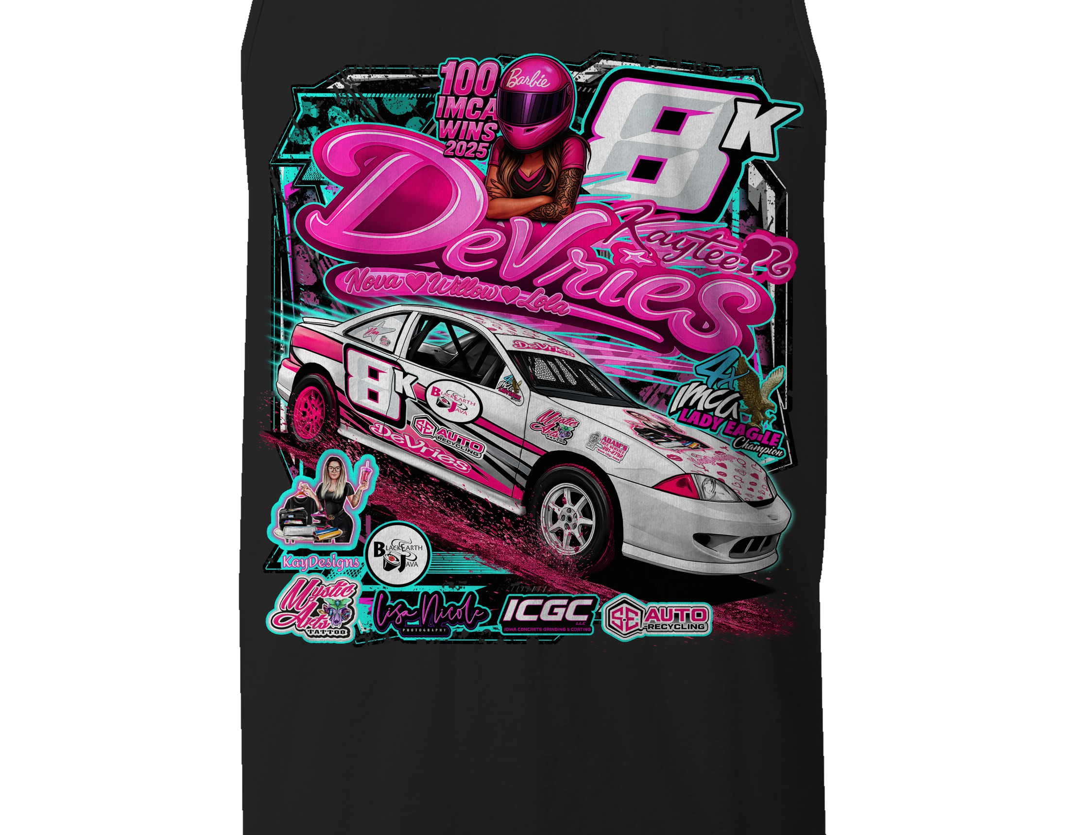 Support Kaytee Devries with their custom apparel! Available in Black, Sports Gray and White. Graphics are direct to garment printed with a left chest image and a full back image.