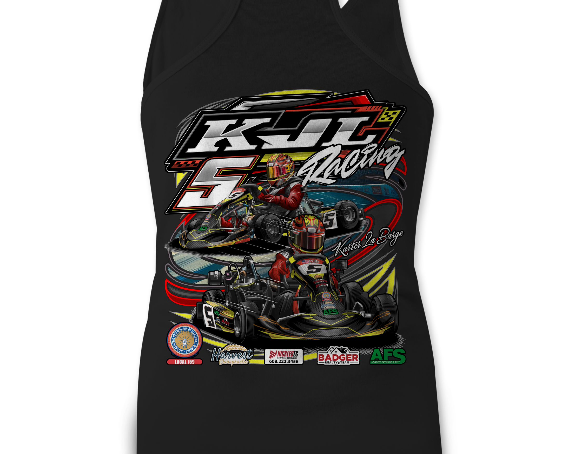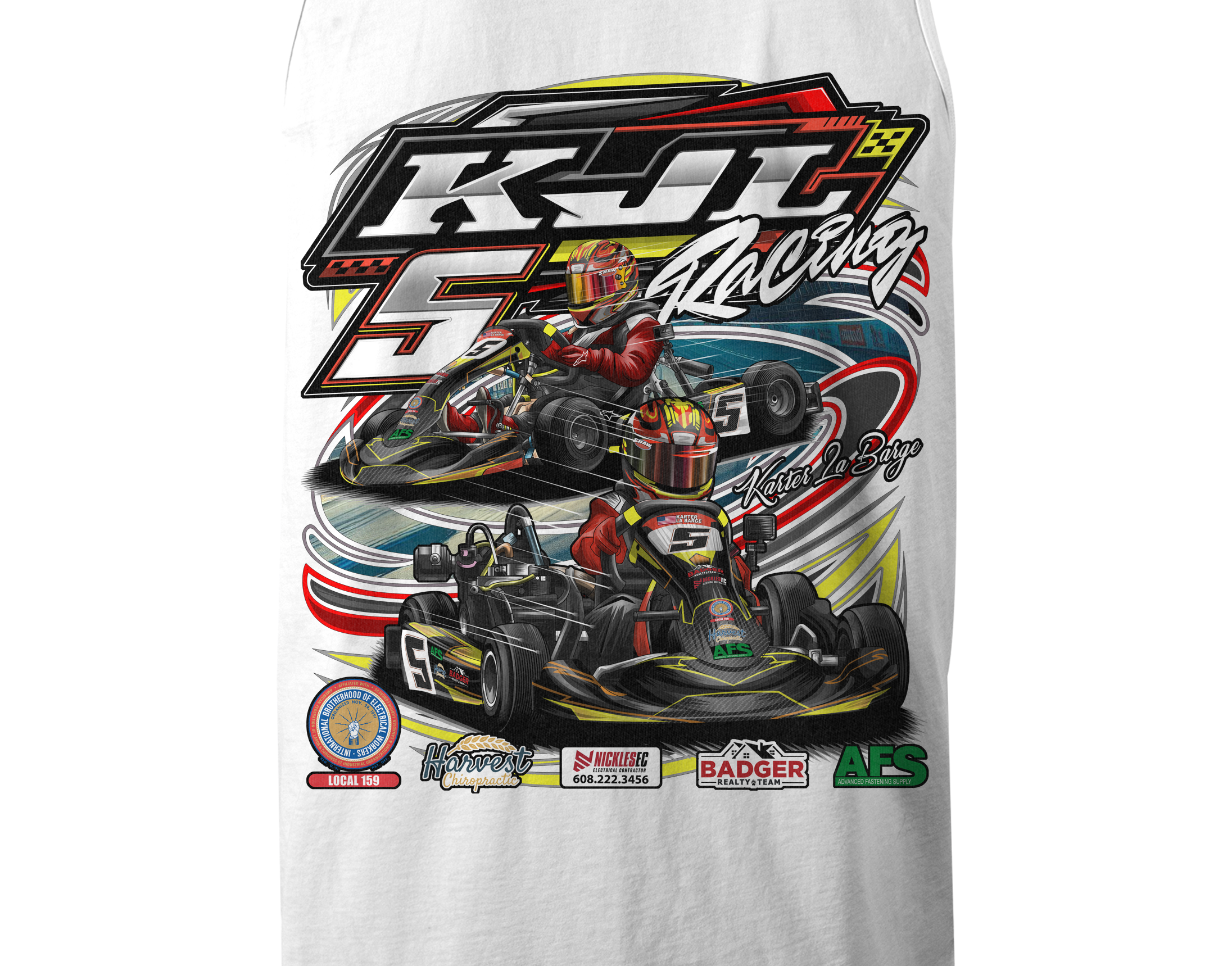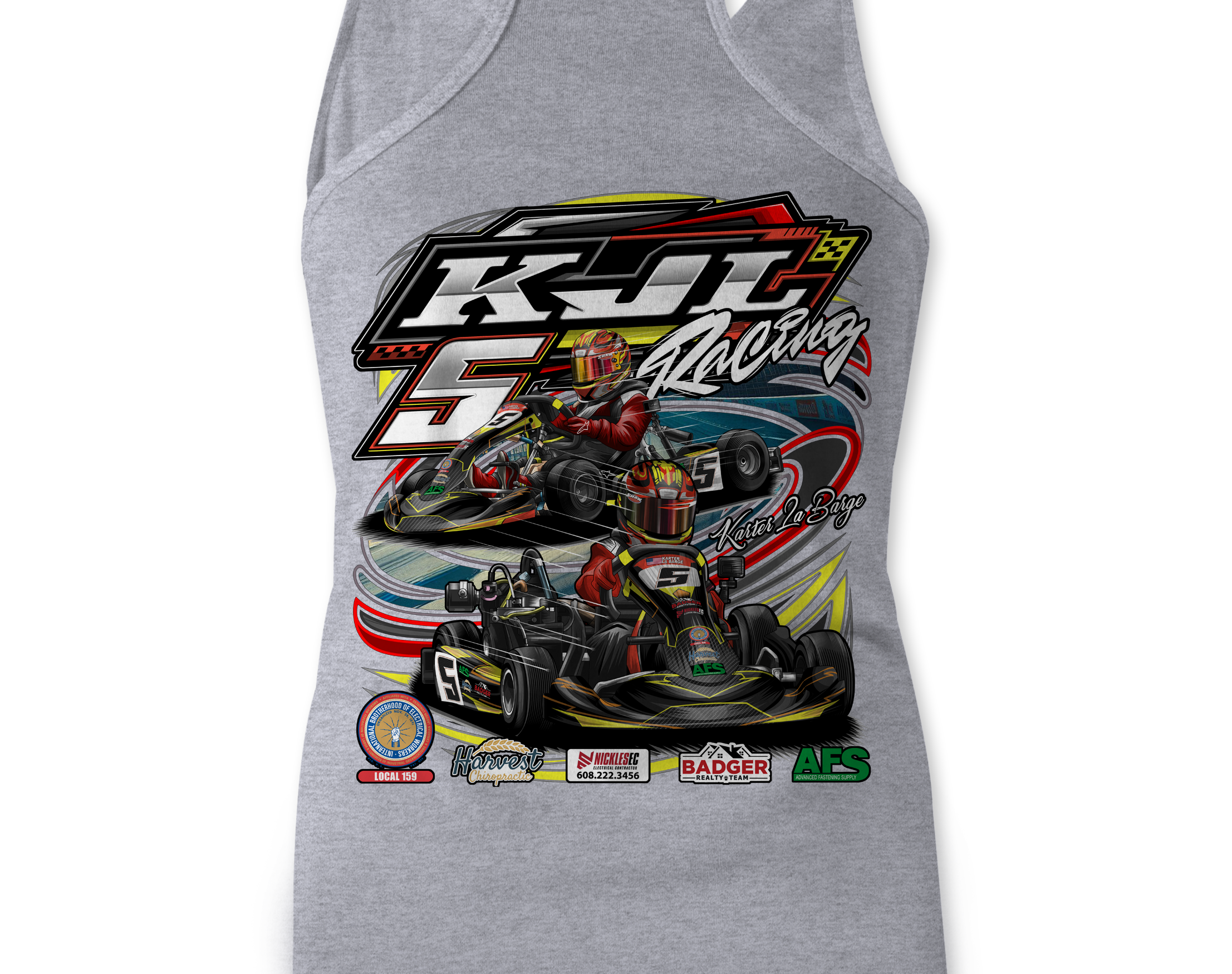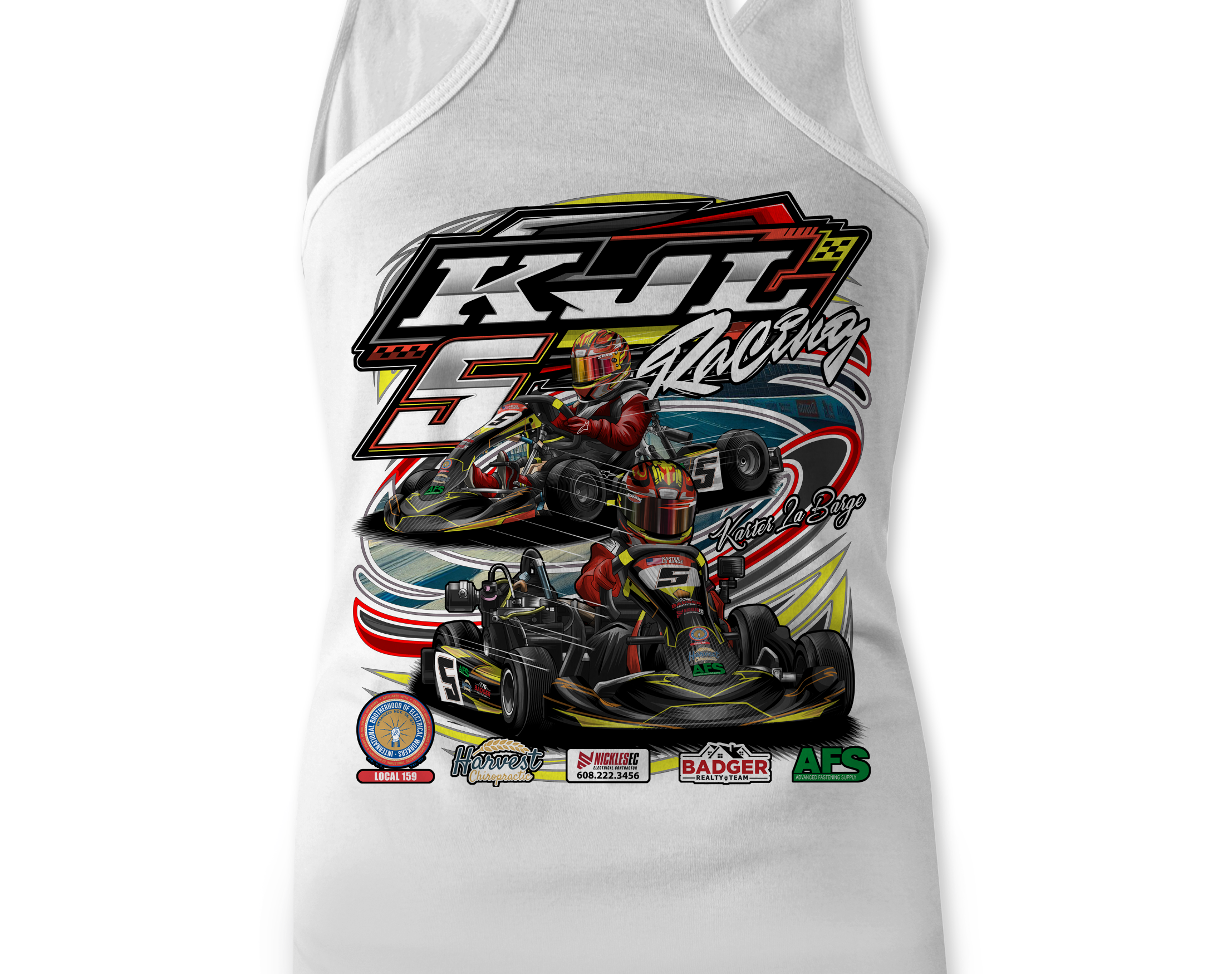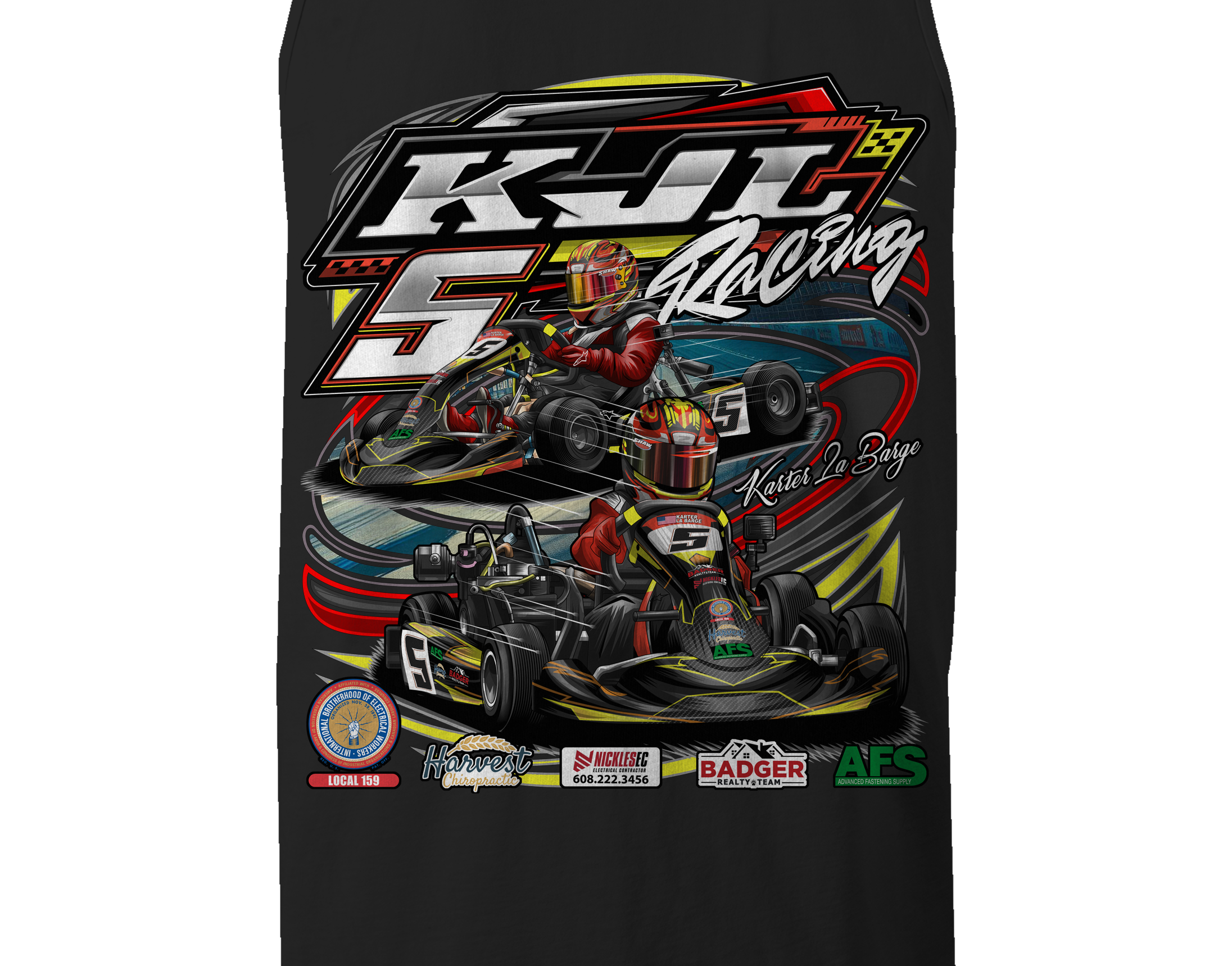 Support KJL Racing with their custom apparel! Available in Black, Sports Gray and White. Graphics are direct to garment printed with a left chest image and a full back image.