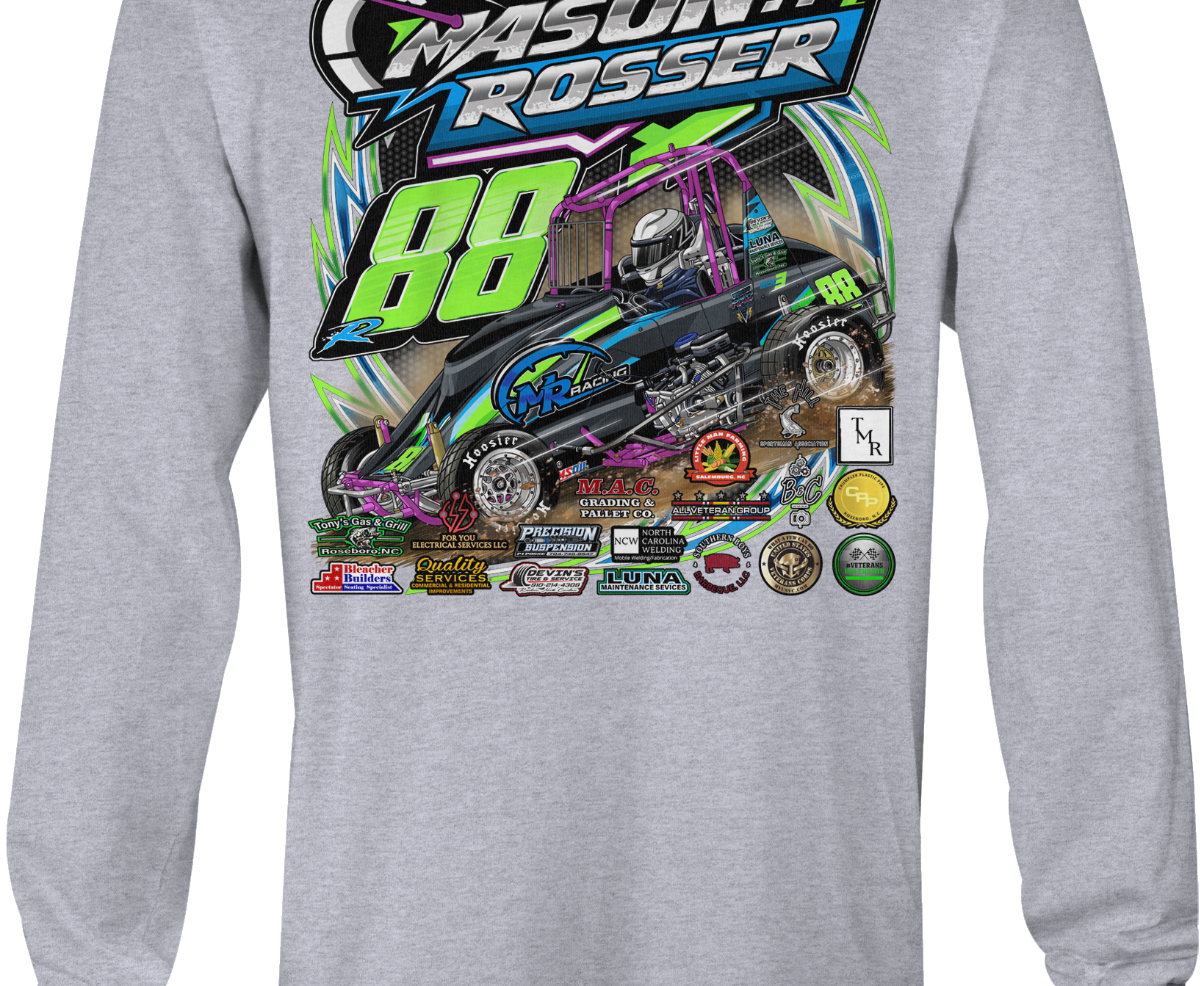 Support Mason Rosser 2025 with their custom apparel! Available in Black, Sports Gray and White. Graphics are direct to garment printed with a left chest image and a full back image.