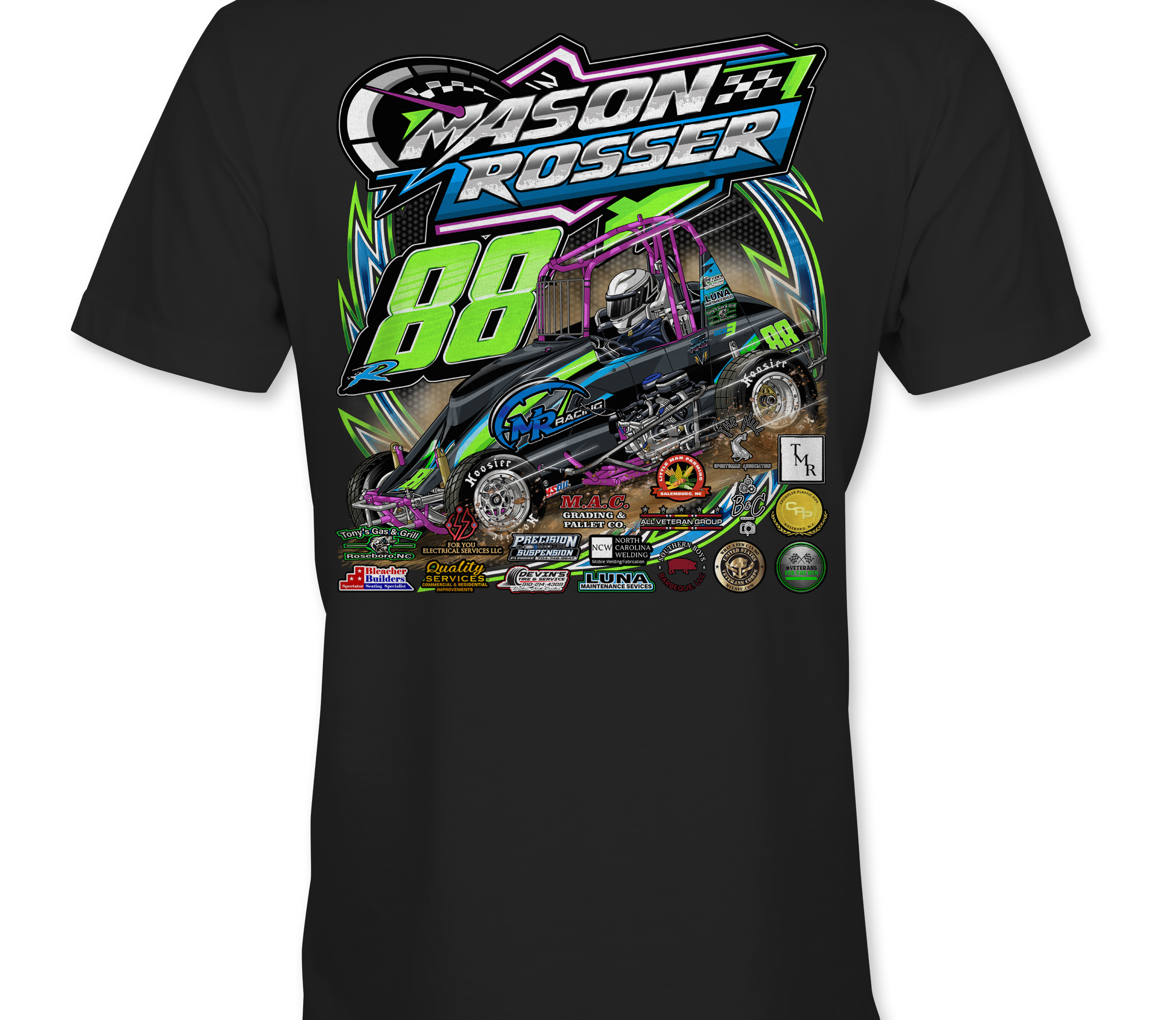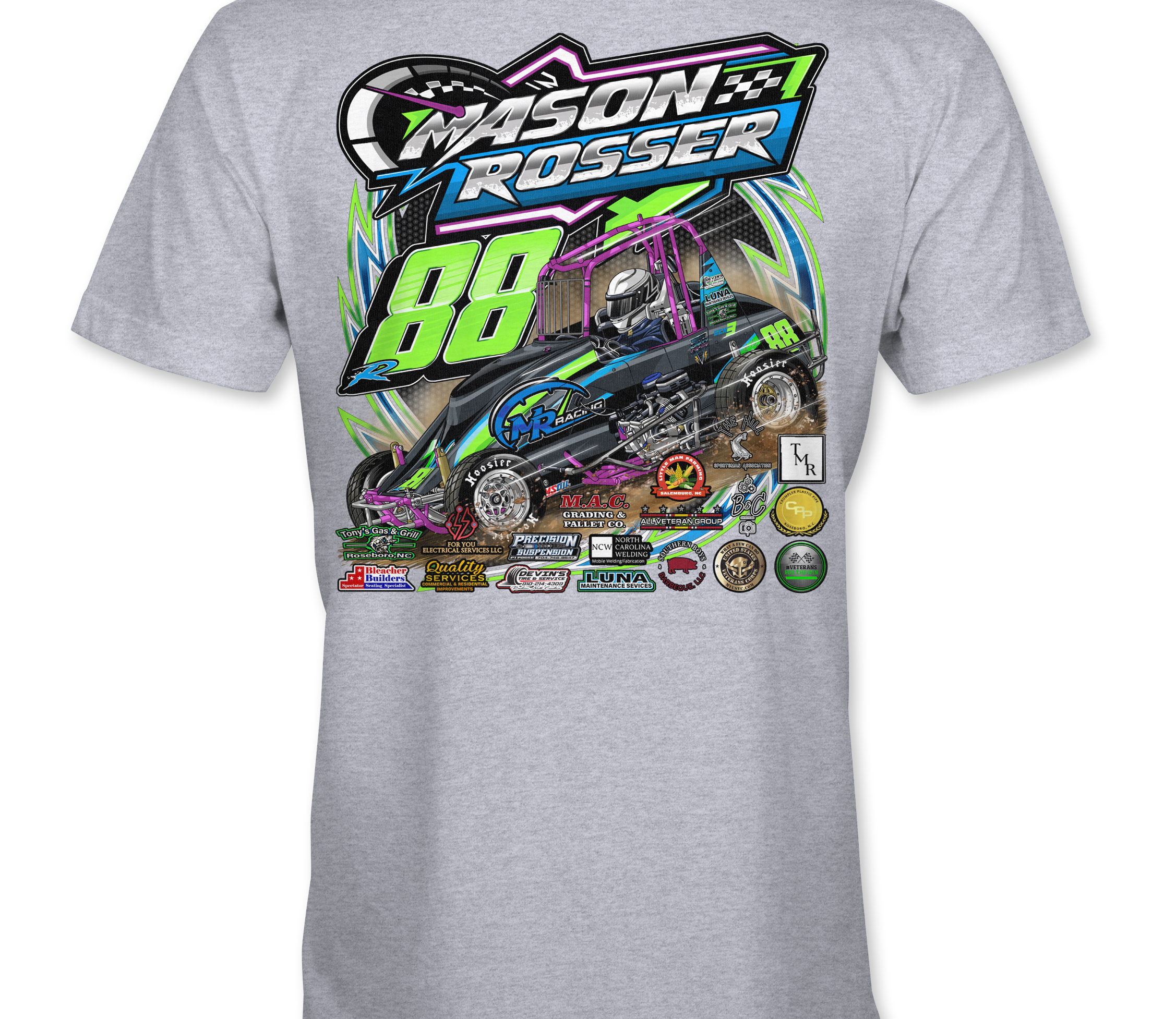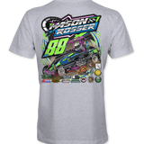 Support Mason Rosser 2024 with their custom apparel! Available in Black, Sports Gray and White. Graphics are direct to garment printed with a left chest image and a full back image.