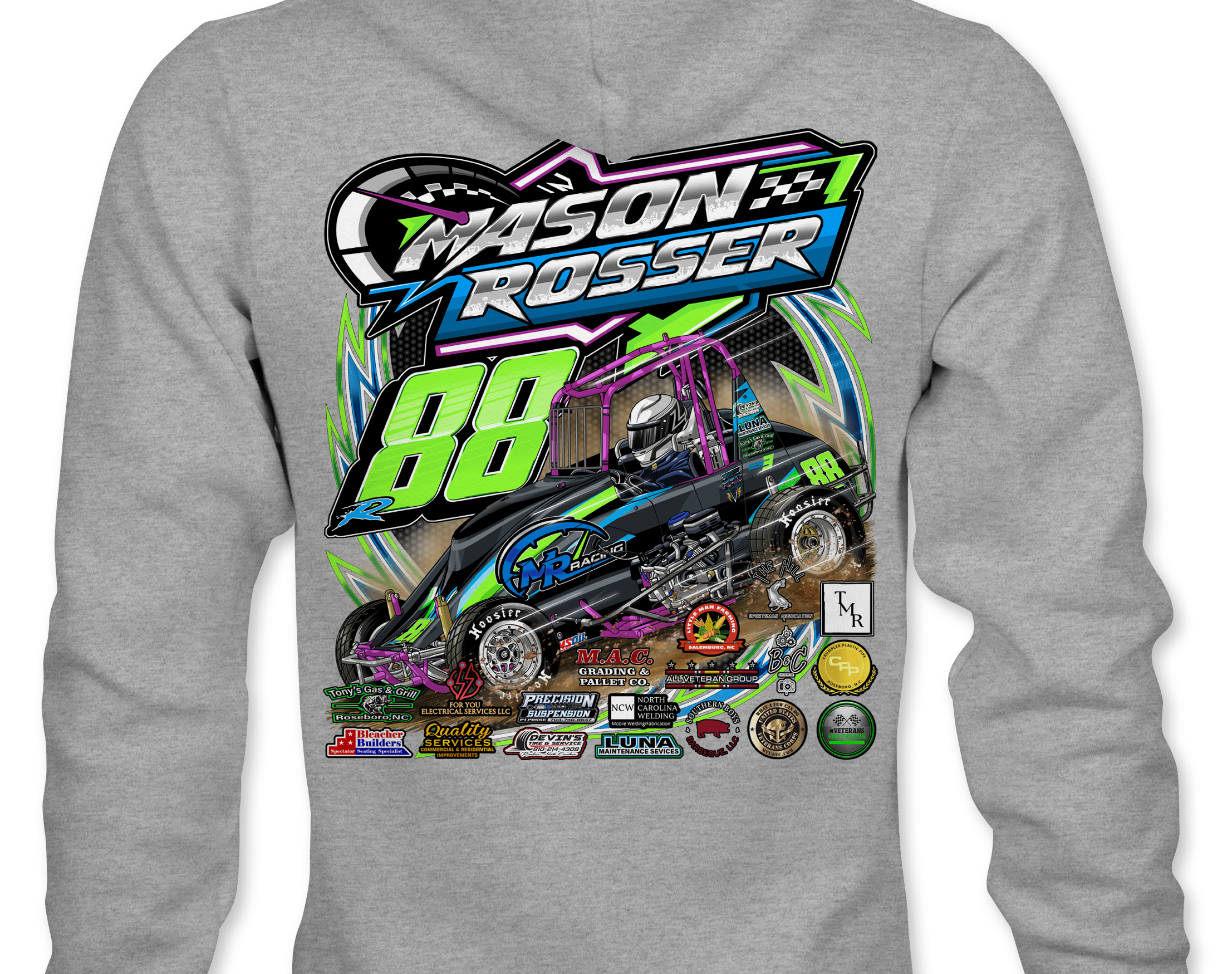 Support Mason Rosser 2024 with their custom apparel! Available in Black, Sports Gray and White. Graphics are direct to garment printed with a left chest image and a full back image.