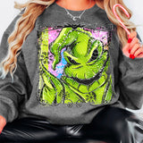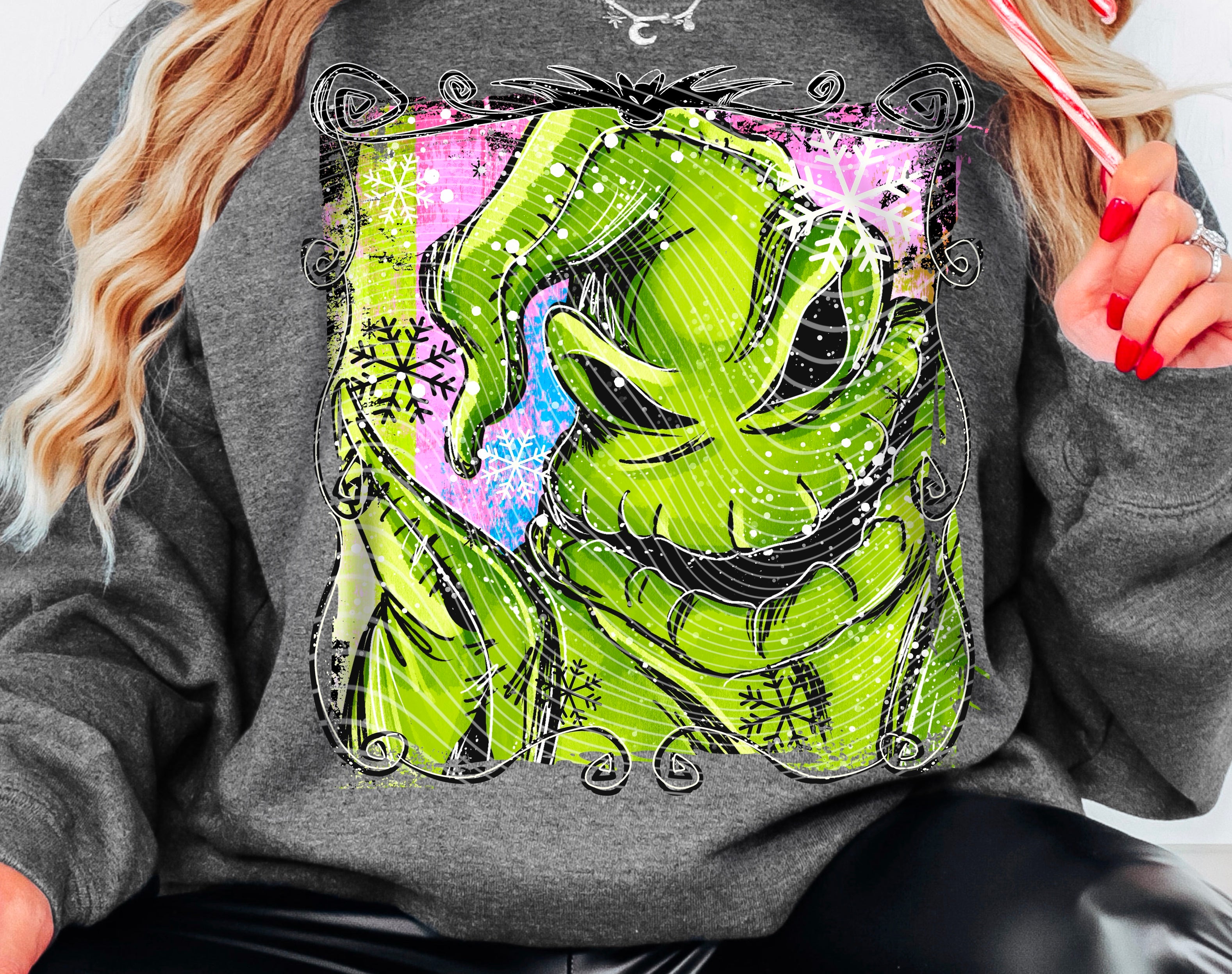 Cozy meets creepy in this Oogie Boogie Christmas crewneck. The neon lime and pastel background pop beautifully on winter neutrals, with grunge textures that feel straight out of Halloween Town.