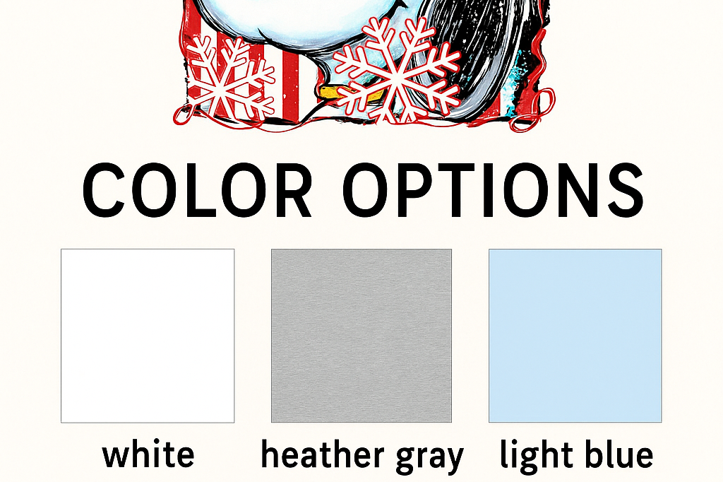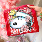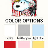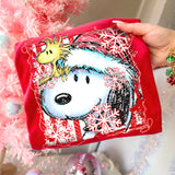 This Peppermint Snoopy tee features a candy-cane striped background, sparkling snowflakes, Woodstock, and festive holiday colors. Printed front-only using vibrant DTF for crisp boutique quality.