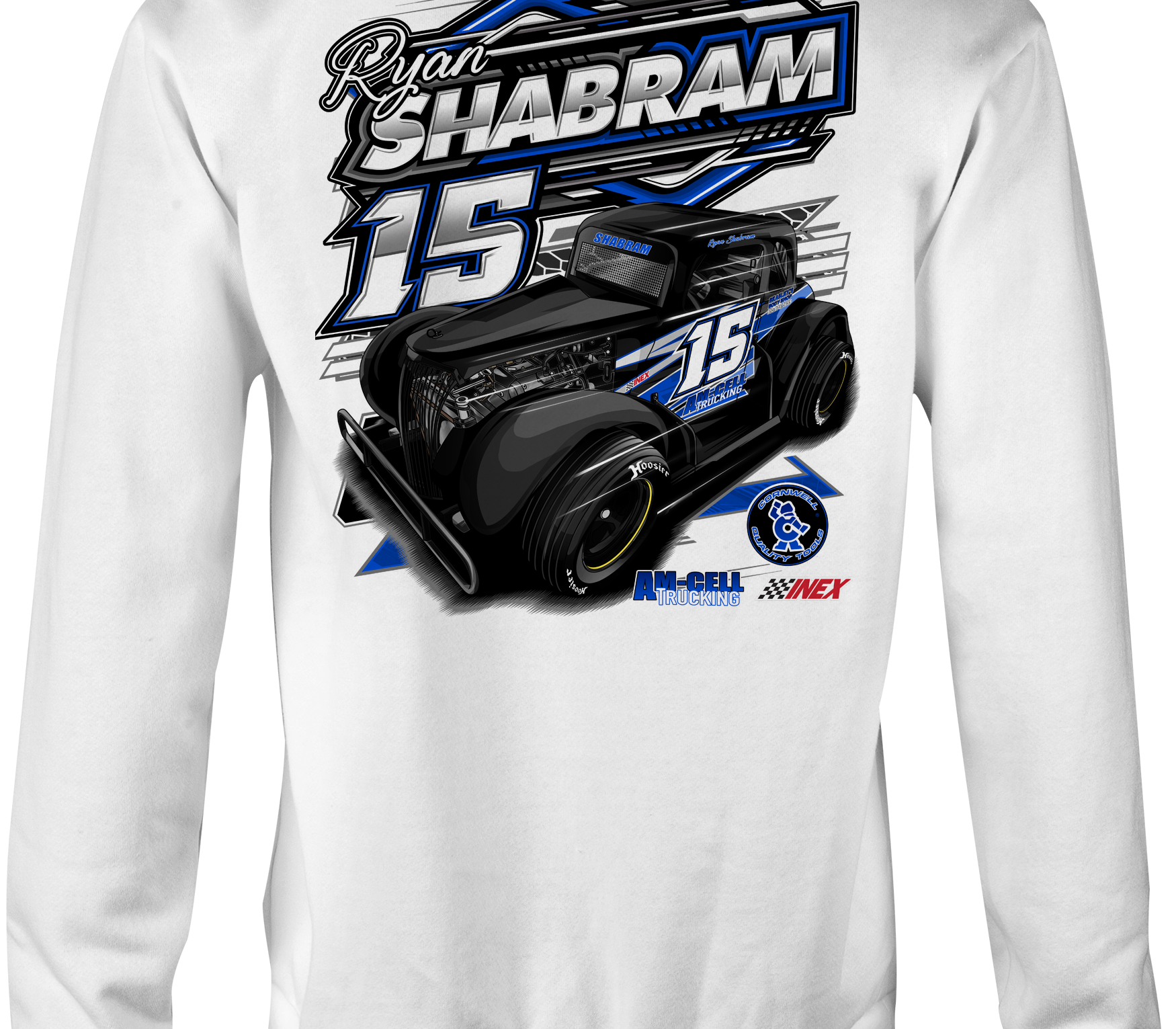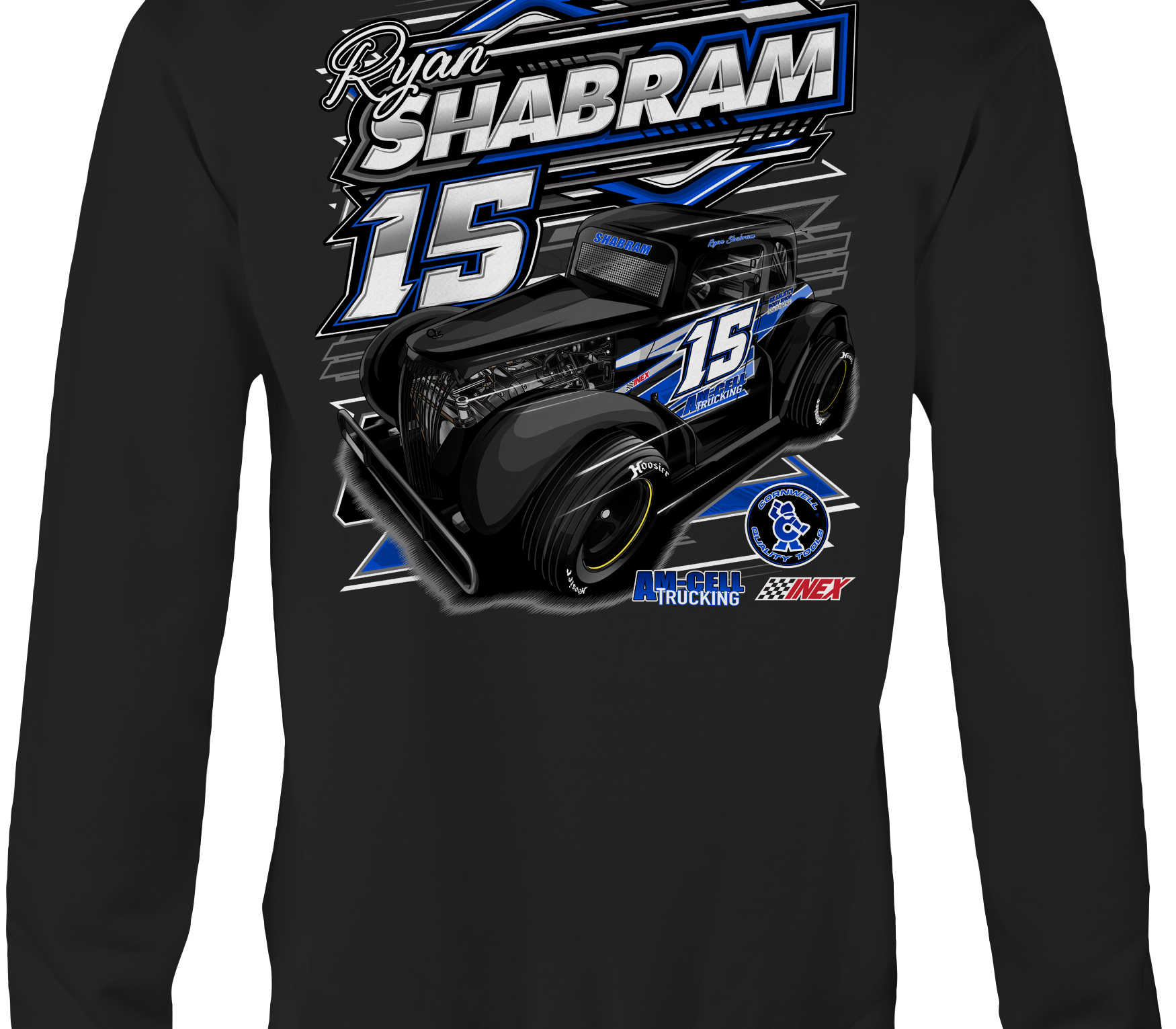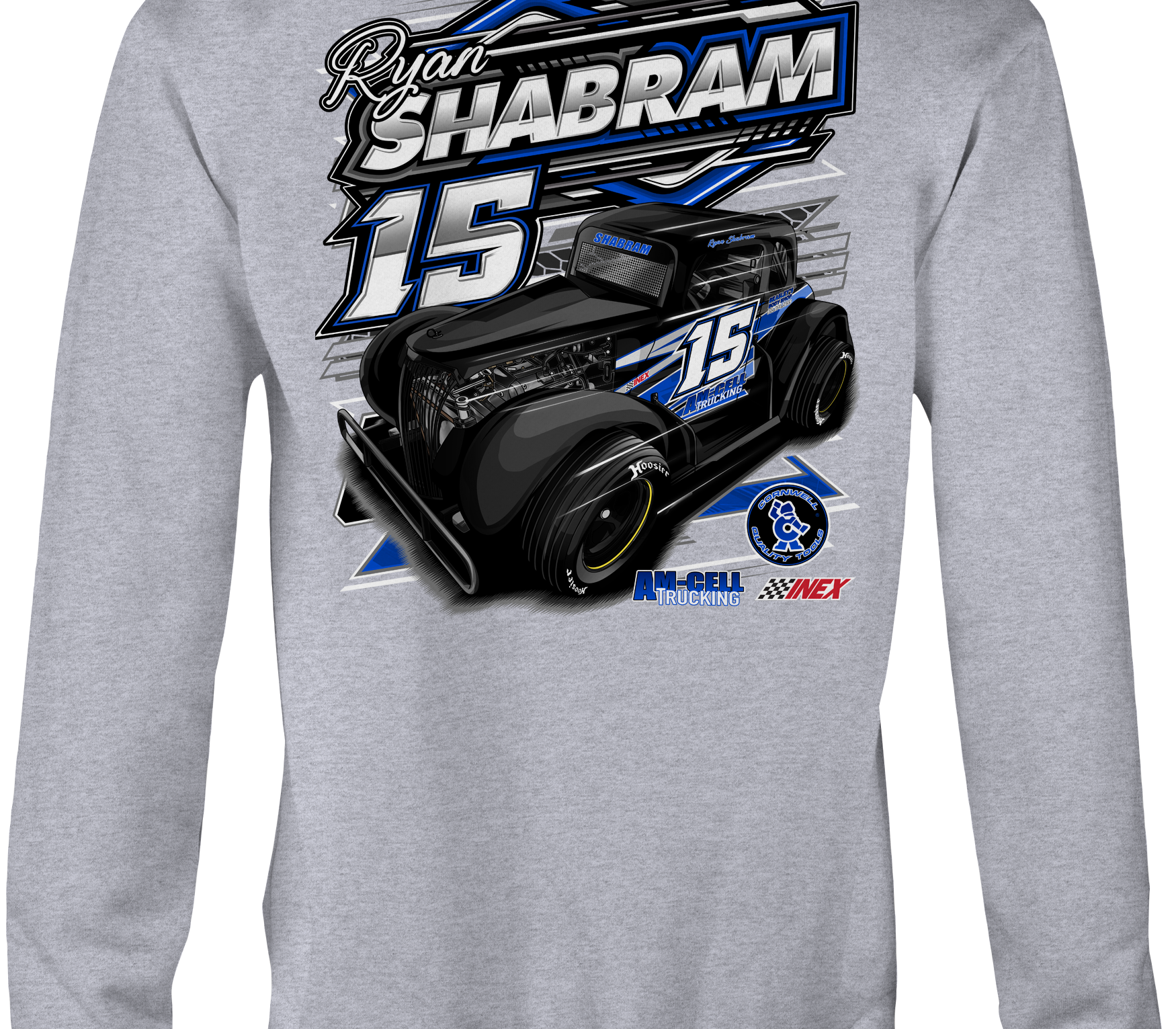 Support Ryan Shabram at Ronald Adams Racing with their custom apparel!  Available in Black, Sports Gray and White. Graphics are direct to garment printed with a left chest image and a full back image.