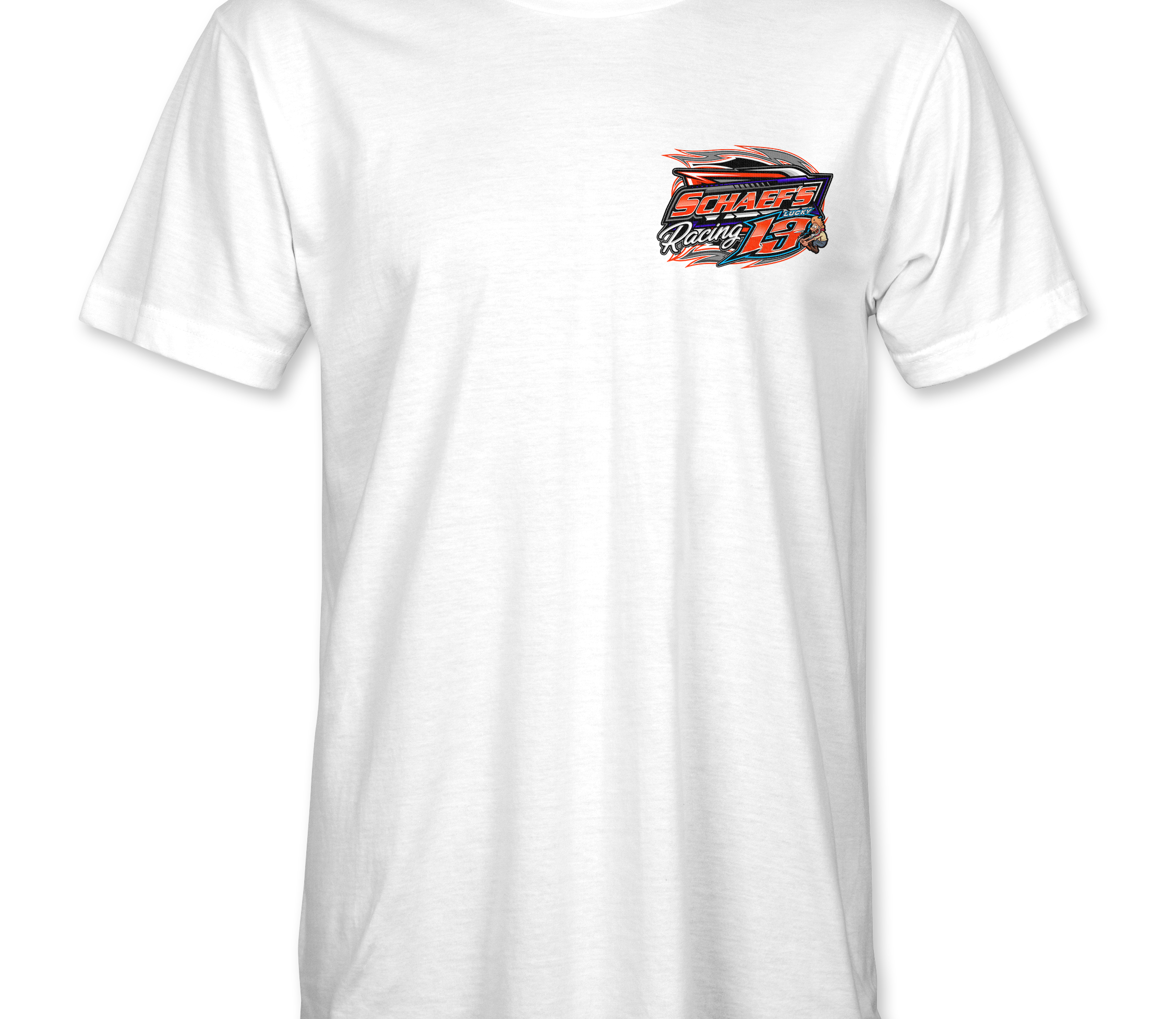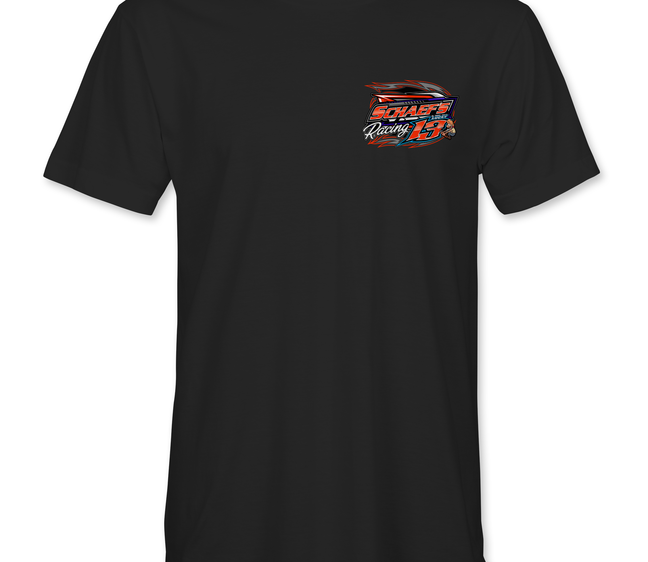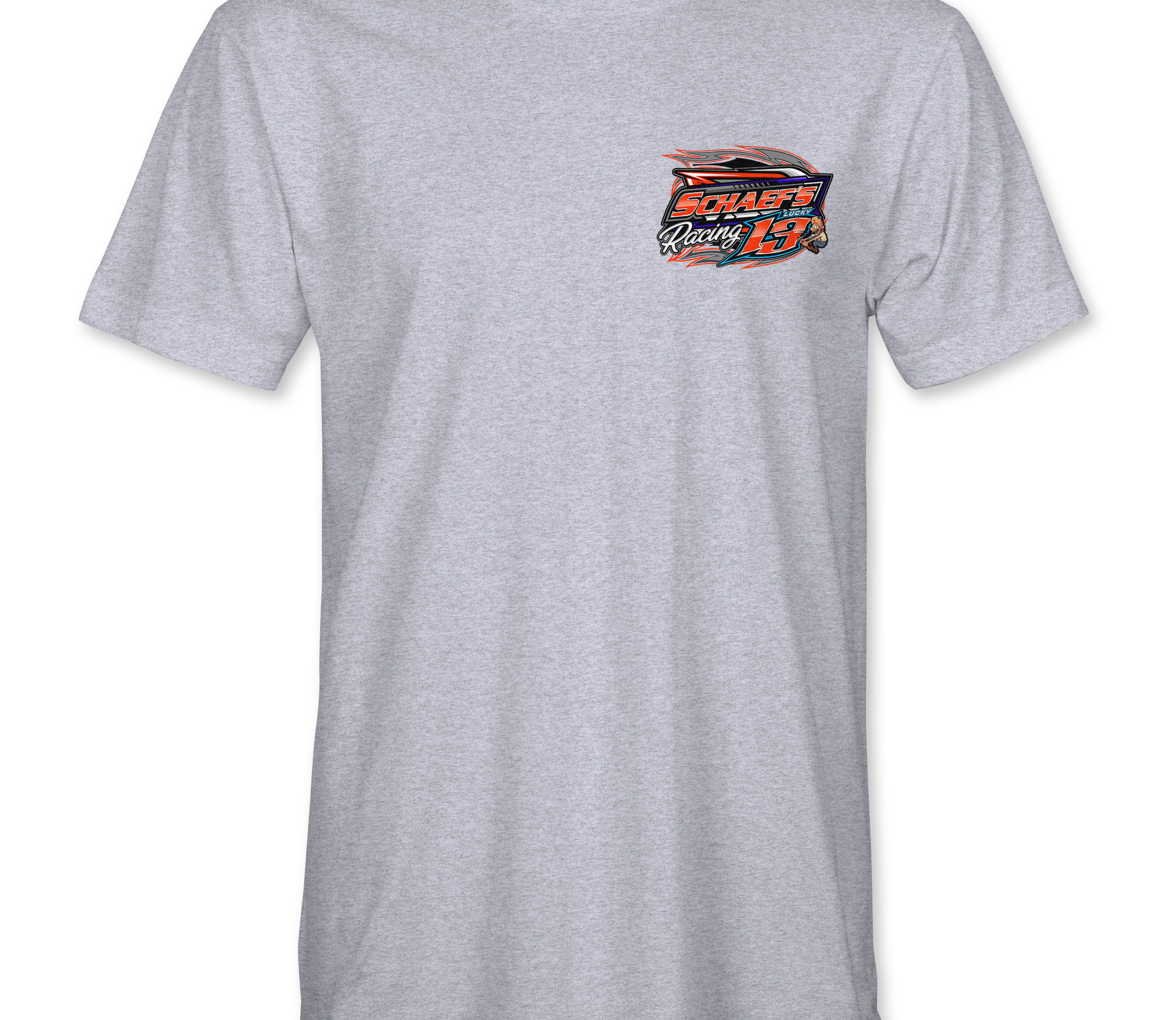 Support Schaef's Racing with their custom apparel!  Available in Black, Sports Gray and White. Graphics are direct to garment printed with a left chest image and a full back image.