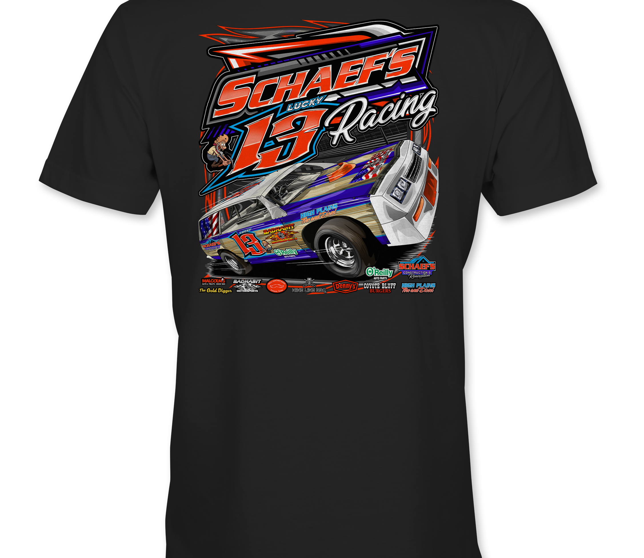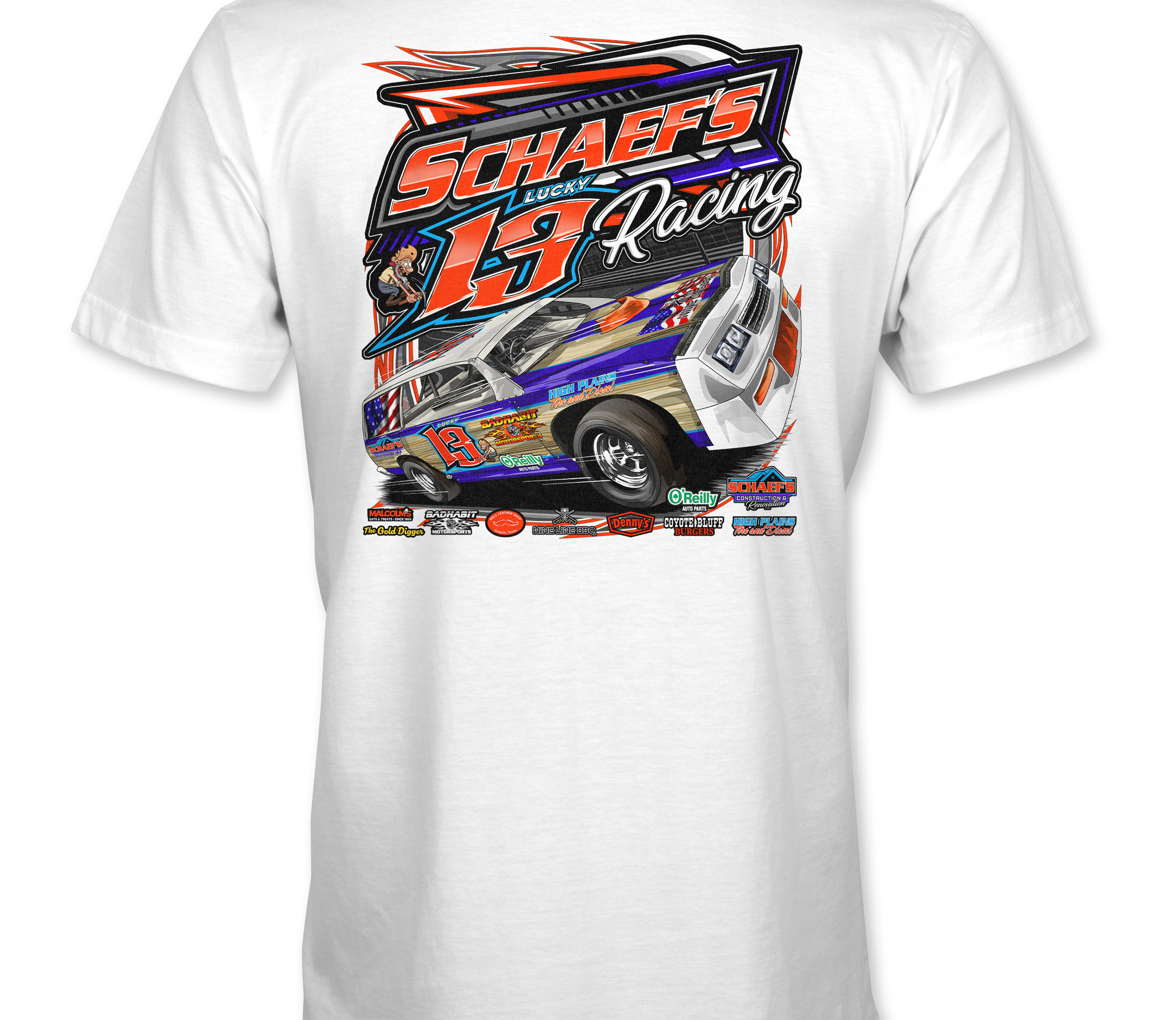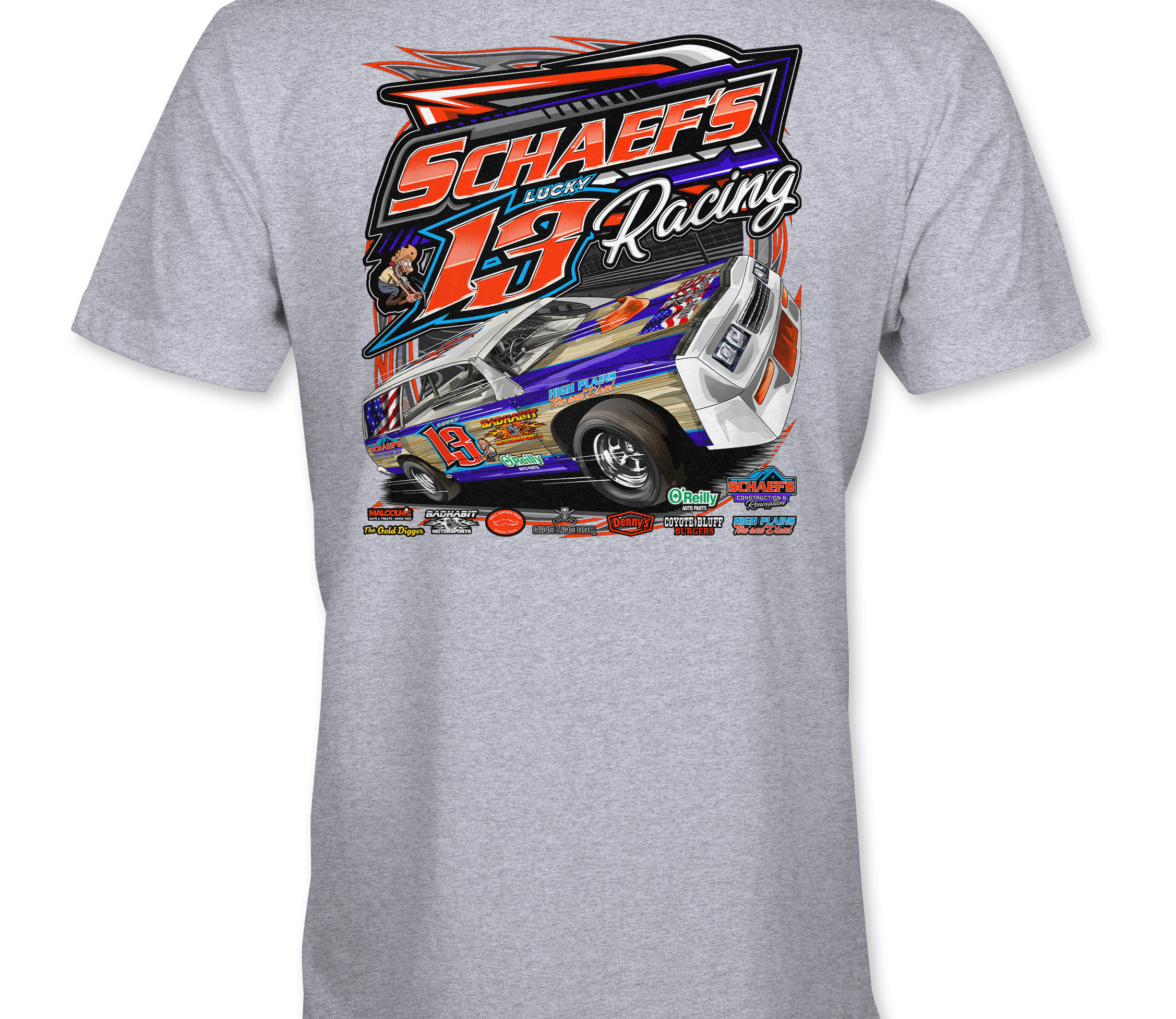Support Schaef's Racing with their custom apparel!  Available in Black, Sports Gray and White. Graphics are direct to garment printed with a left chest image and a full back image.