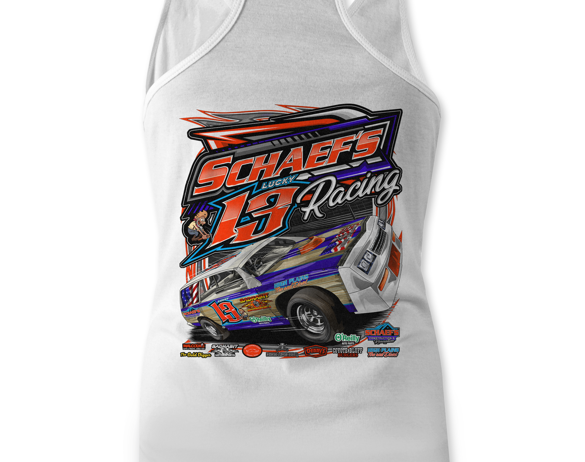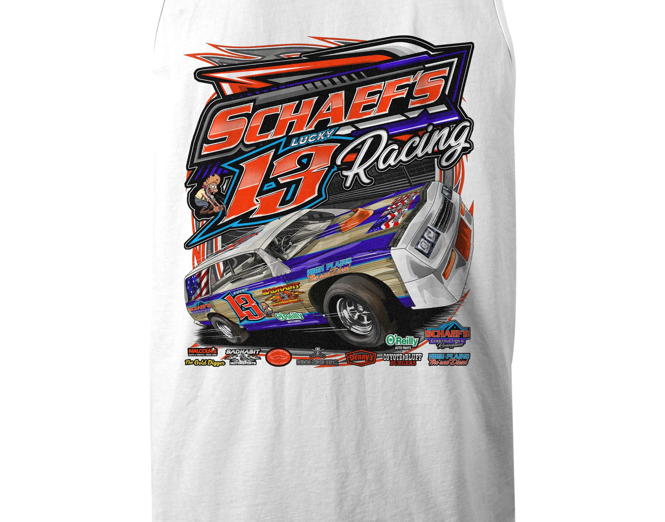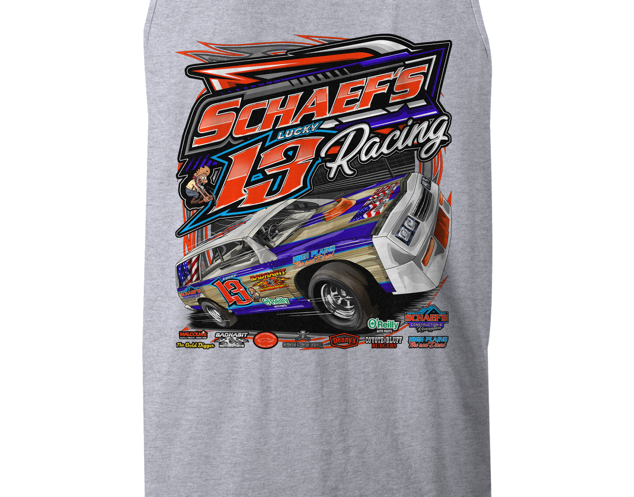 Support Schaef's Racing with their custom apparel! Available in Black, Sports Gray and White. Graphics are direct to garment printed with a left chest image and a full back image.