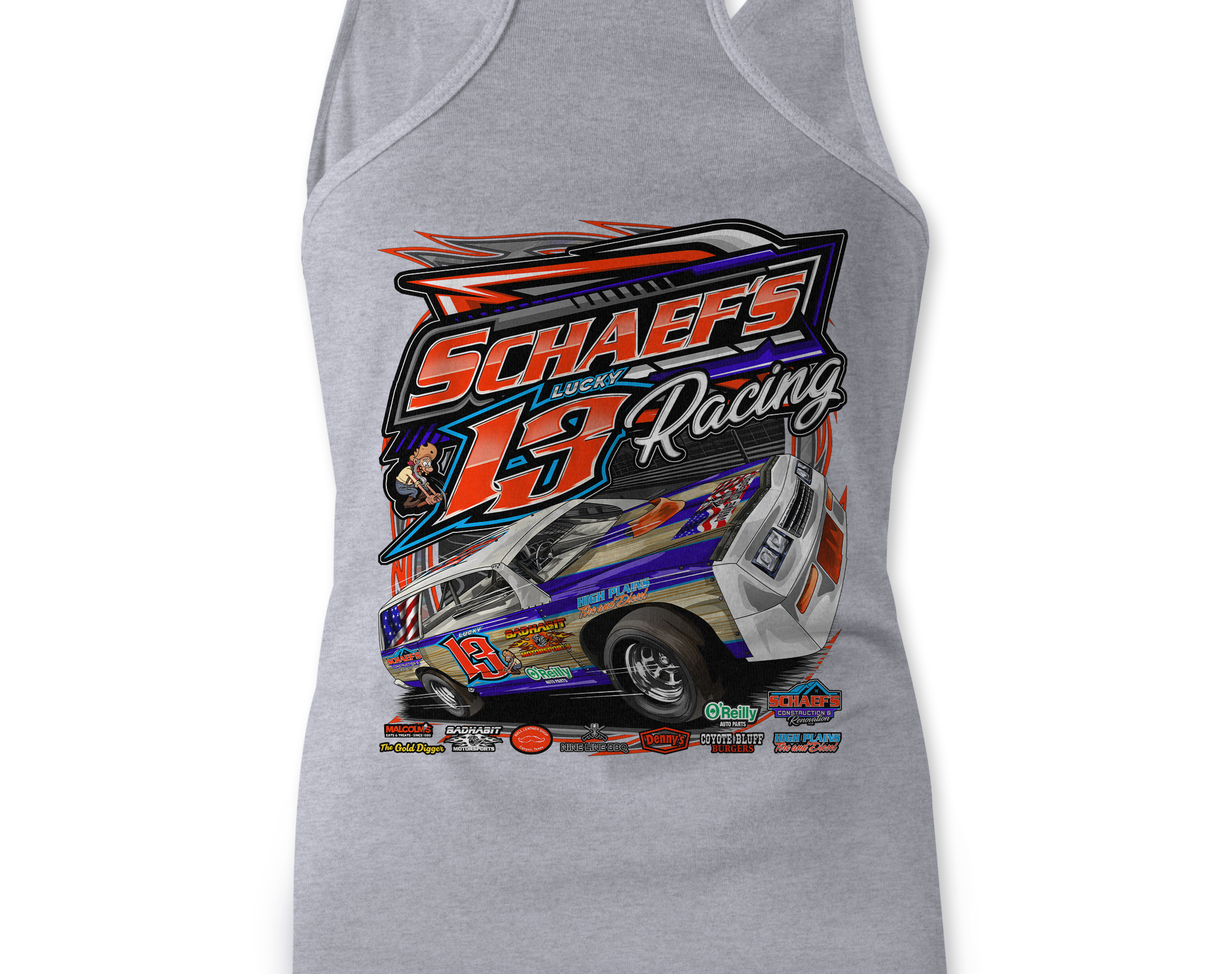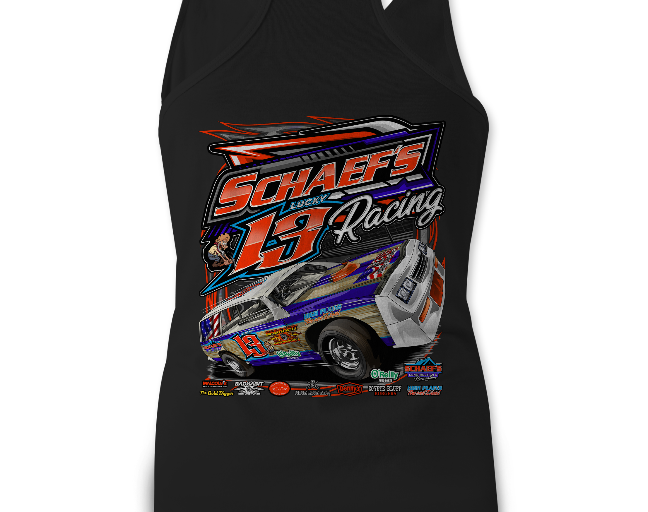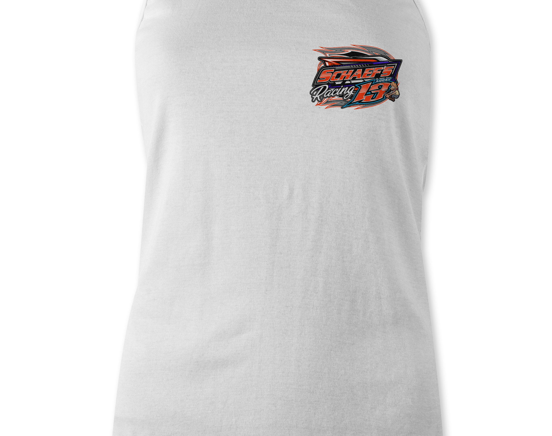 Support Schaef's Racing with their custom apparel! Available in Black, Sports Gray and White. Graphics are direct to garment printed with a left chest image and a full back image.