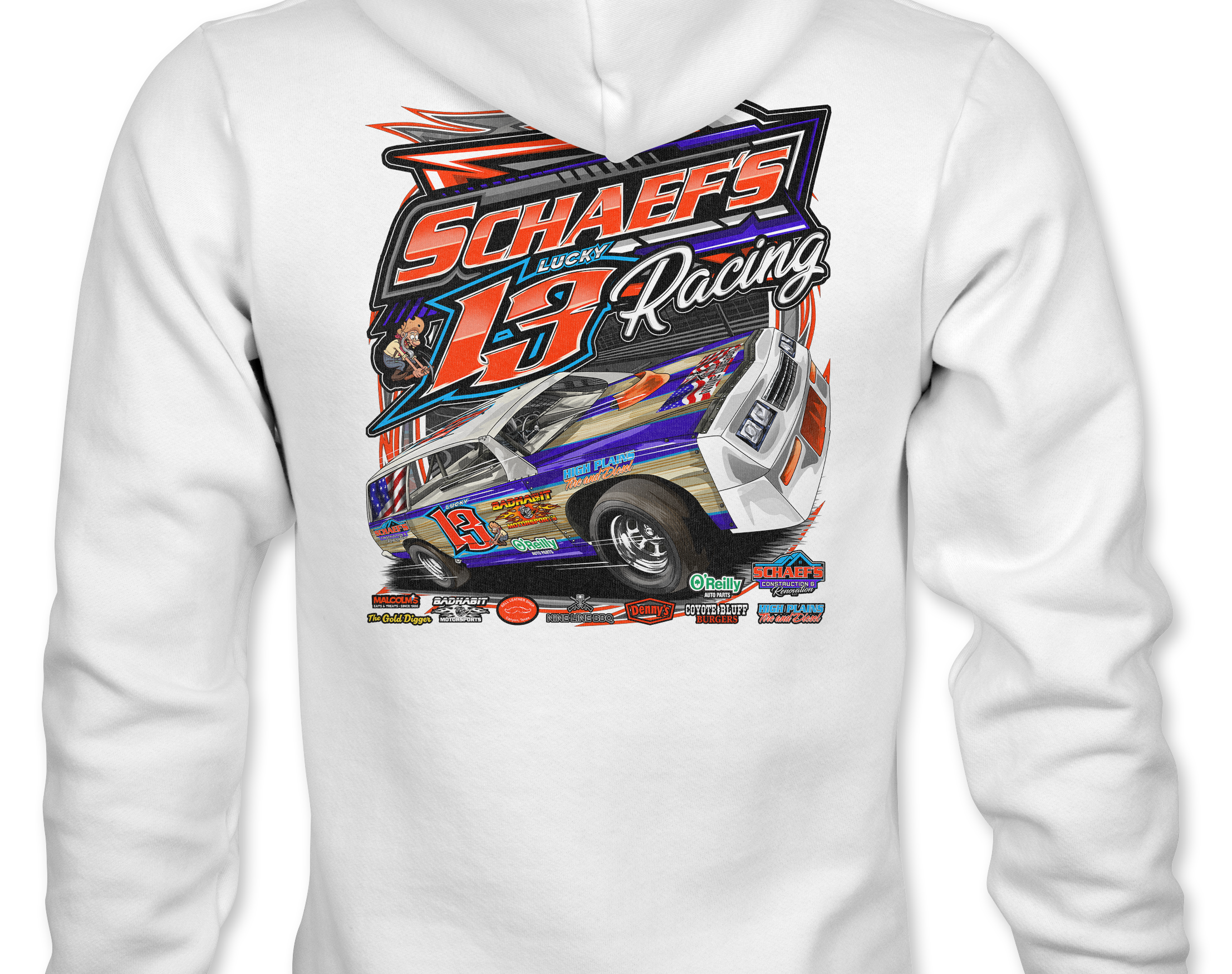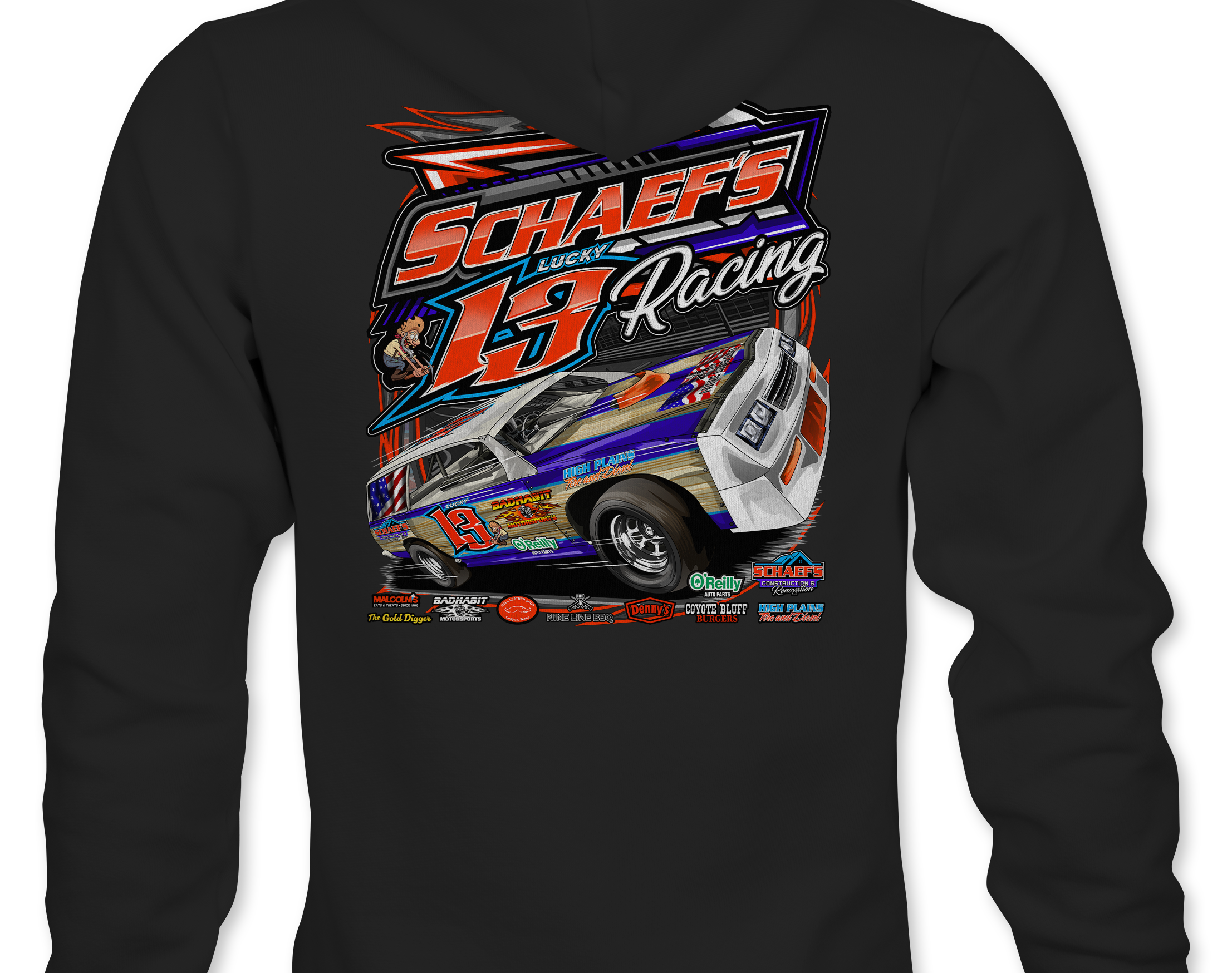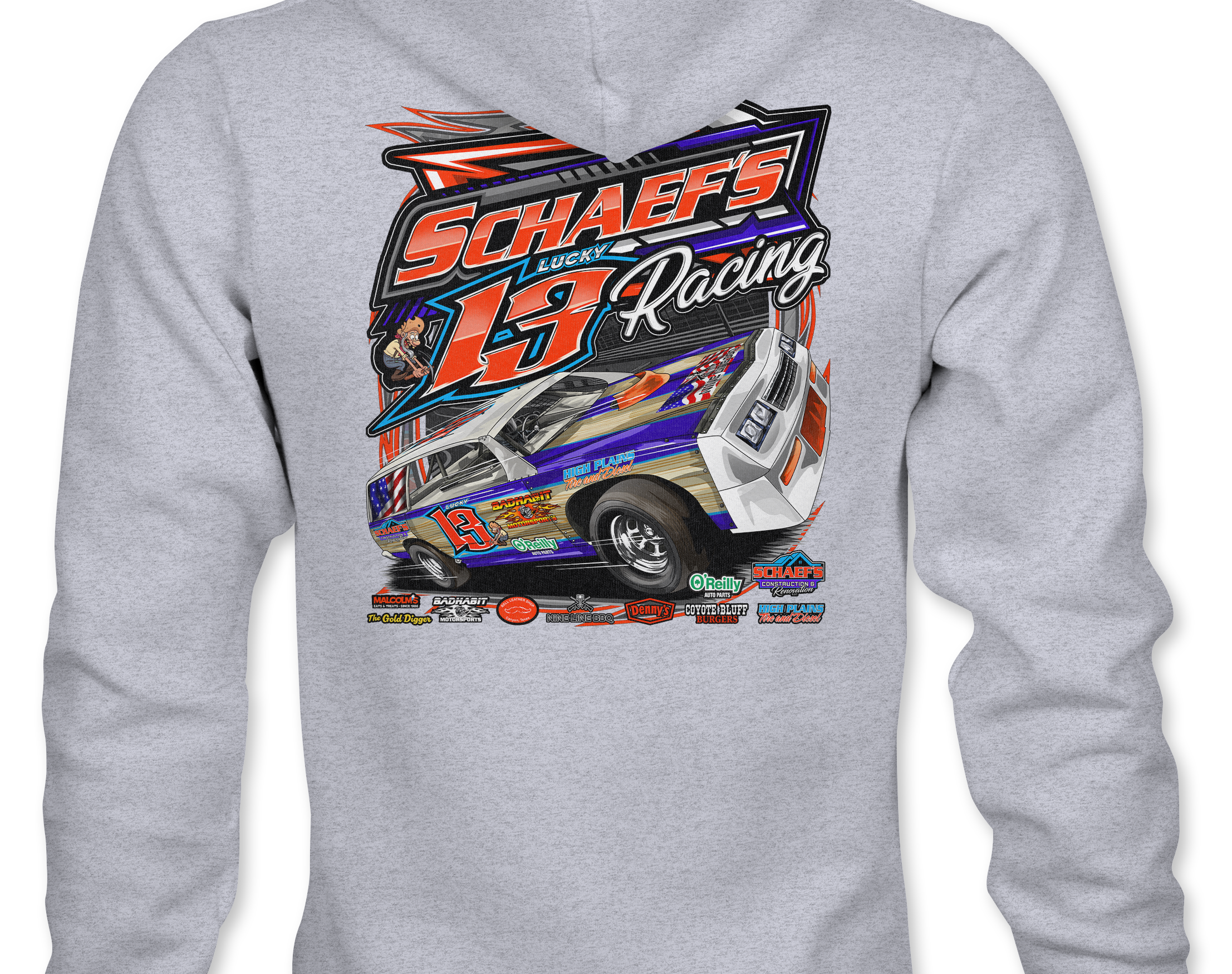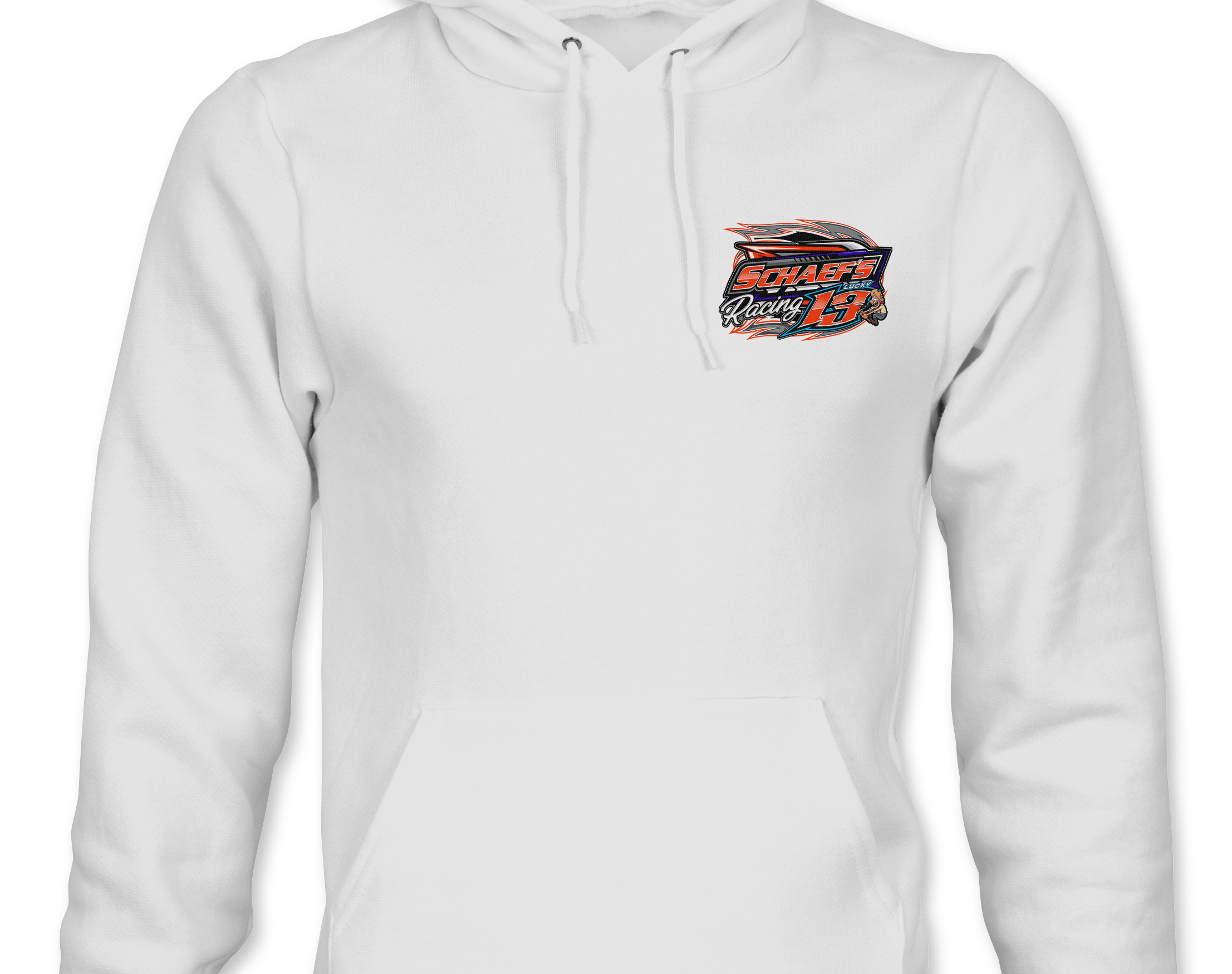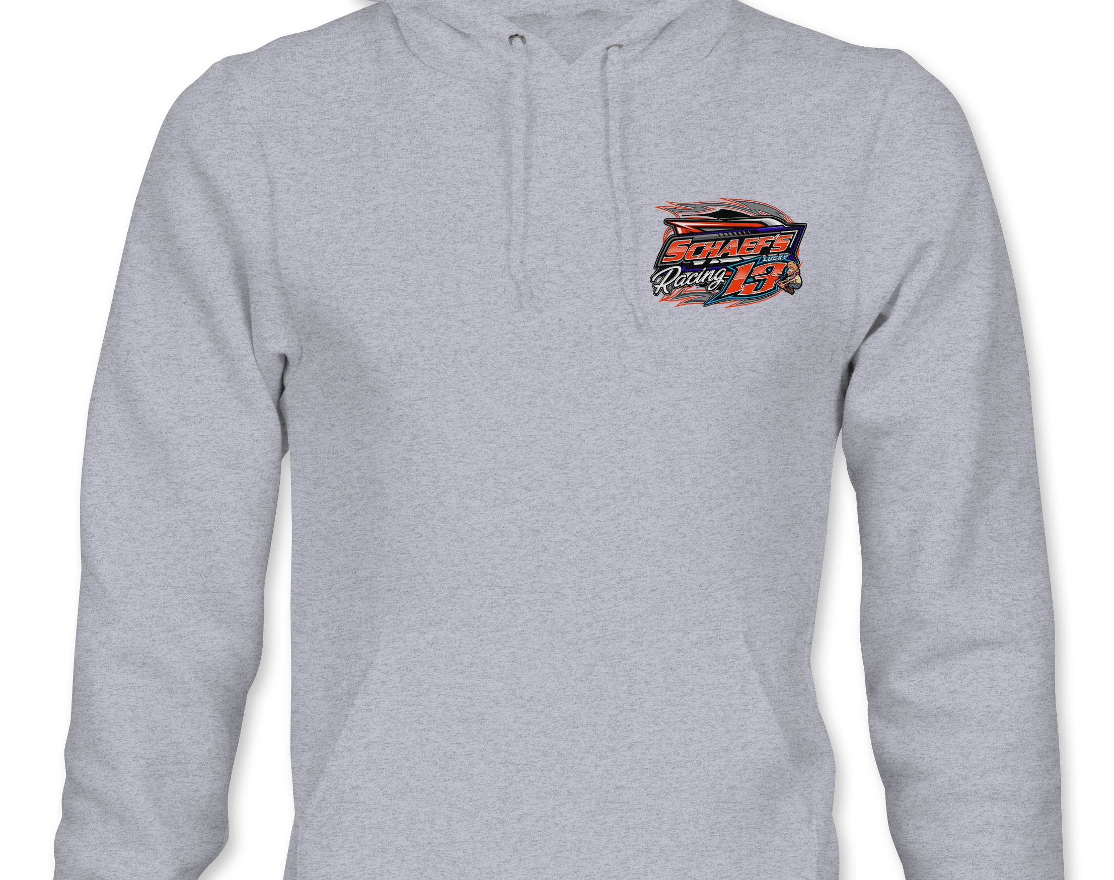 Support Schaef's Racing with their custom apparel! Available in Black, Sports Gray and White. Graphics are direct to garment printed with a left chest image and a full back image.