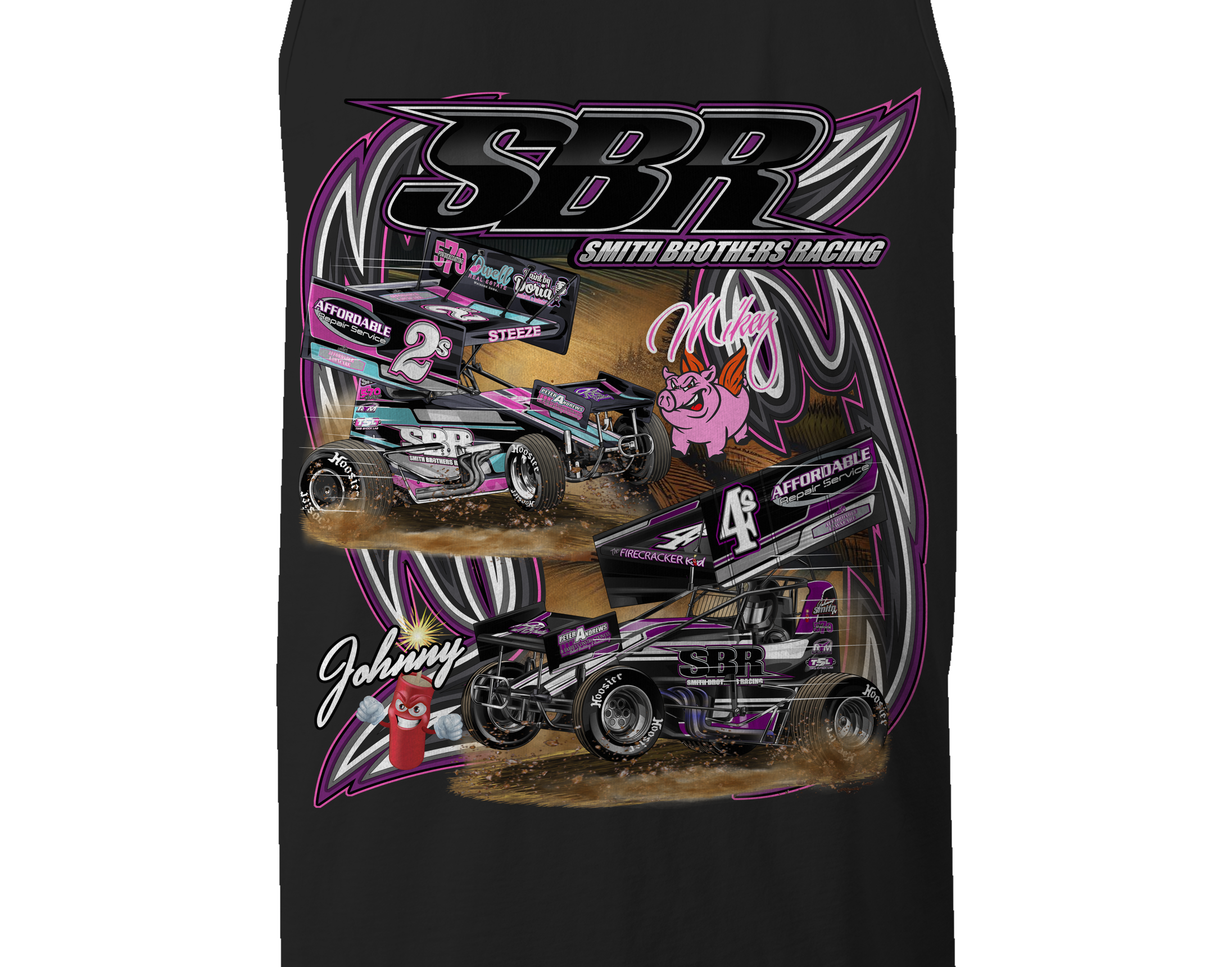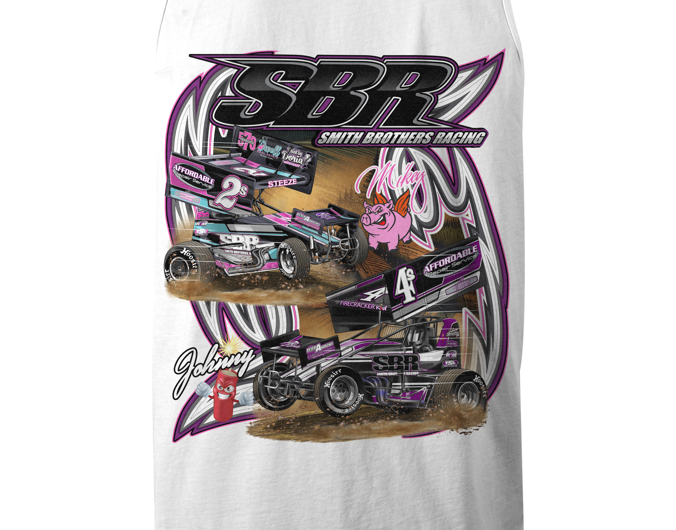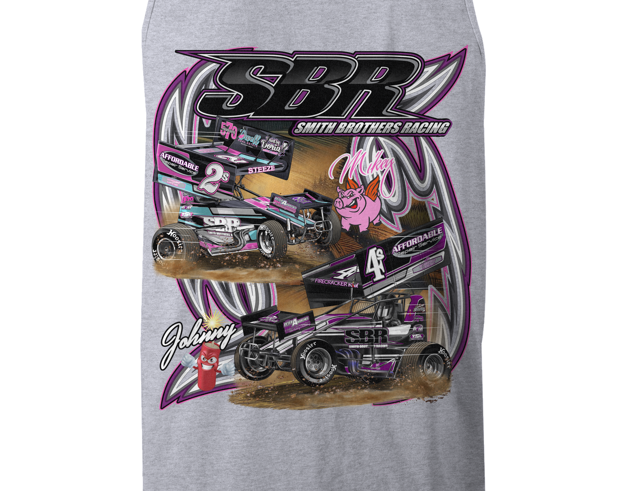 Support Smith Brothers Racing with their custom apparel! Available in Black, Sports Gray and White. Graphics are direct to garment printed with a left chest image and a full back image.