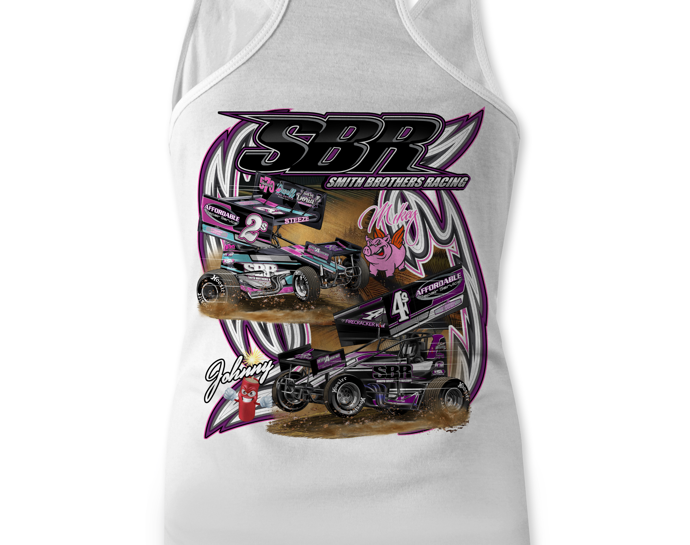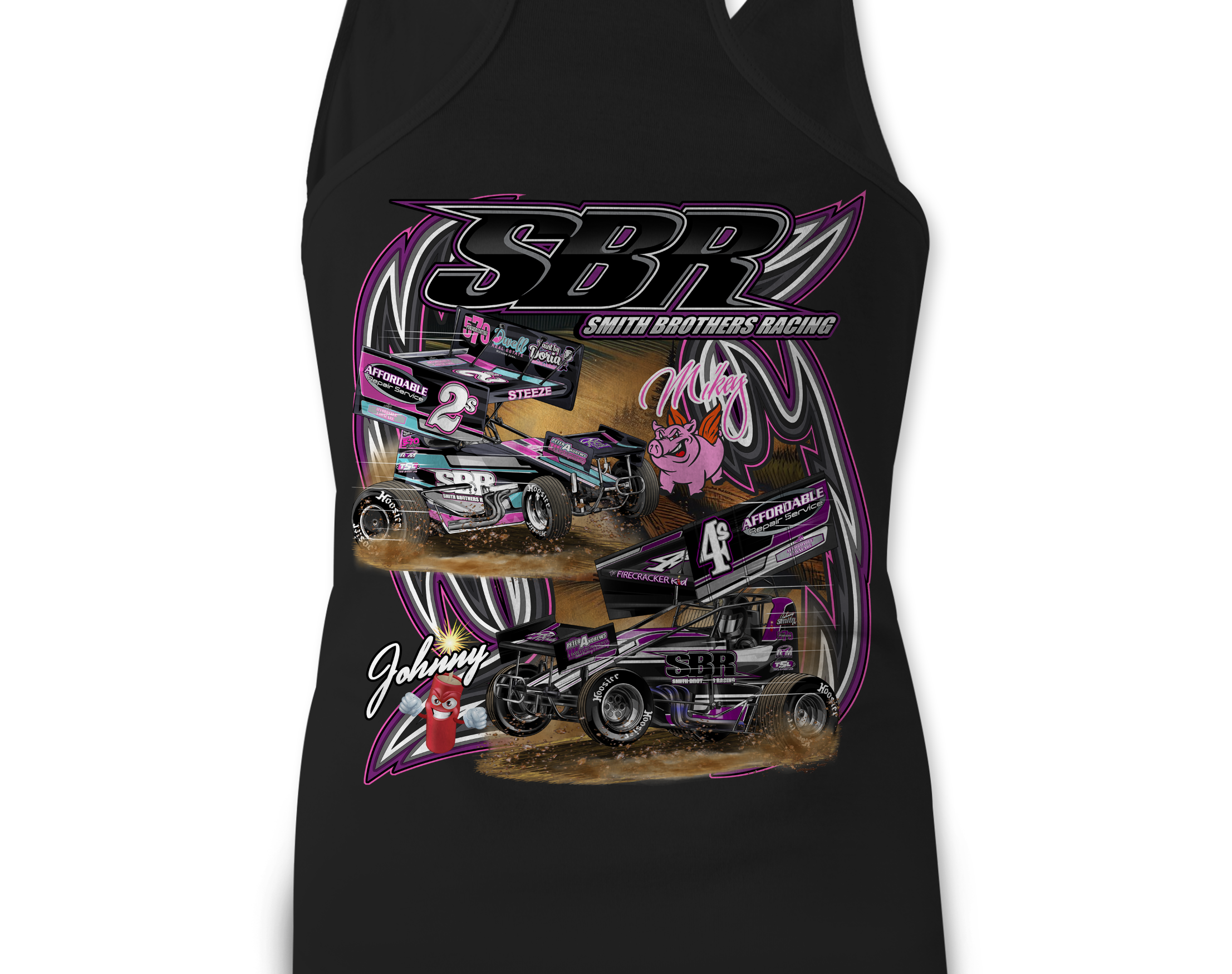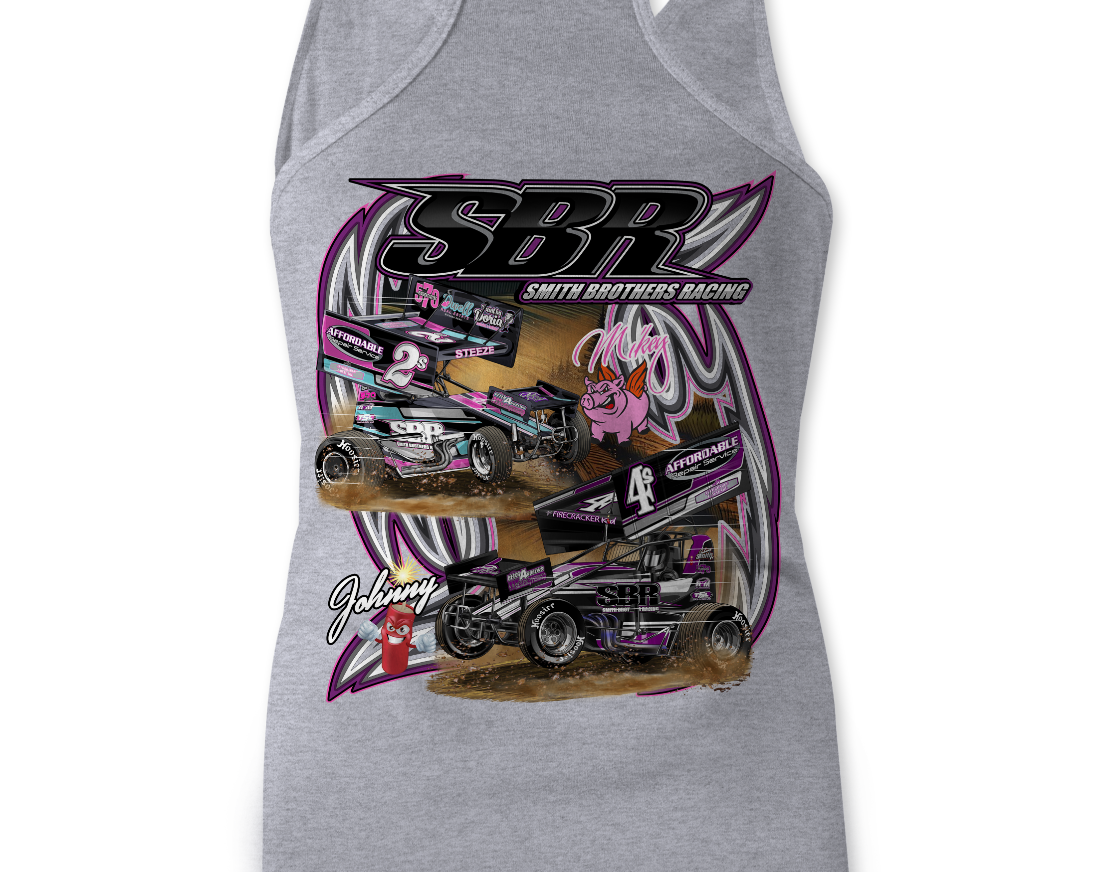 Support Smith Brothers Racing with their custom apparel! Available in Black, Sports Gray and White. Graphics are direct to garment printed with a left chest image and a full back image.