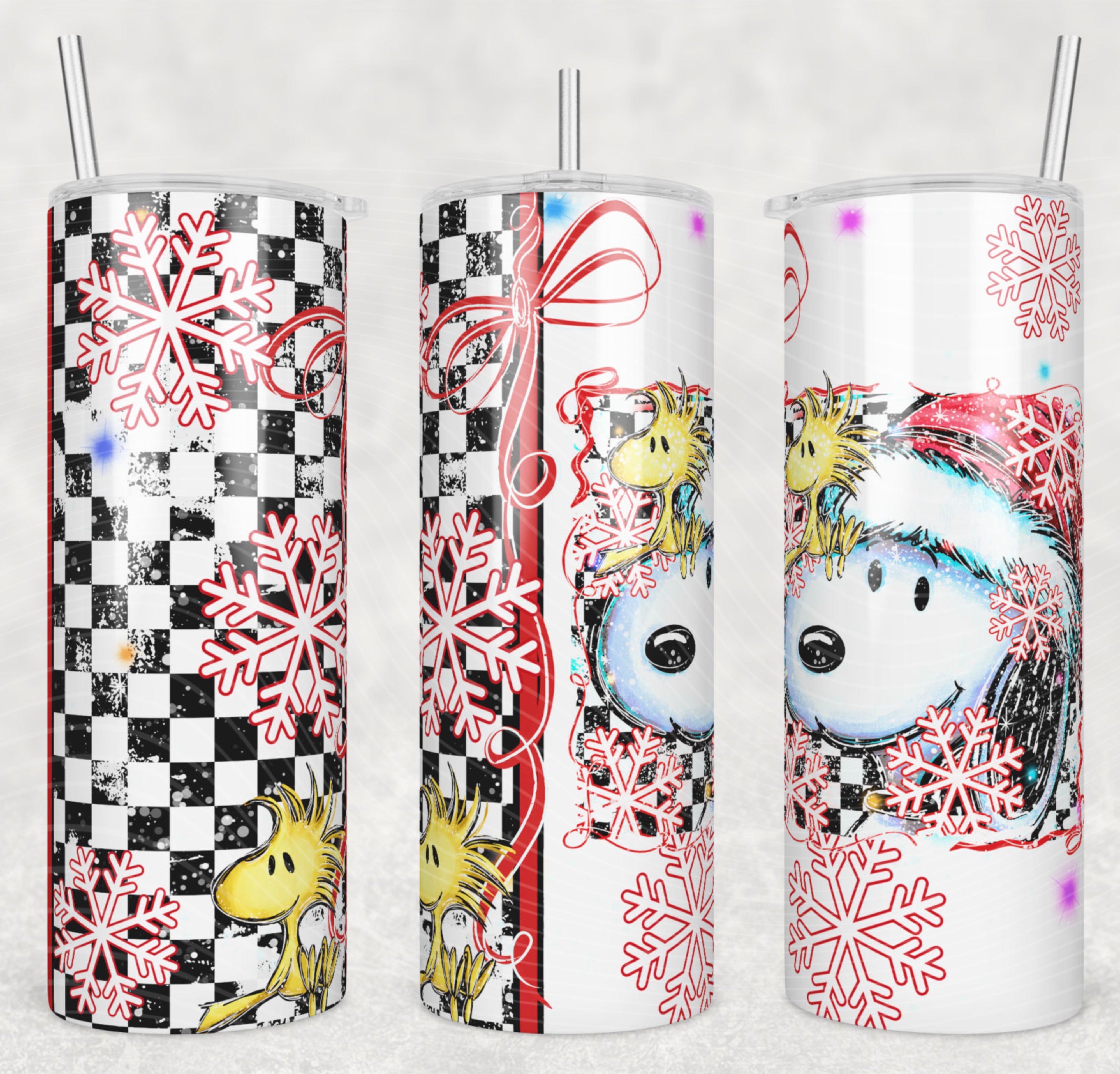 Bring festive charm and bold holiday style to your daily sip with this Christmas skinny tumbler inspired by Snoopy & Woodstock. Featuring a black-and-white grunge checkered pattern, bright red snowflakes, candy stripes, and cozy winter artwork, this tumbler is perfect for fans who love a cute-but-edgy holiday vibe.