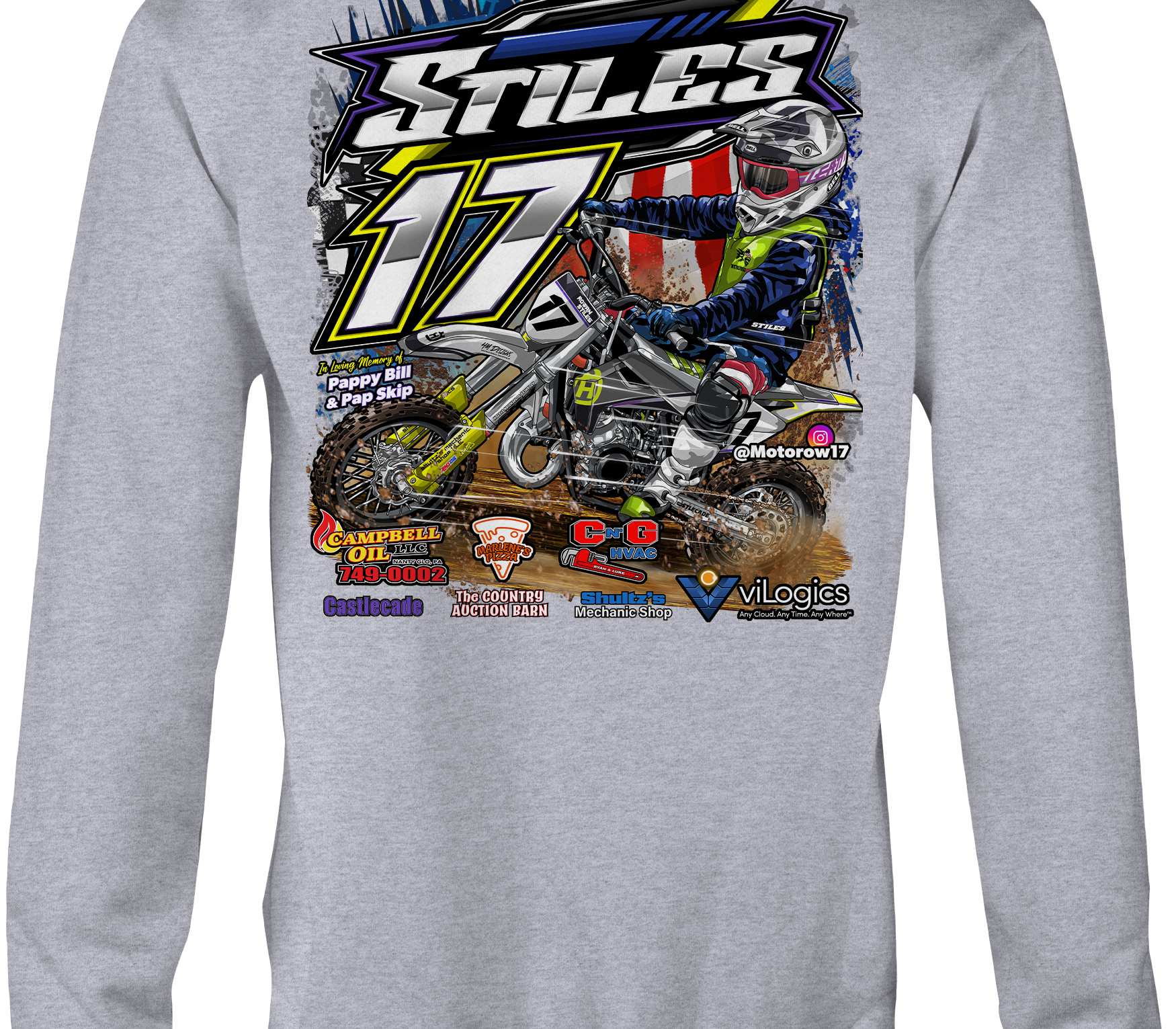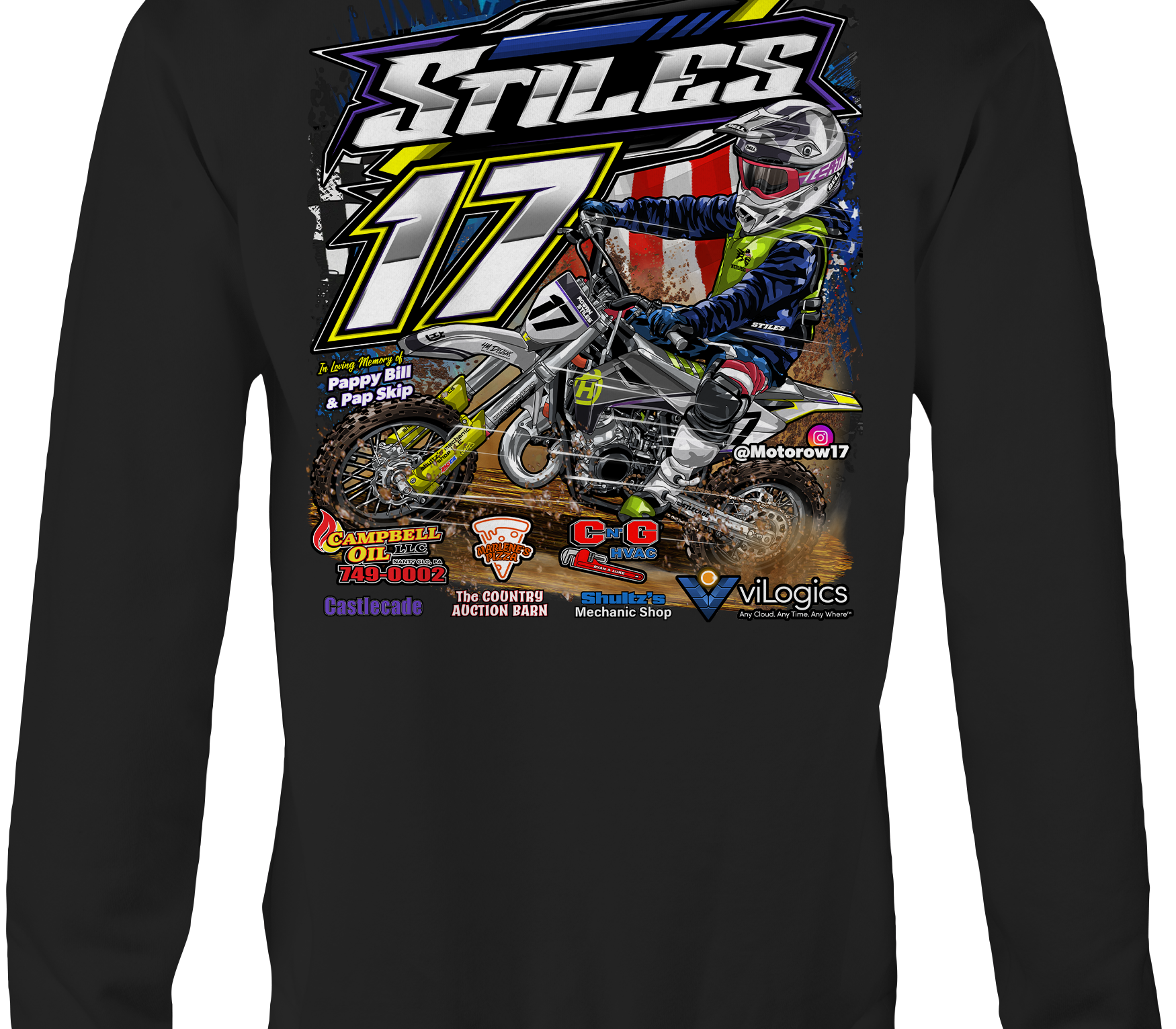 Support Stiles Racing with their custom apparel!  Available in Black, Sports Gray and White. Graphics are direct to garment printed with a left chest image and a full back image.