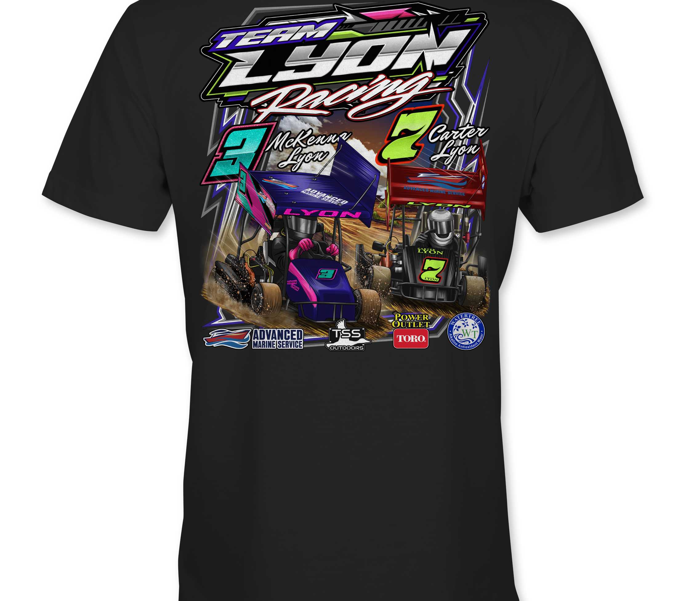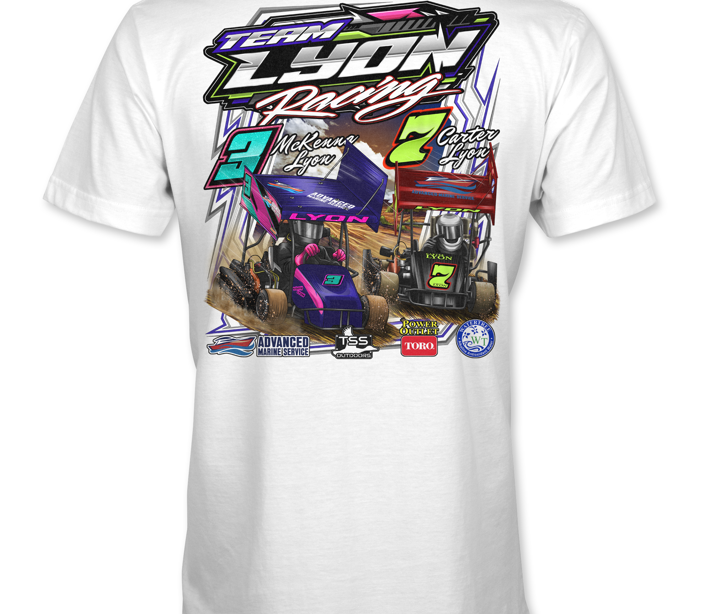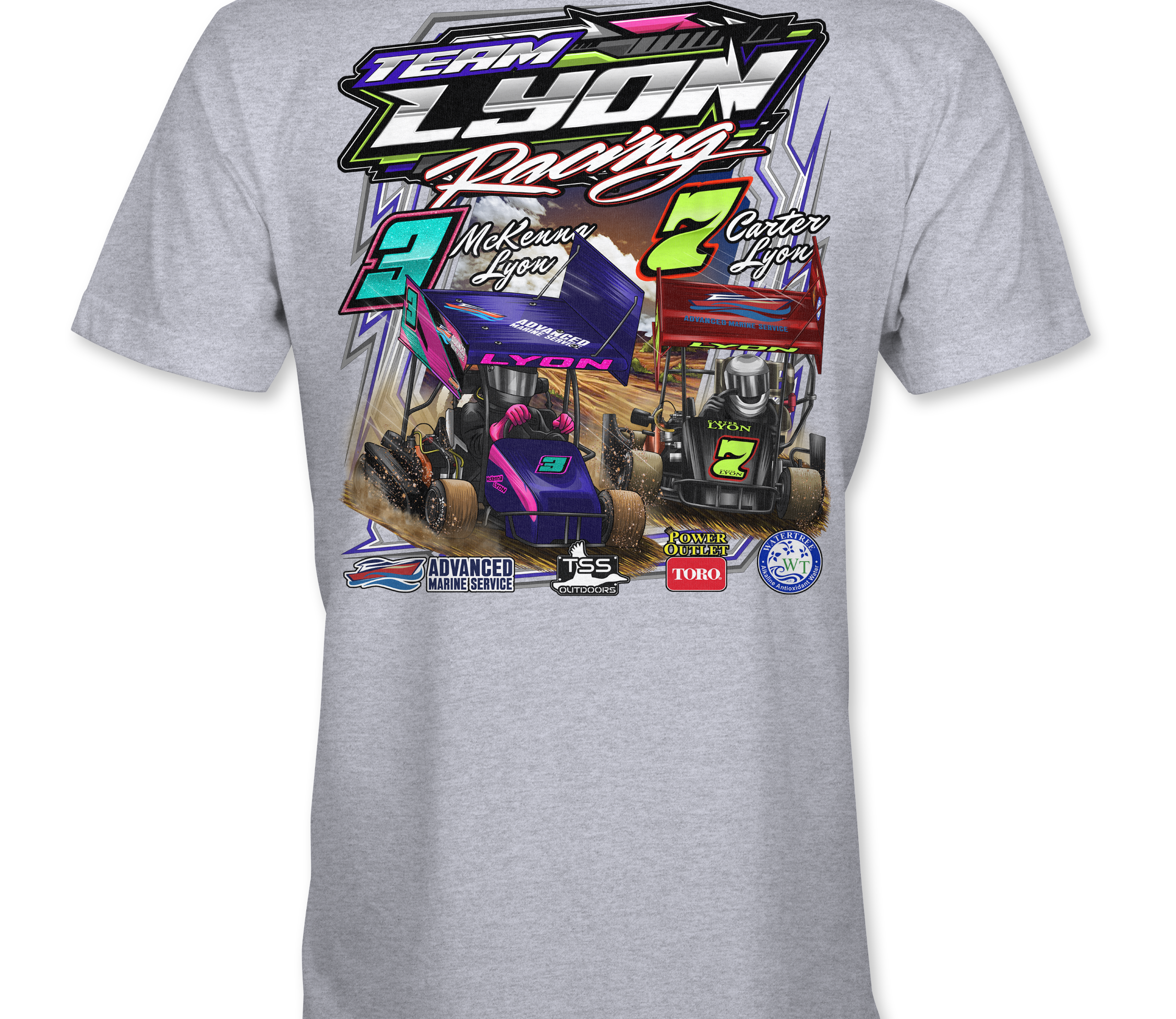 Support Team Lyon Racing 2025 with their custom apparel! Available in Black, Sports Gray and White. Graphics are direct to garment printed with a left chest image and a full back image.