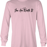 Support The You Are Worth It Movement and their team with their custom apparel! Available in Black. Graphics are direct to garment printed with a left chest image and a full back image.