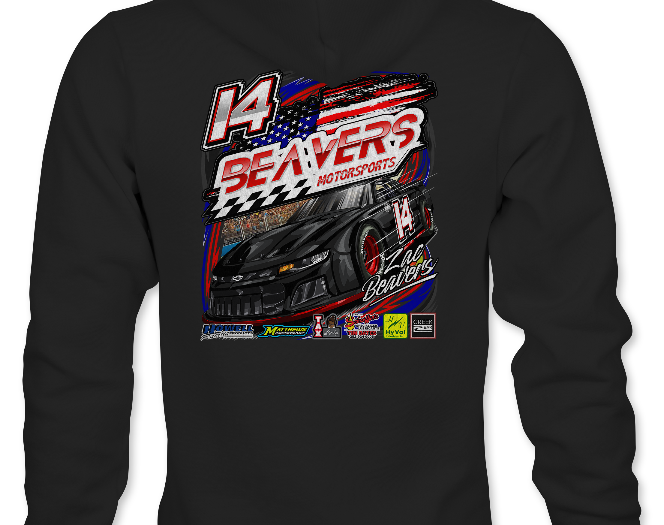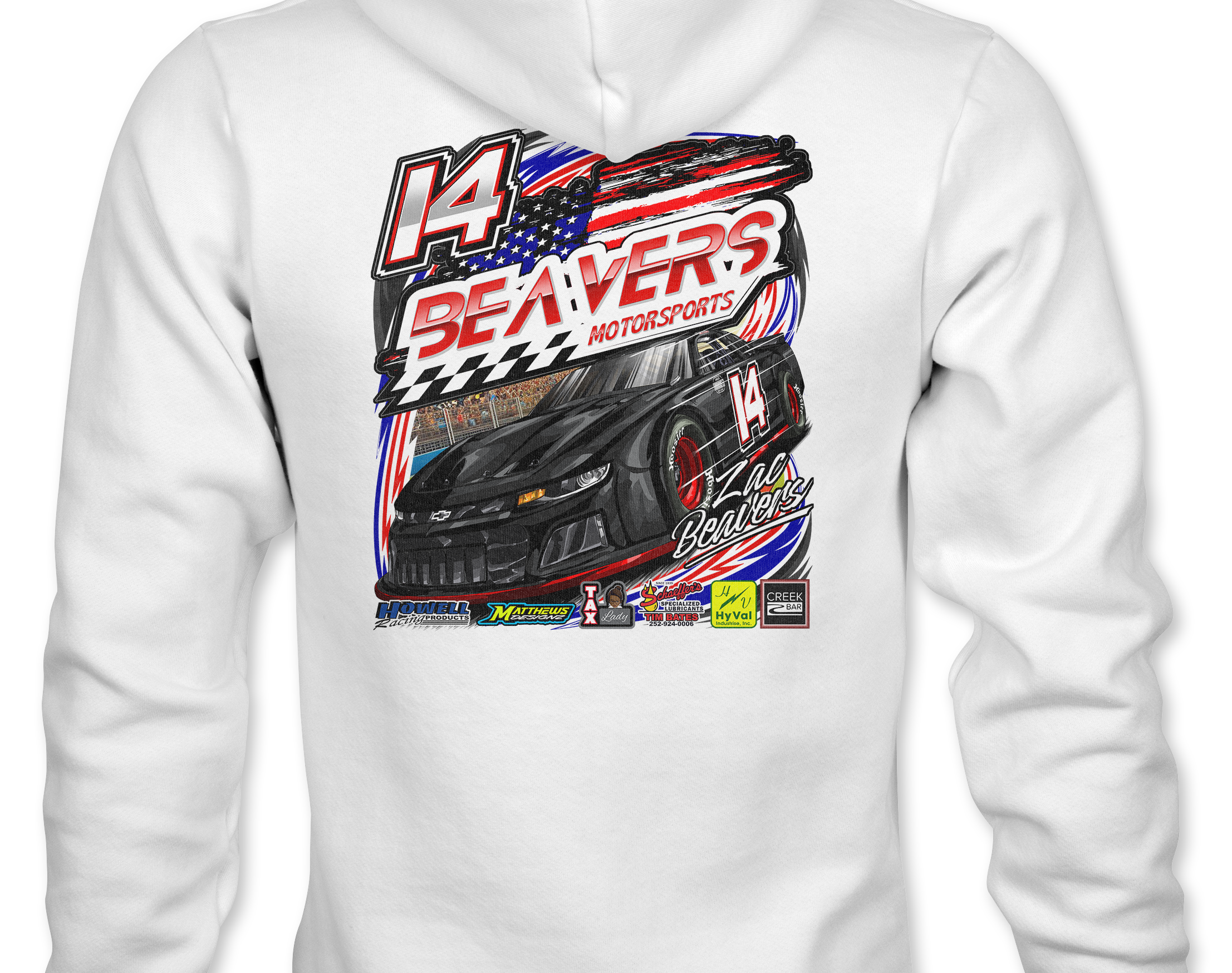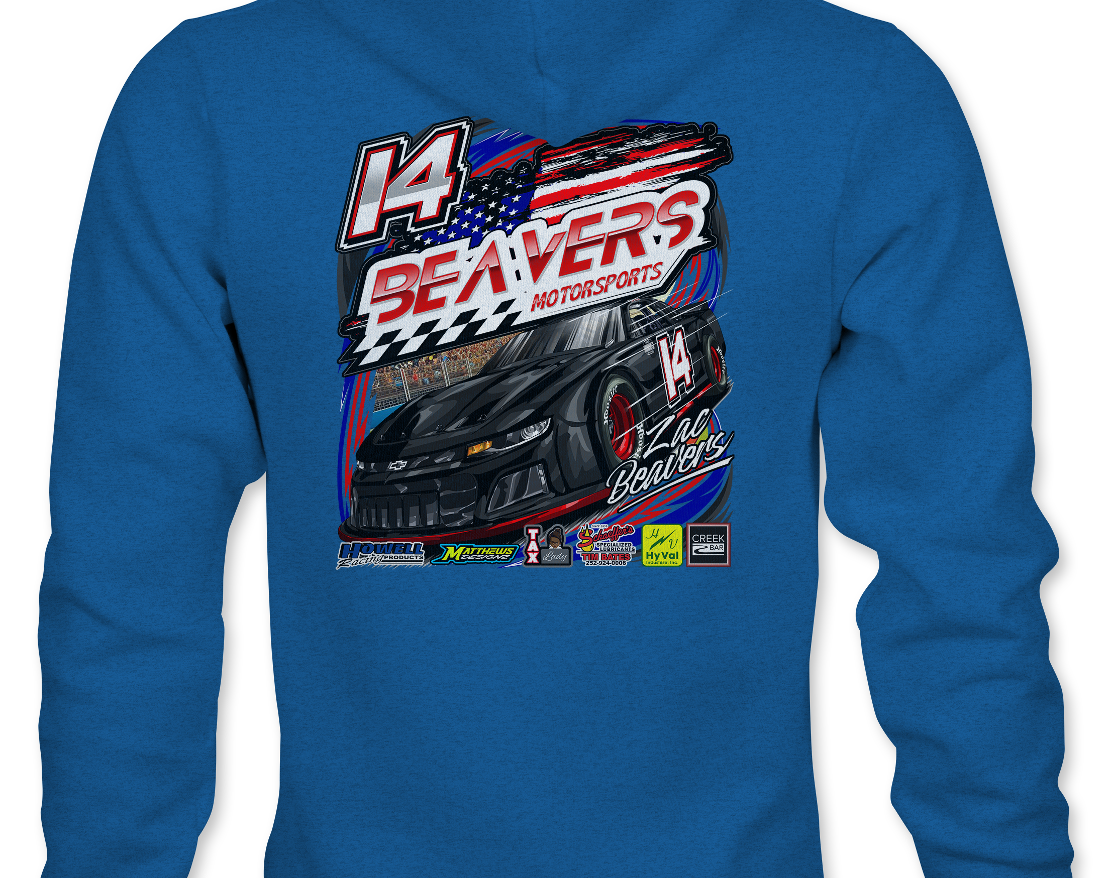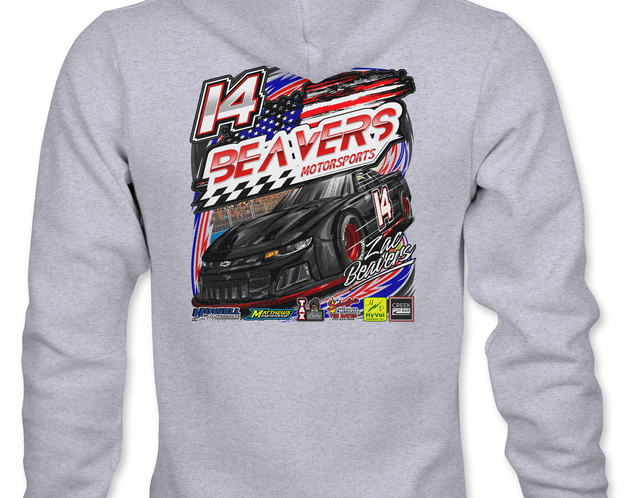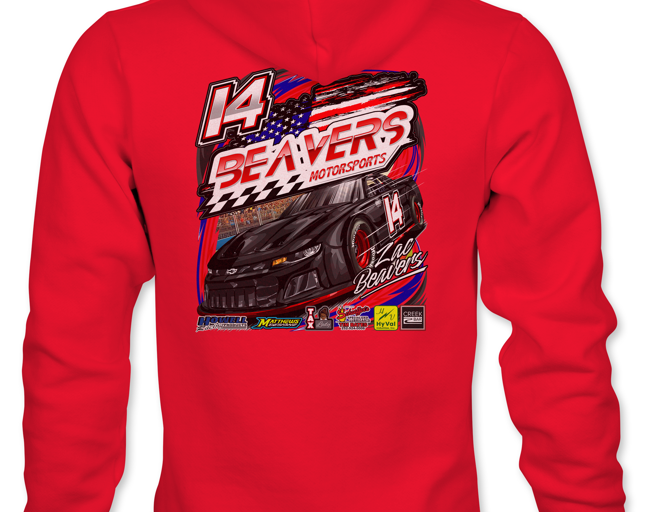 Support Zac Beavers with their custom apparel! Available in Black, Sports Gray, White, Red and Royal Blue.. Graphics are direct to garment printed with a left chest image and a full back image.