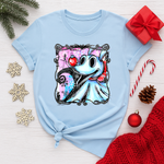 This Zero Christmas tee features Jack’s ghost pup with icy blues, pastel pinks, and grungy Nightmare Before Christmas textures. Printed front-only using vibrant DTF for crisp, boutique-quality color.